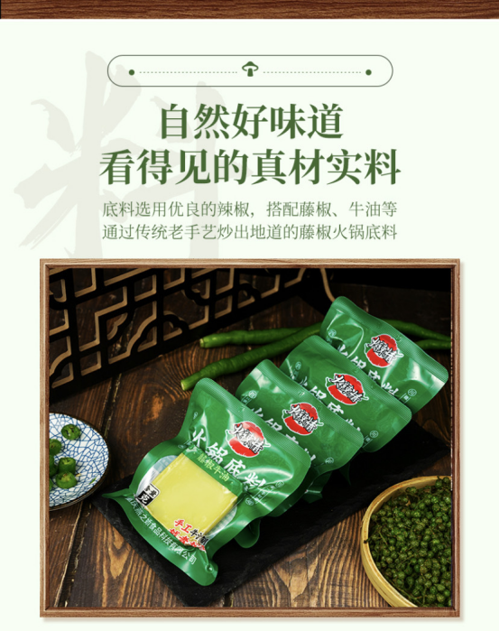 ✅老工艺炒制,正宗巴蜀风味 要说能将藤椒火锅做到极致的非川菜厨师莫属 经传统工艺科学配比、炒制、文火慢熬 使各种原料的自然香味充分融合而成 藤椒的麻、二荆条的辣、牛油的香成就了这浓浓的椒麻鲜香味 是普通的麻辣火锅不具备的独特味道