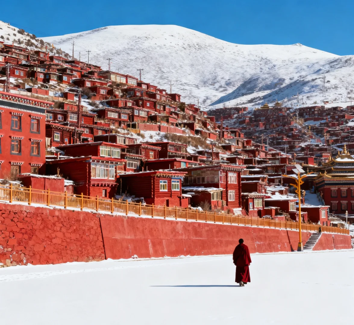 踏入色达的瞬间 密密麻麻的红房子顺着山坡层叠铺展