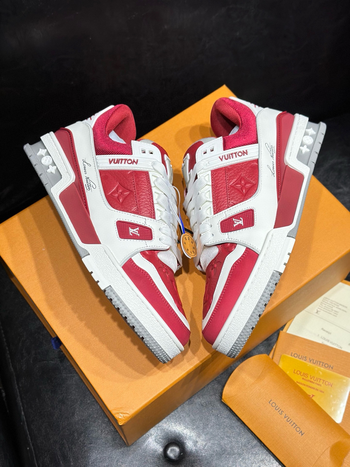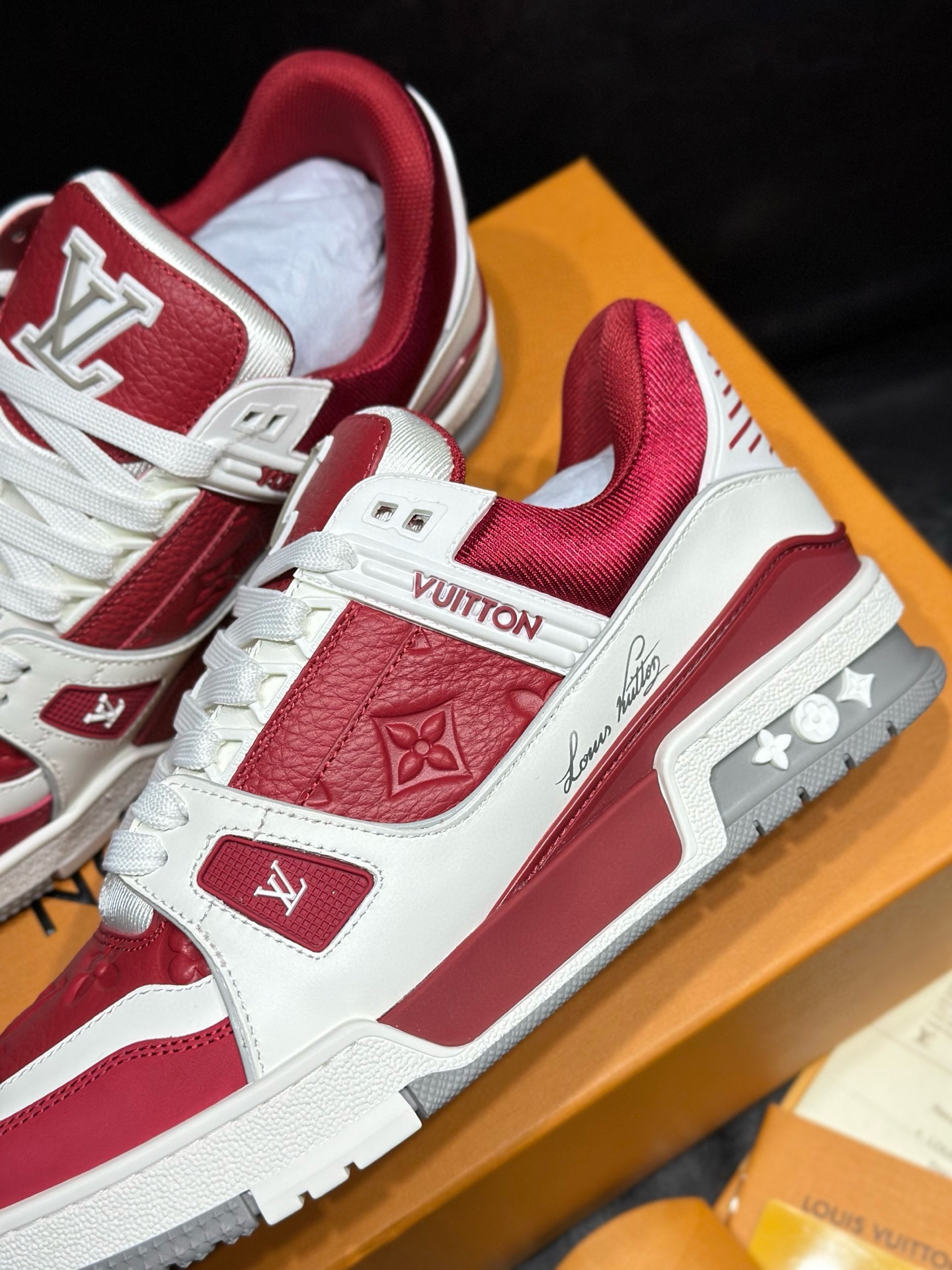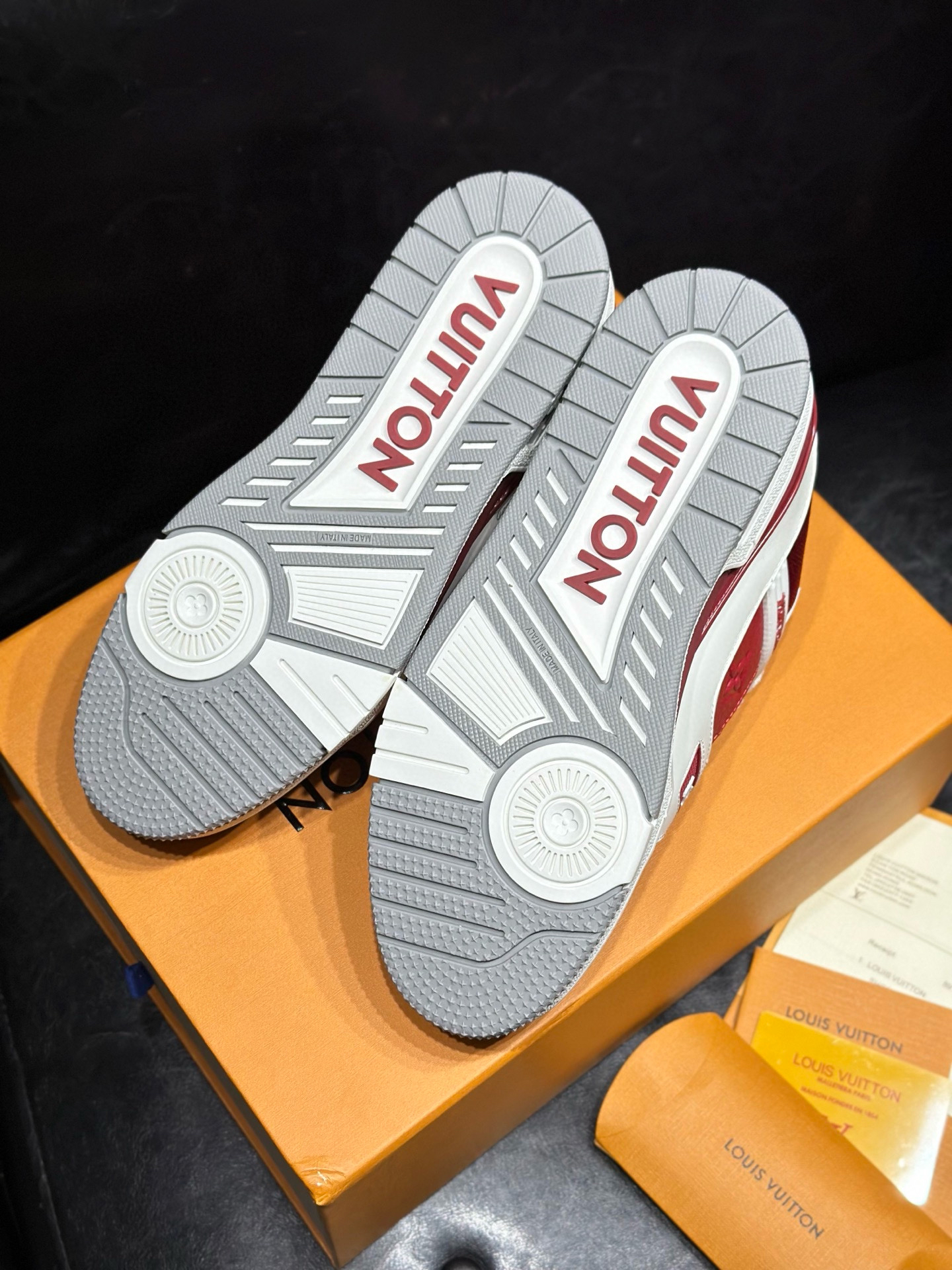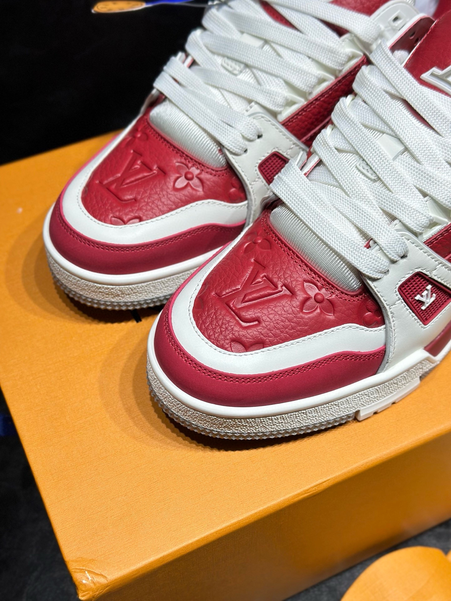夏季特惠💰630 LV公司级 路易威登 trainer 走秀新款经典走秀新款。空胶工艺,原版一比一开发,上脚非常舒适。奢侈用料,做工精细,鞋面由意大利进口小牛皮拼接,侧边饰有品牌LOGO标志及签名,最新乳胶垫脚+网布内里,脚感超舒适。原厂特供原版双色TPU组合大底。套包工艺,固特异缝合锁边。