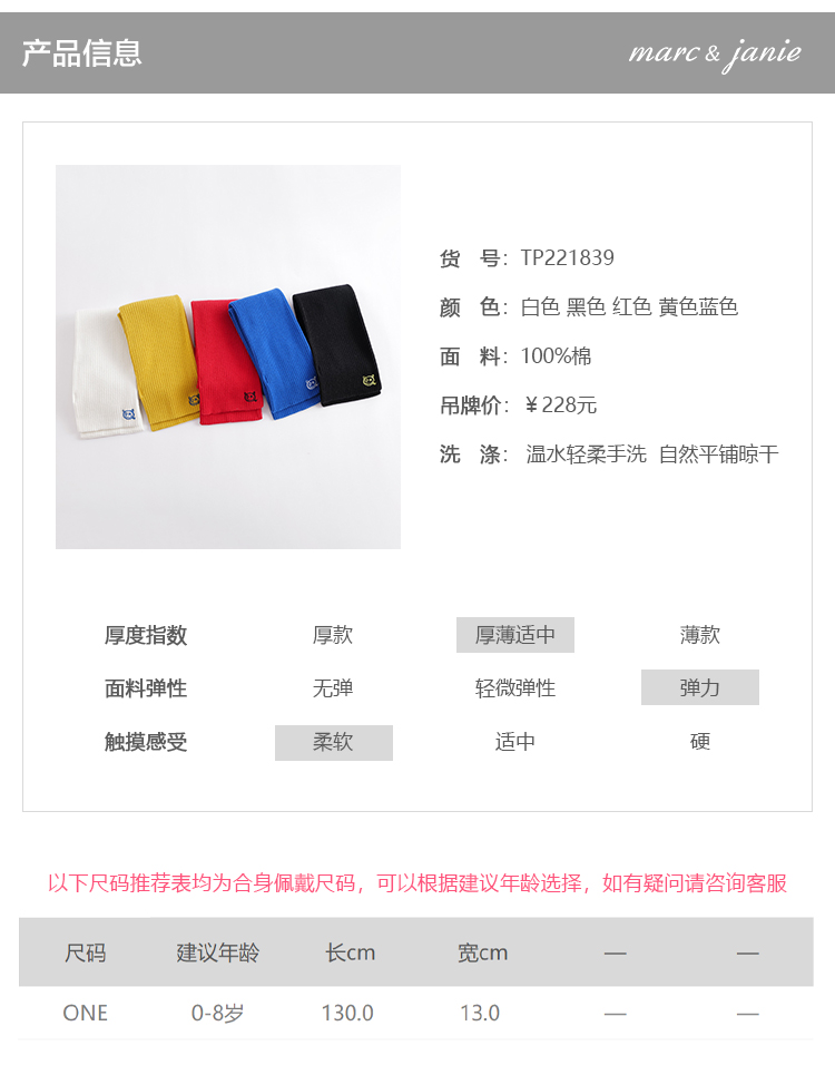 马克珍妮秋冬新款 男女童纯棉绣花针织围巾221839