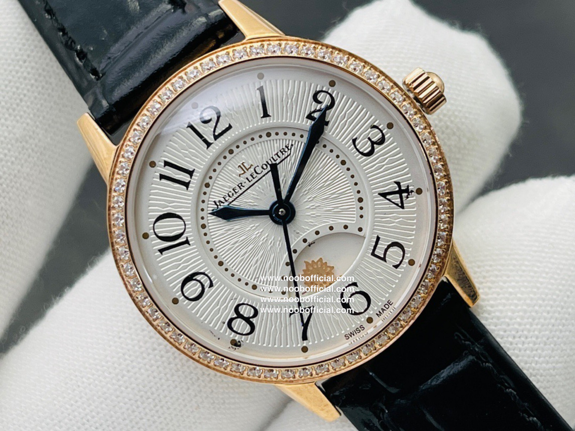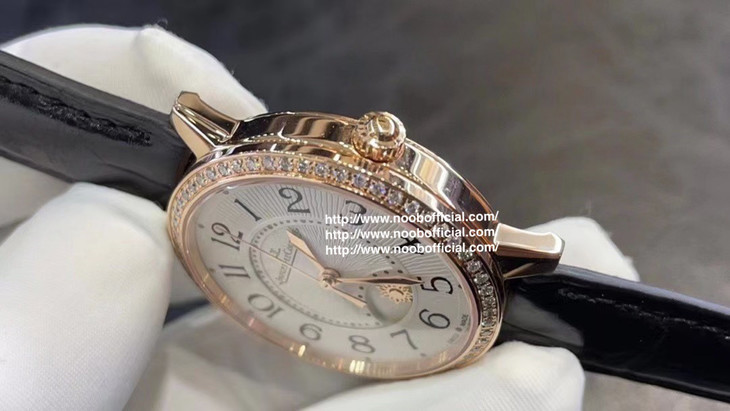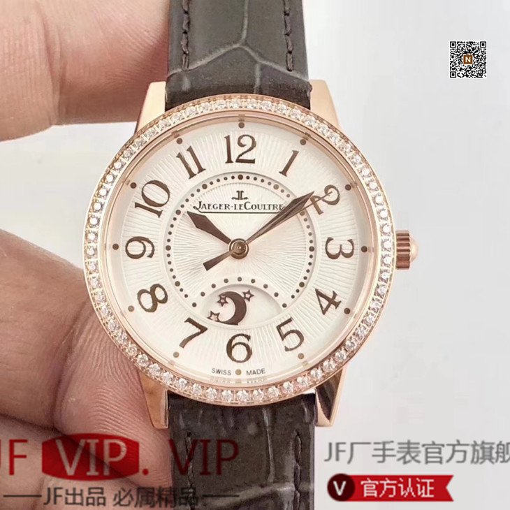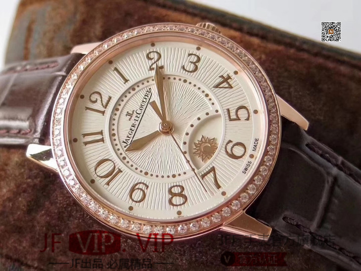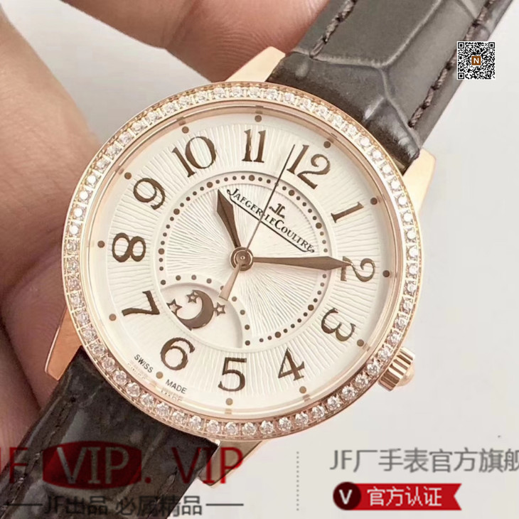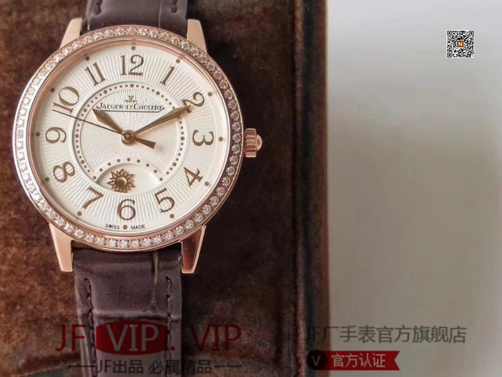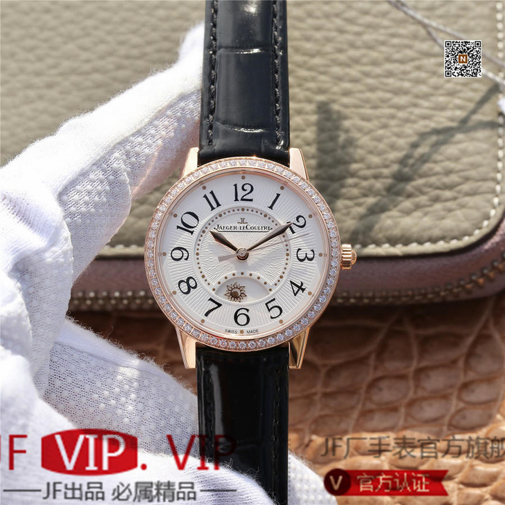 ZF积家约会系列腕表浪漫登场, ,简约淑女,尽显浪漫情怀。【表壳】腕表尺寸34mmX8.8mm。简约干练的外壳打磨精细,ZF原装开模 外壳版型。确保打磨工艺吻合,质感同步正品。表圈一共镶有60颗顶级施华洛世奇美钻共重0.69 克拉。镶工严谨,还原正品最美风采。【技术突破】采用9015改积家自产CAL.898A/1机芯,完美实现原装白昼黑夜变换功能。走时稳定,素质坚挺。【表带 扣】意大利小牛皮轻便透气,质感上佳,搭配积家经典折叠表扣。