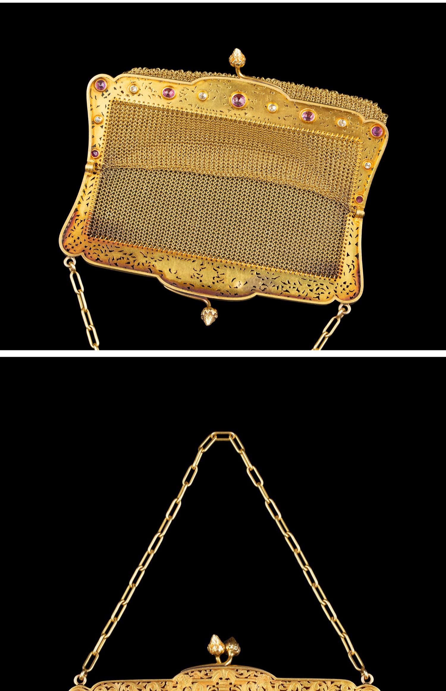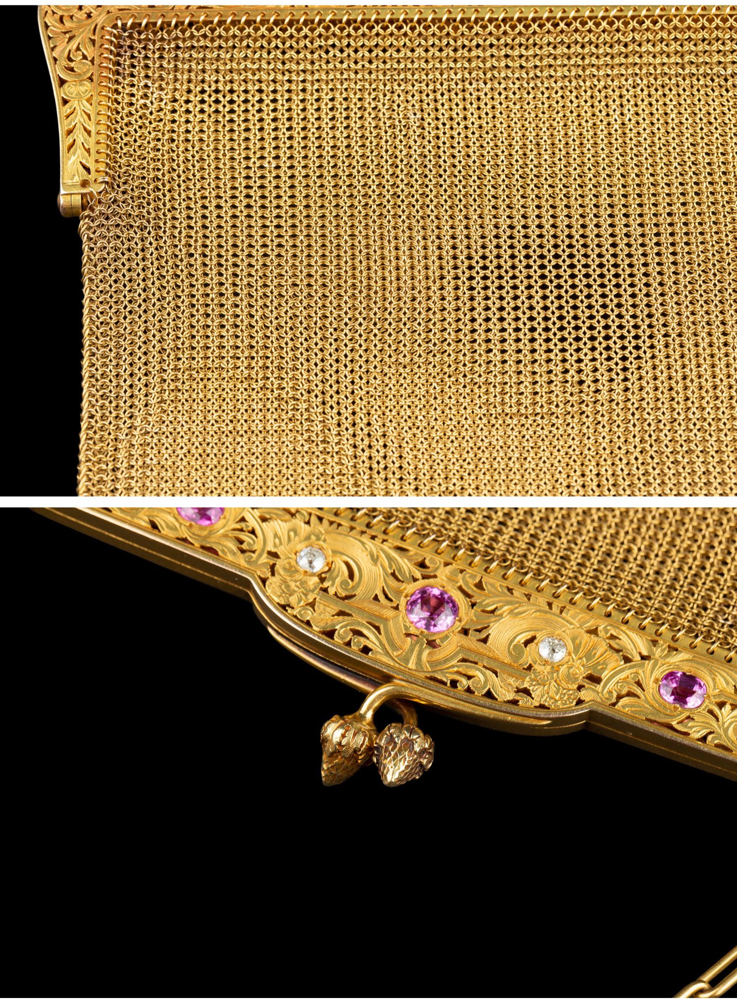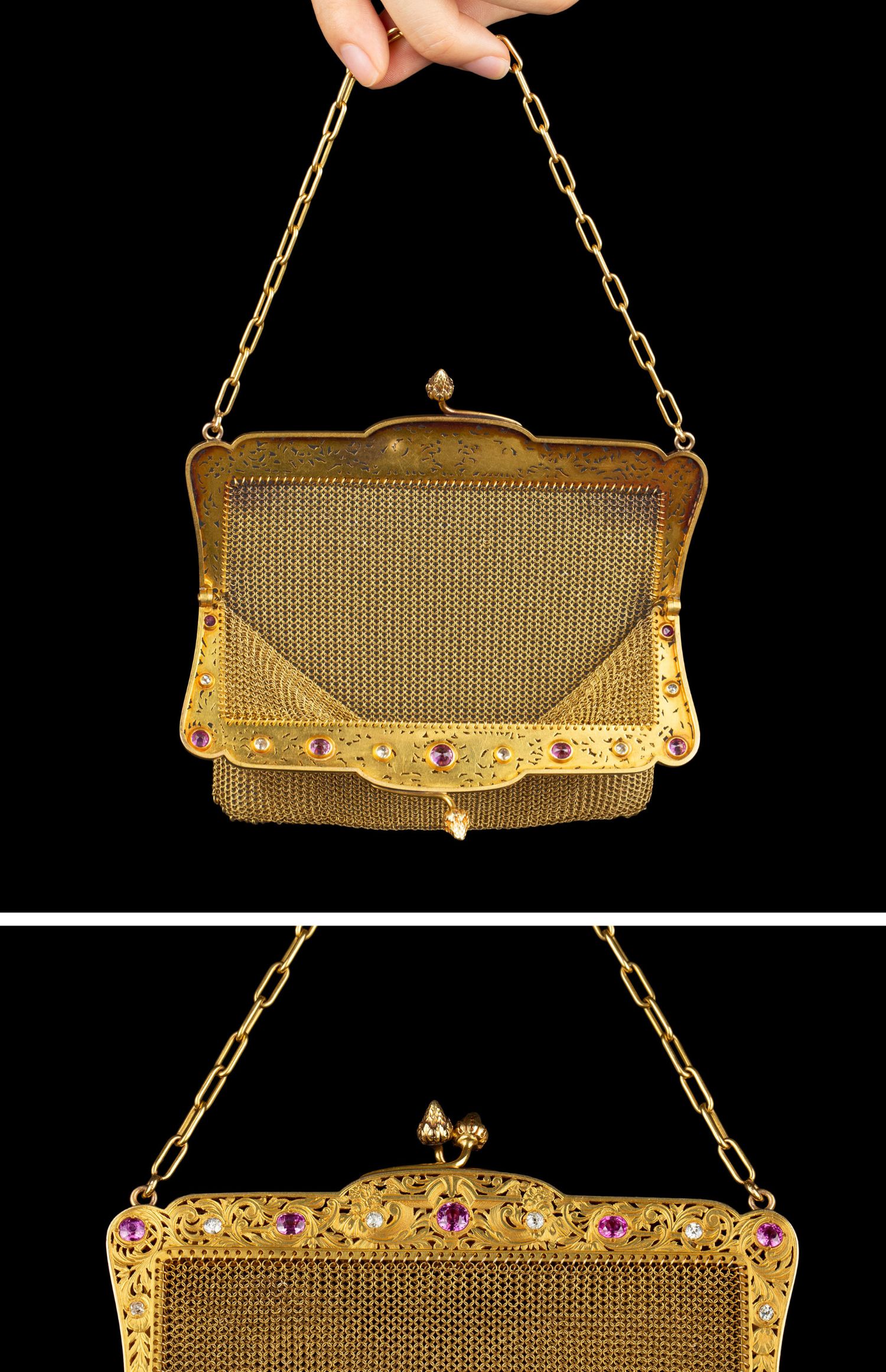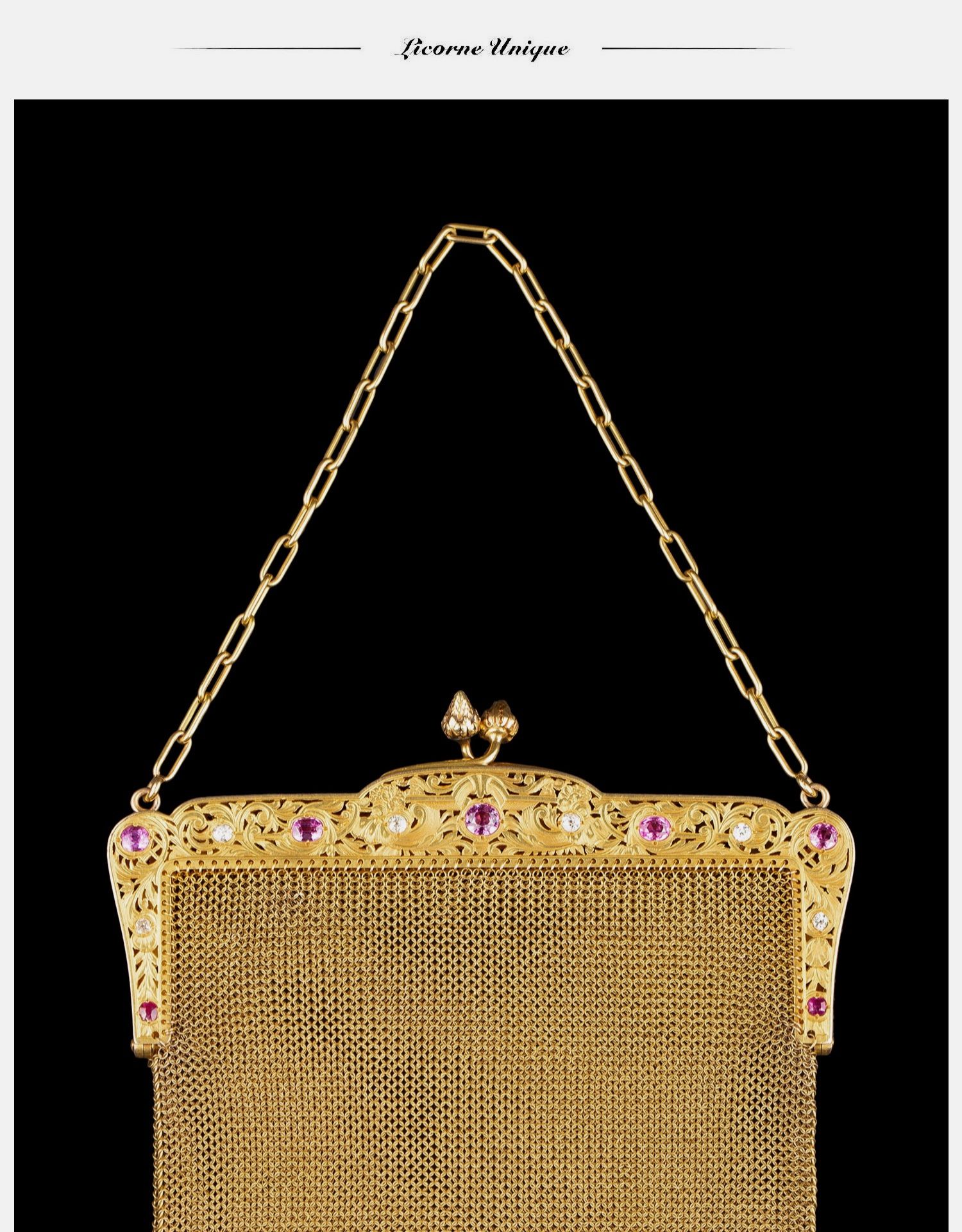 独角鹿西洋古董法国18K黄金镶嵌钻石粉色蓝宝石网状编织晚宴包