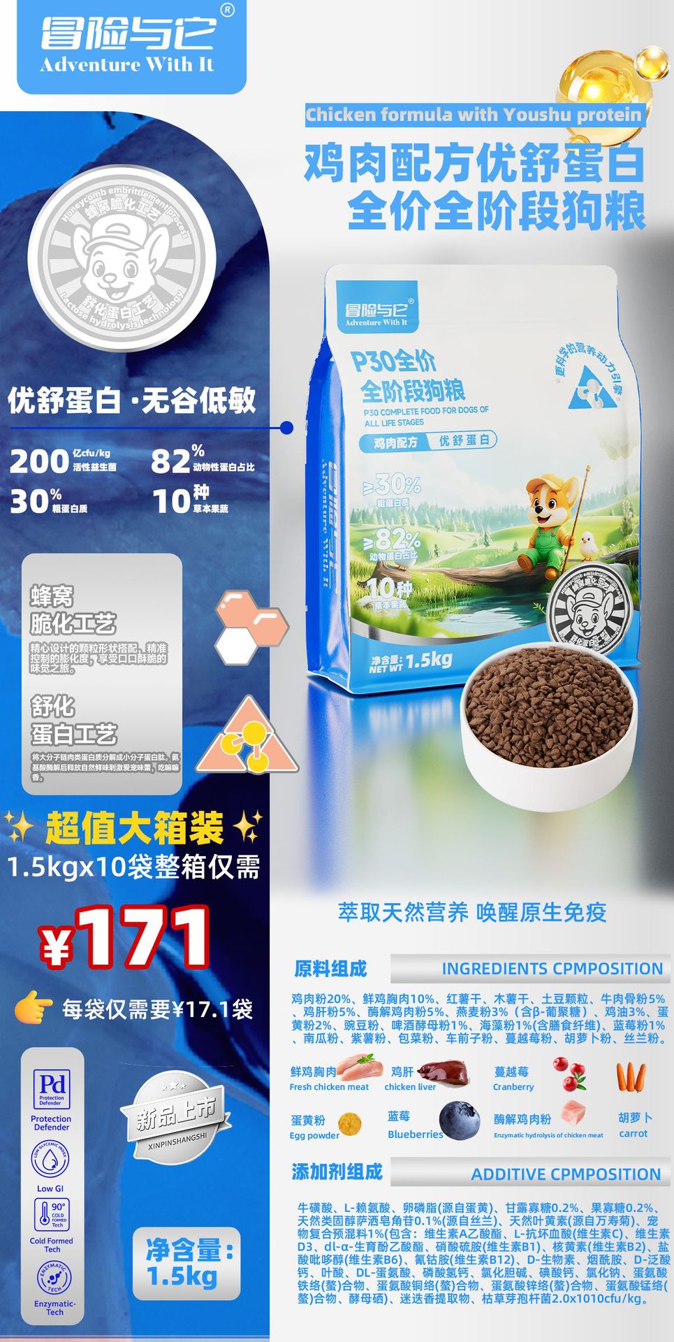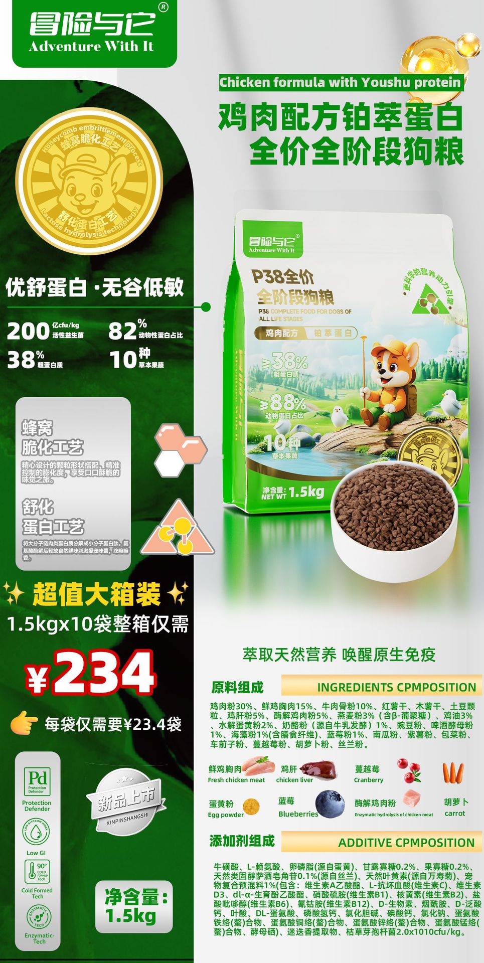 冒险与它P系列主粮犬粮 低敏鸡肉配方 38%蛋白质 自有工厂 现货速发