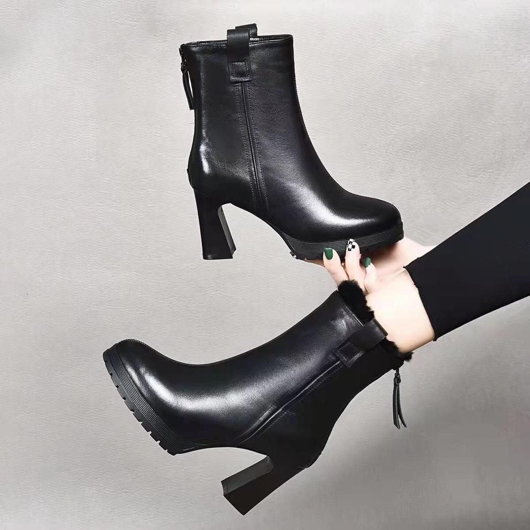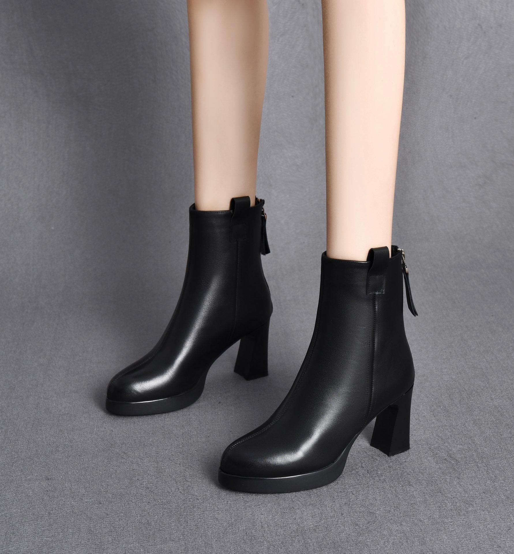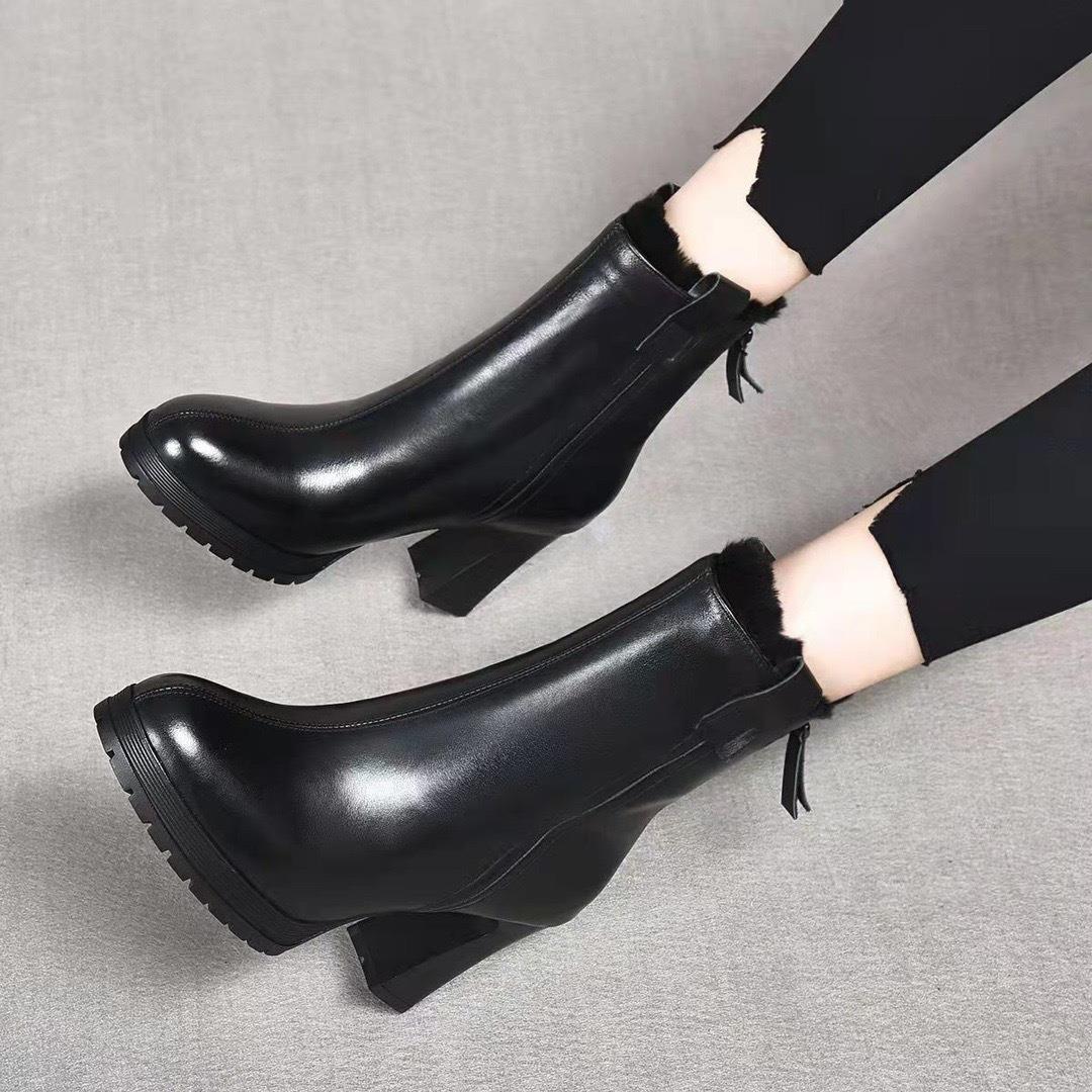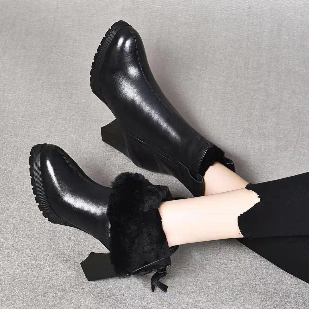 真皮气质中跟小短靴2025年秋冬新款加绒粗跟软底百搭高跟鞋女皮鞋