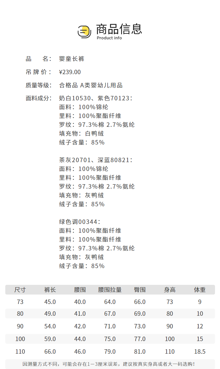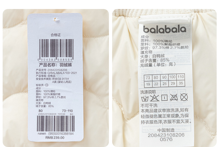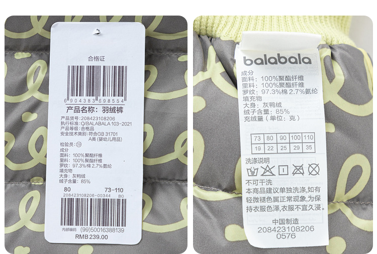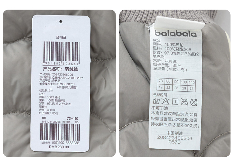 巴拉巴拉儿童羽绒裤男童长裤女童裤子新款保暖裤高腰护肚加厚