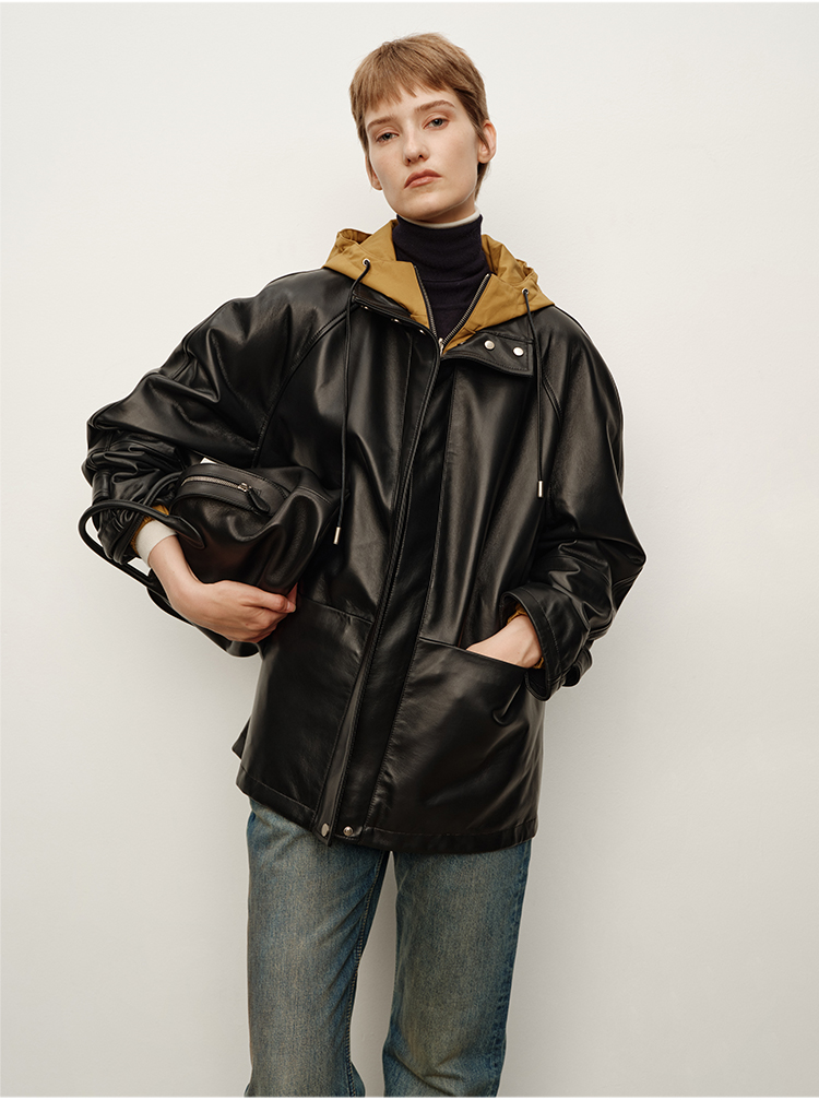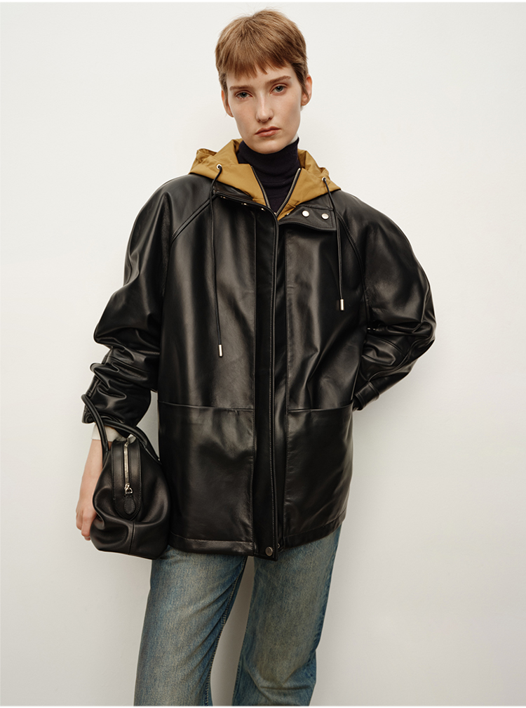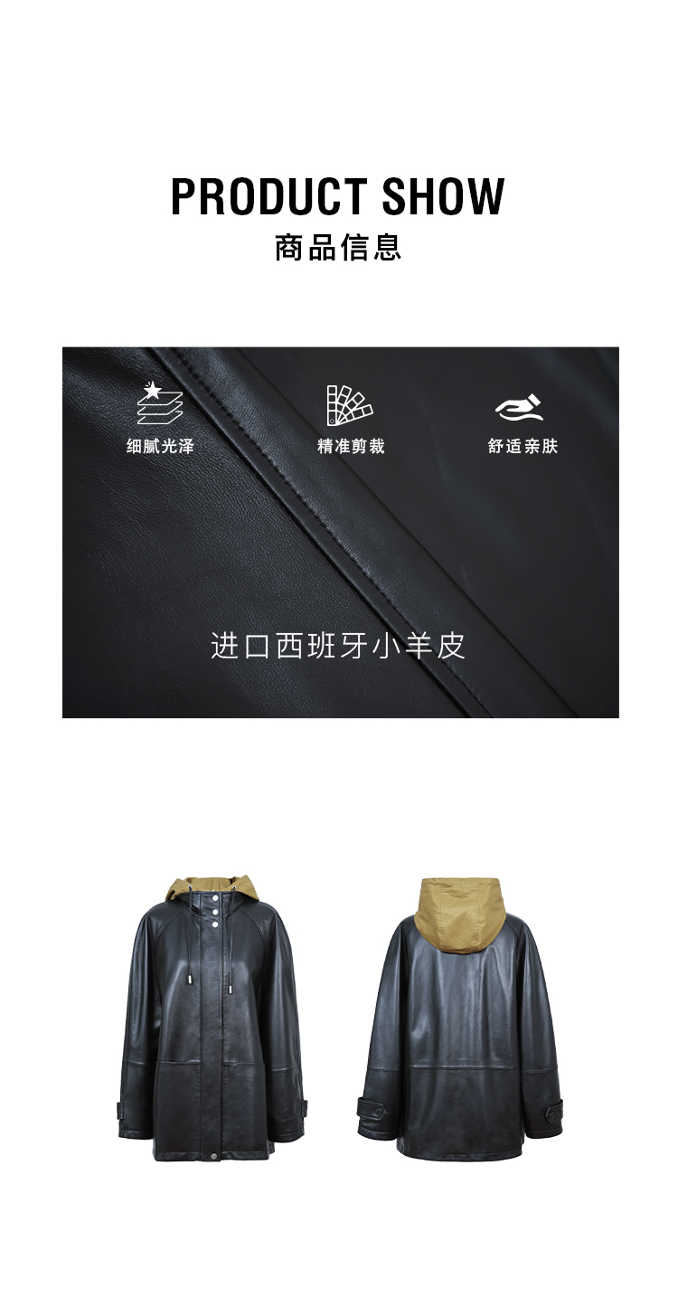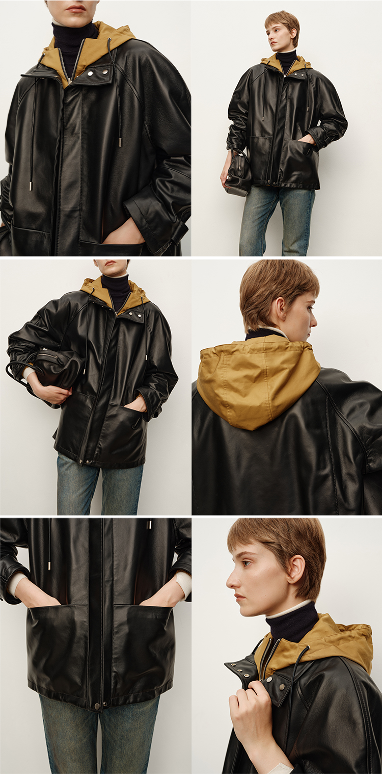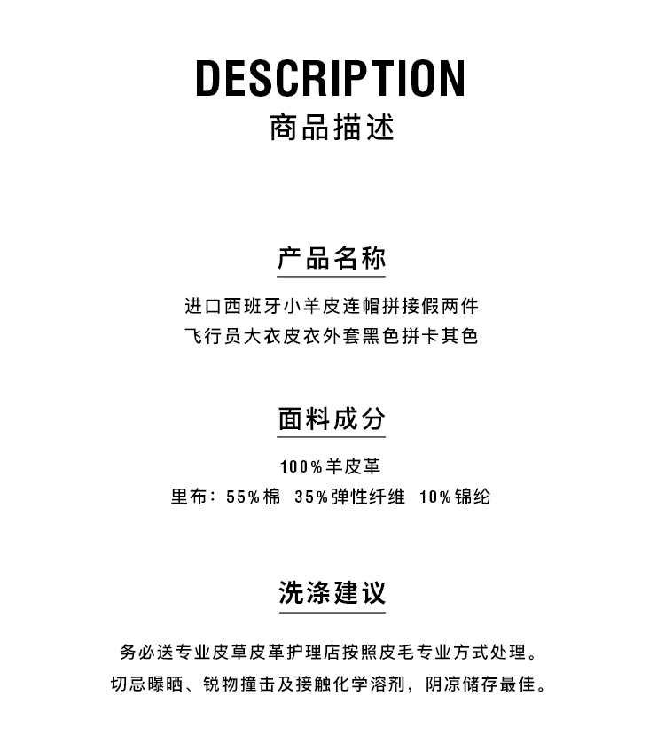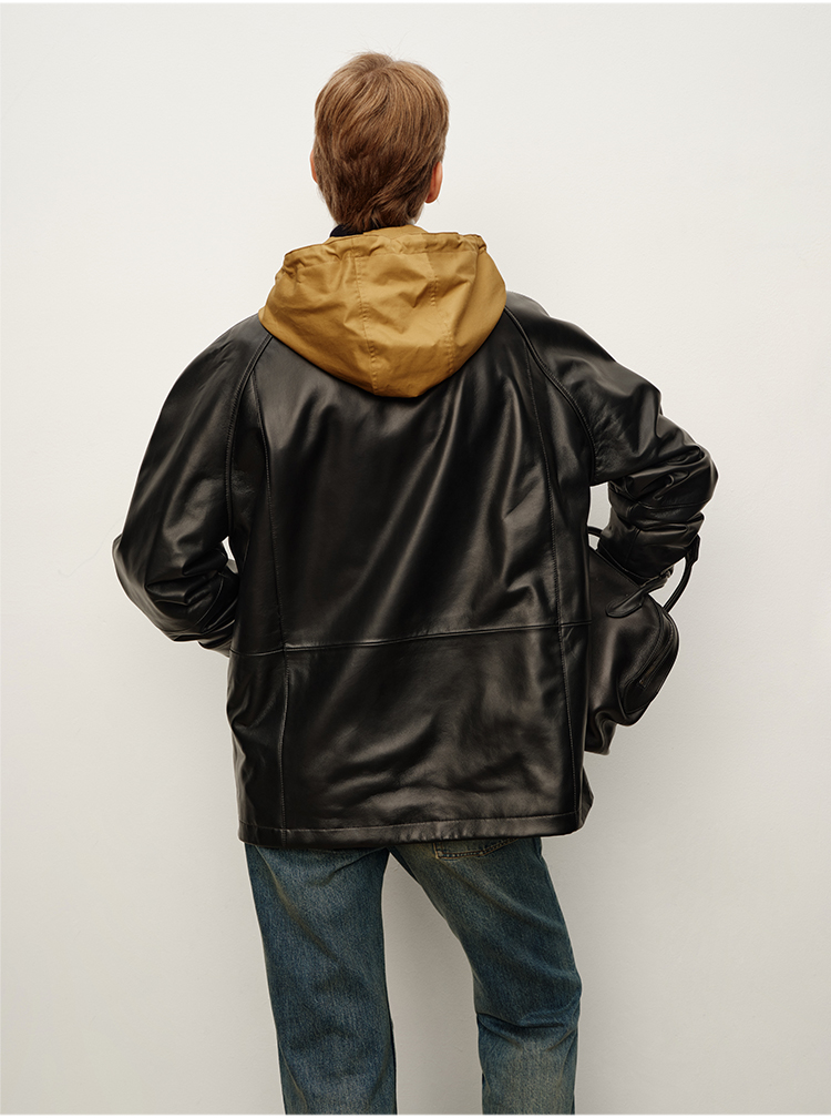 HIDEMI 进口西班牙小羊皮连帽拼接假两件飞行员大衣皮衣外套 黑色拼卡其色