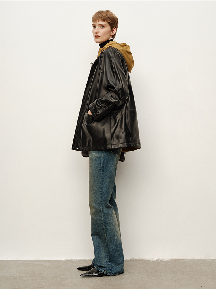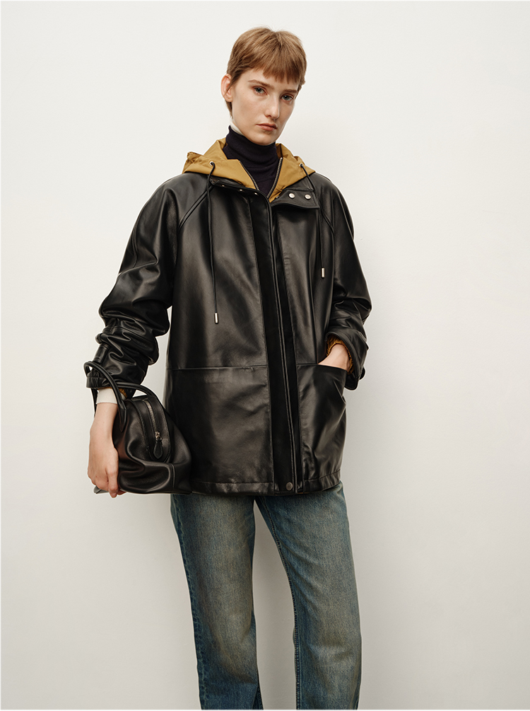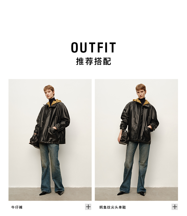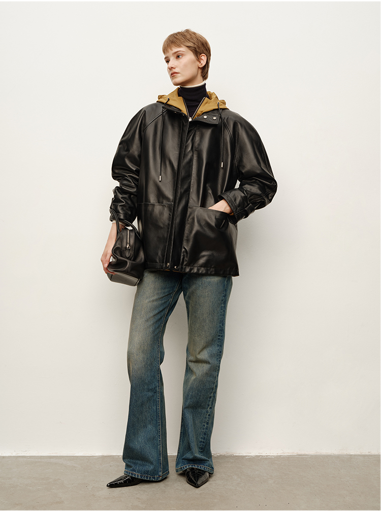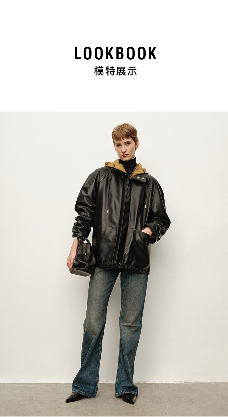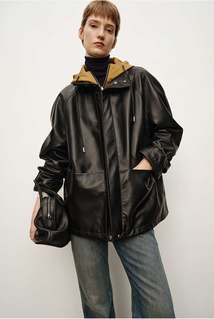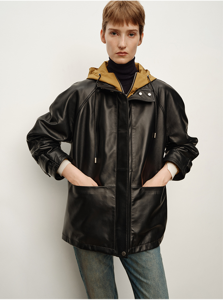 HIDEMI 进口西班牙小羊皮连帽拼接假两件飞行员大衣皮衣外套 黑色拼卡其色