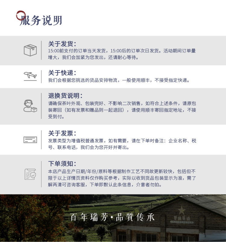 - 武夷瑞芳茶號,創建於一八九九年,由江氏制茶泰斗,江泰源先生於武夷山原崇安縣碼頭創辦,爲清末著名茶坊,在当地地方志中會記載,飮武夷山茶,瑞芳上品也。