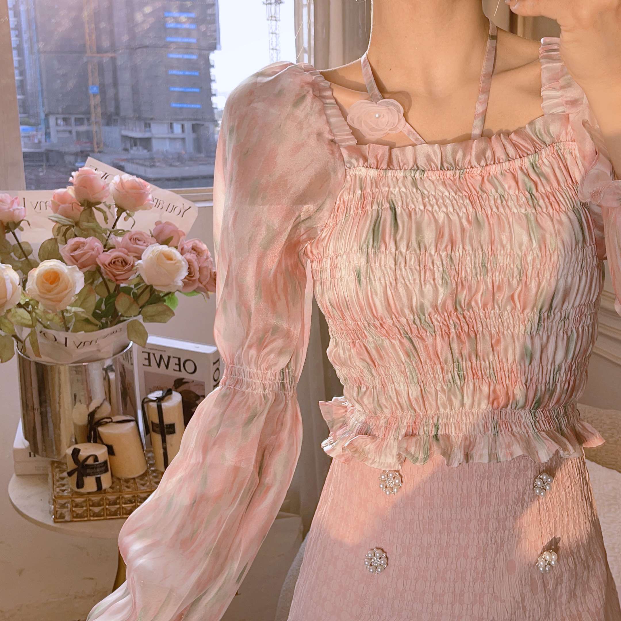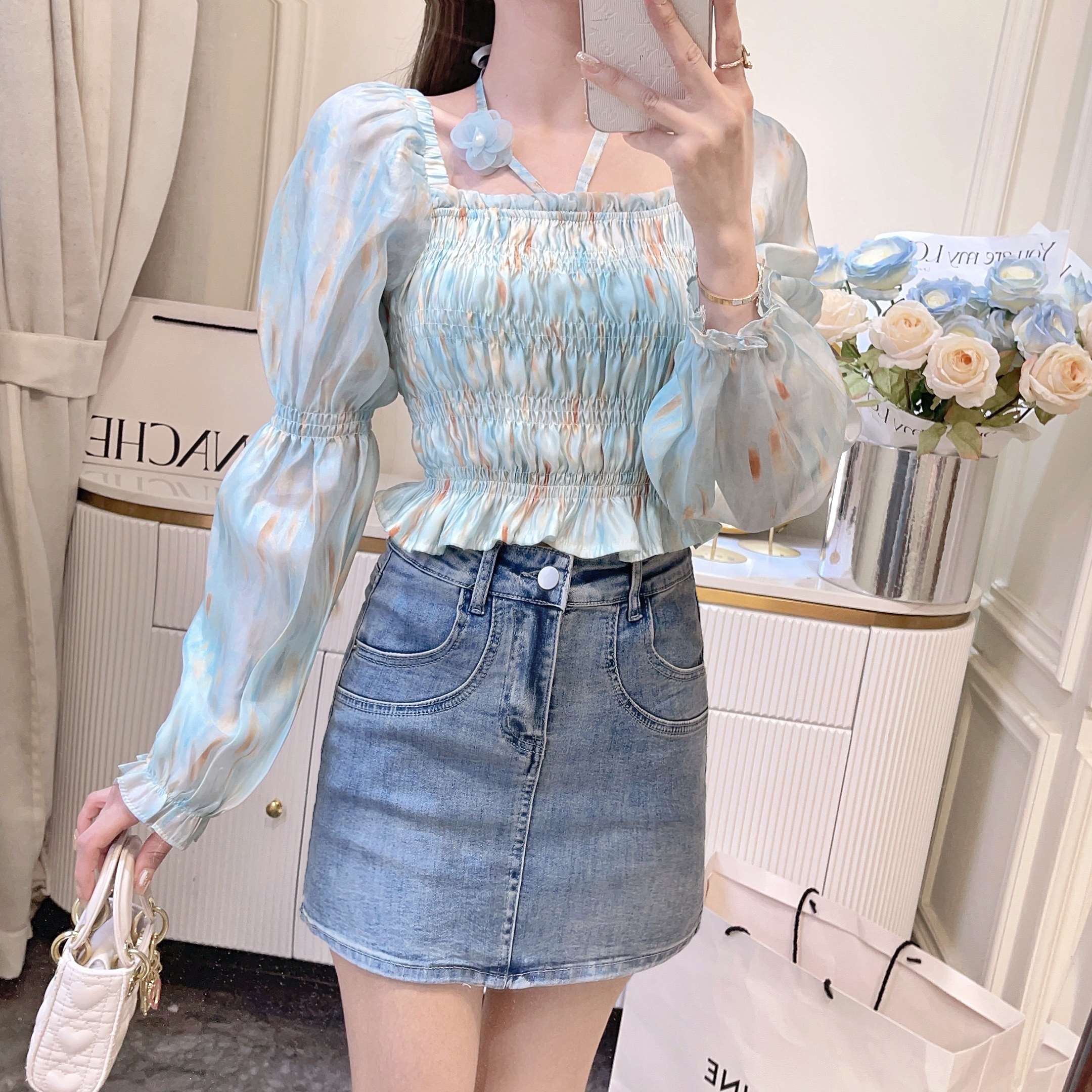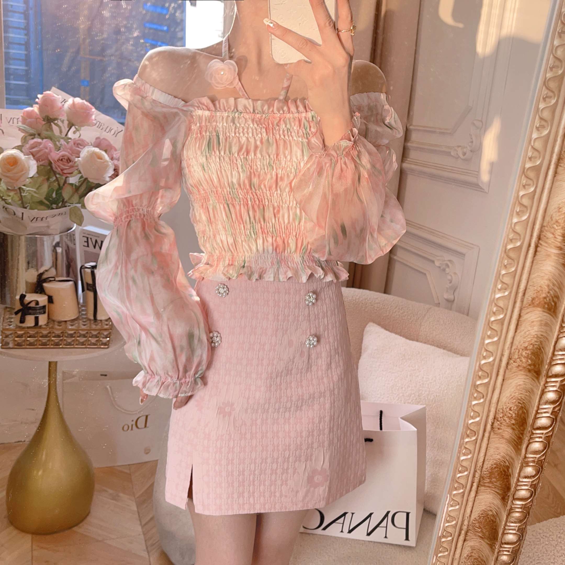 张心子【梵高油画】法式温柔风设计感长袖雪纺衫女2023夏新款上衣 U2303004