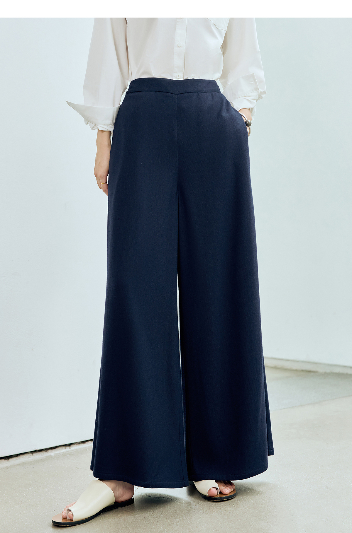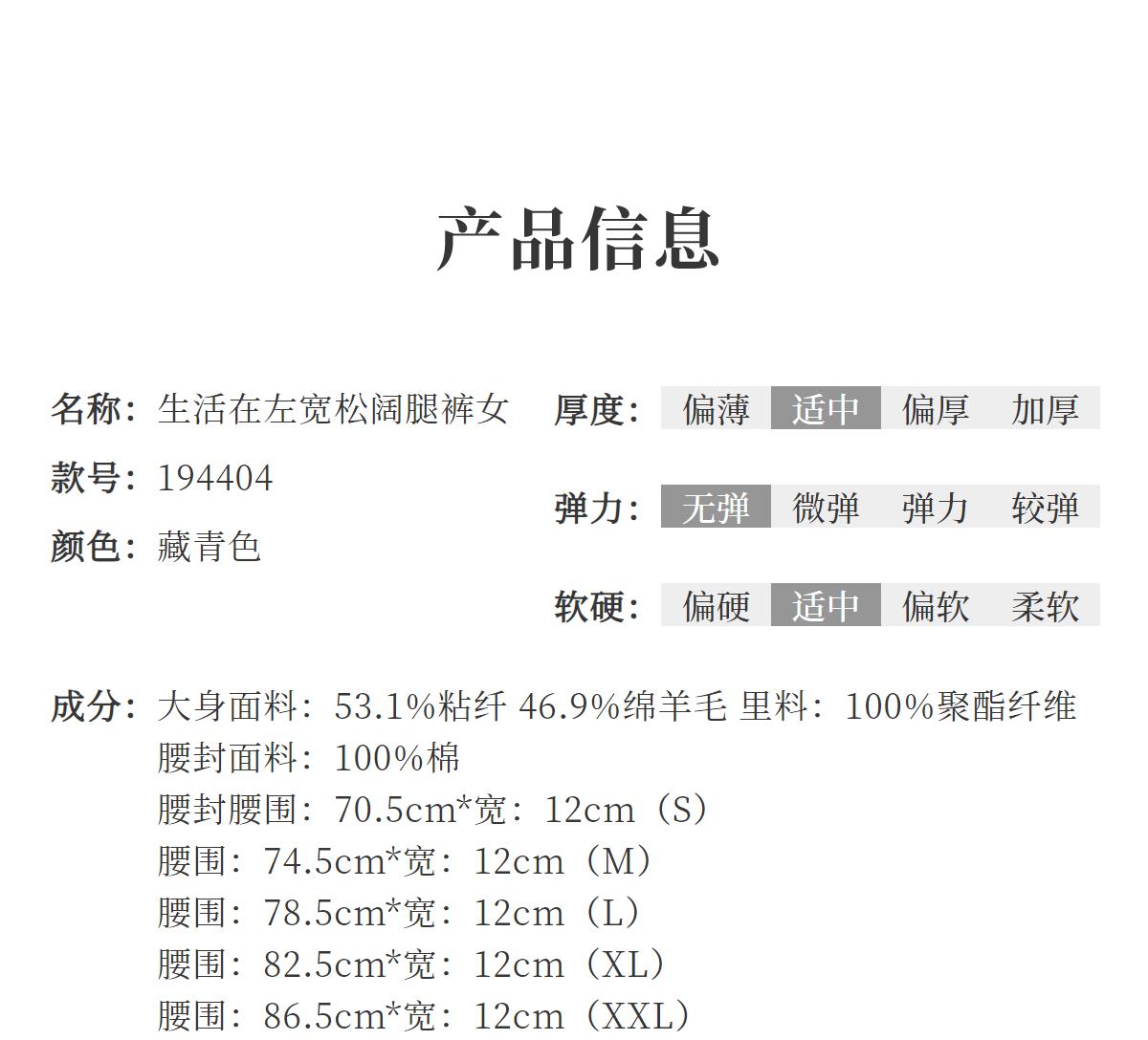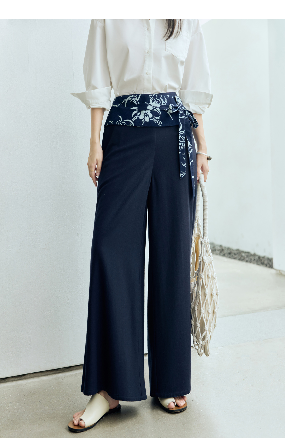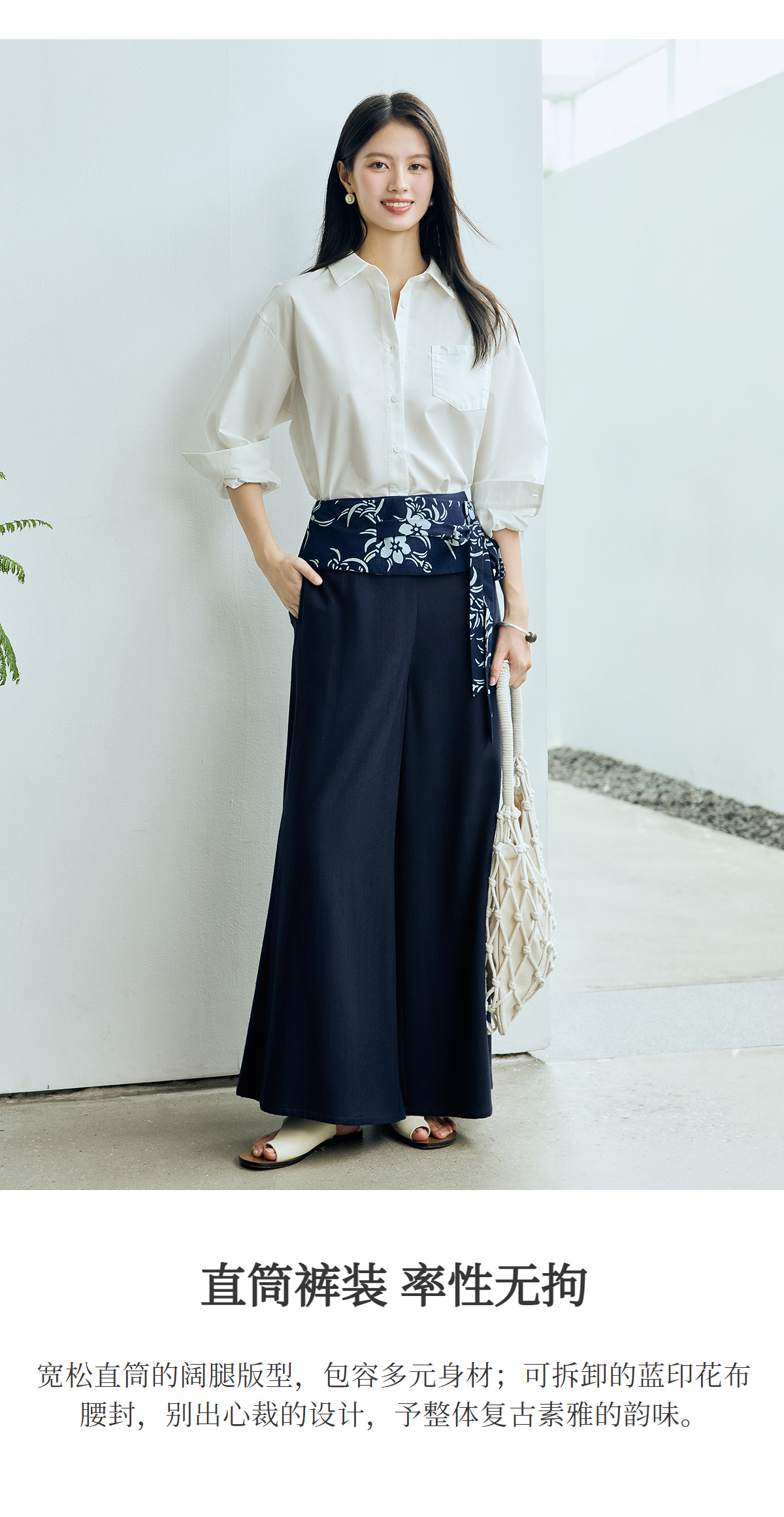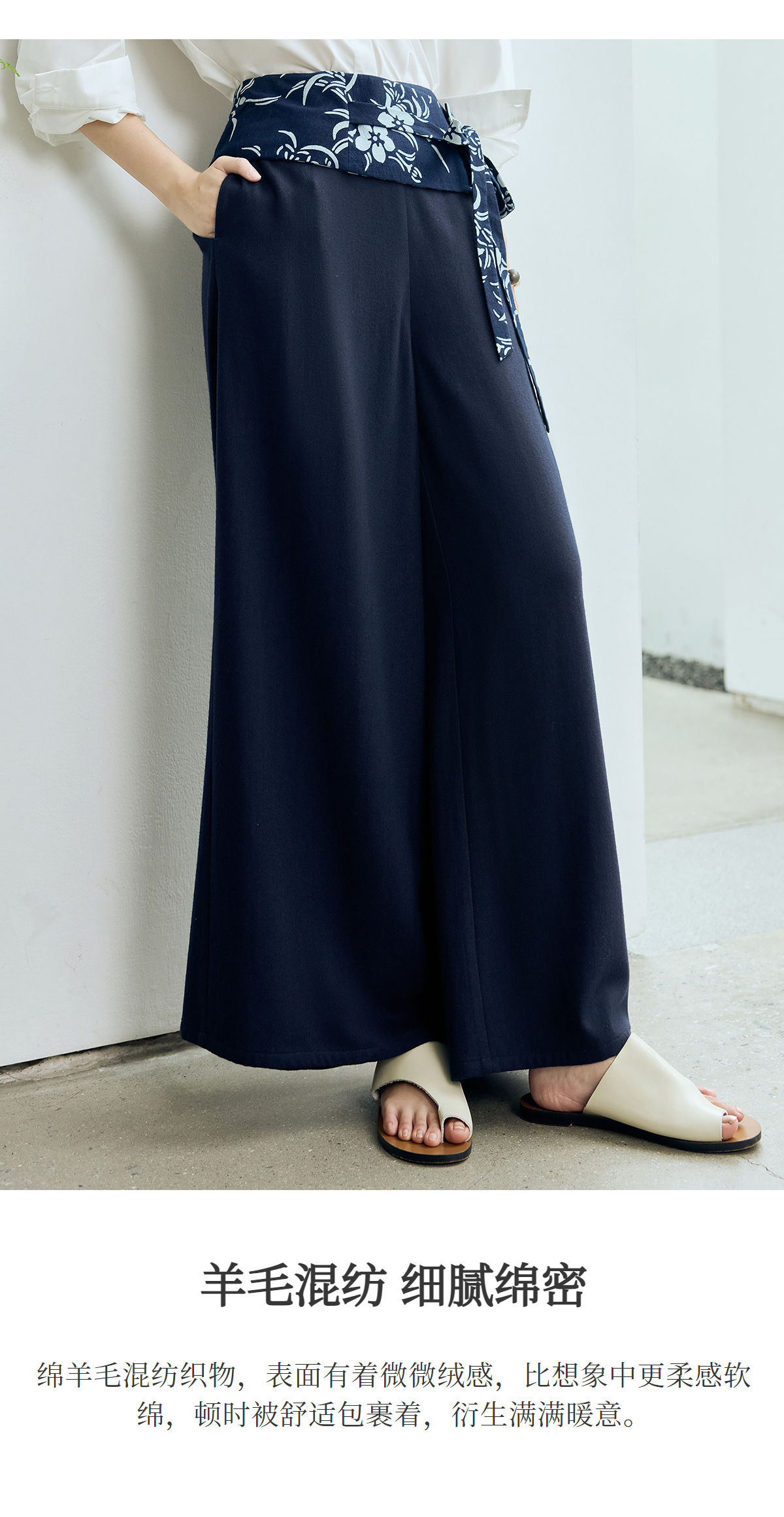 【林栖设计小店】(现货)绵羊毛混纺裤子配纯棉腰封蓝印花布秋冬新品阔腿裤女1961276