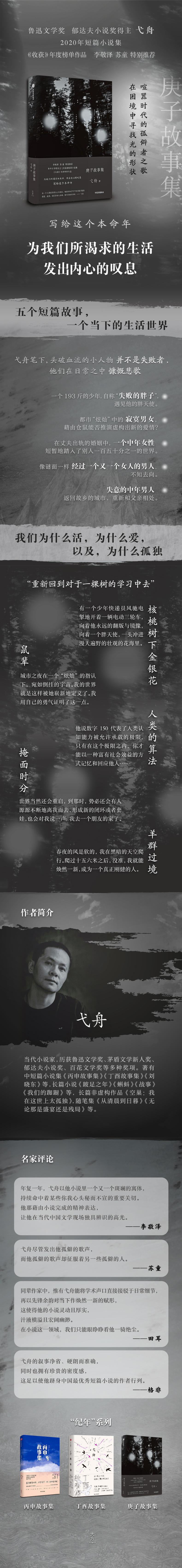 《庚子故事集》是弋舟继《丁酉故事集》之后的短篇小说集,包括《核桃树下金银花》《鼠辈》《人类的算法》《你的名字》《幻肢》五个故事。书中有193斤的失败的胖子,有像男生的外贸公司女职员,有属鼠的年轻人……这部短篇小说集带有弋舟特有的明暗交界的美学风格,作者对物理人情有近乎实证式的体察,将超越性的精神领悟落实于日常生活的细密纹路中,显示出作者对于世界的一种直觉的把握能力和描述能力。