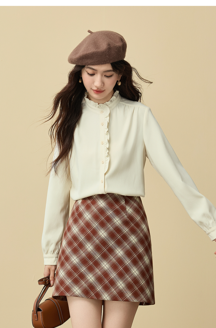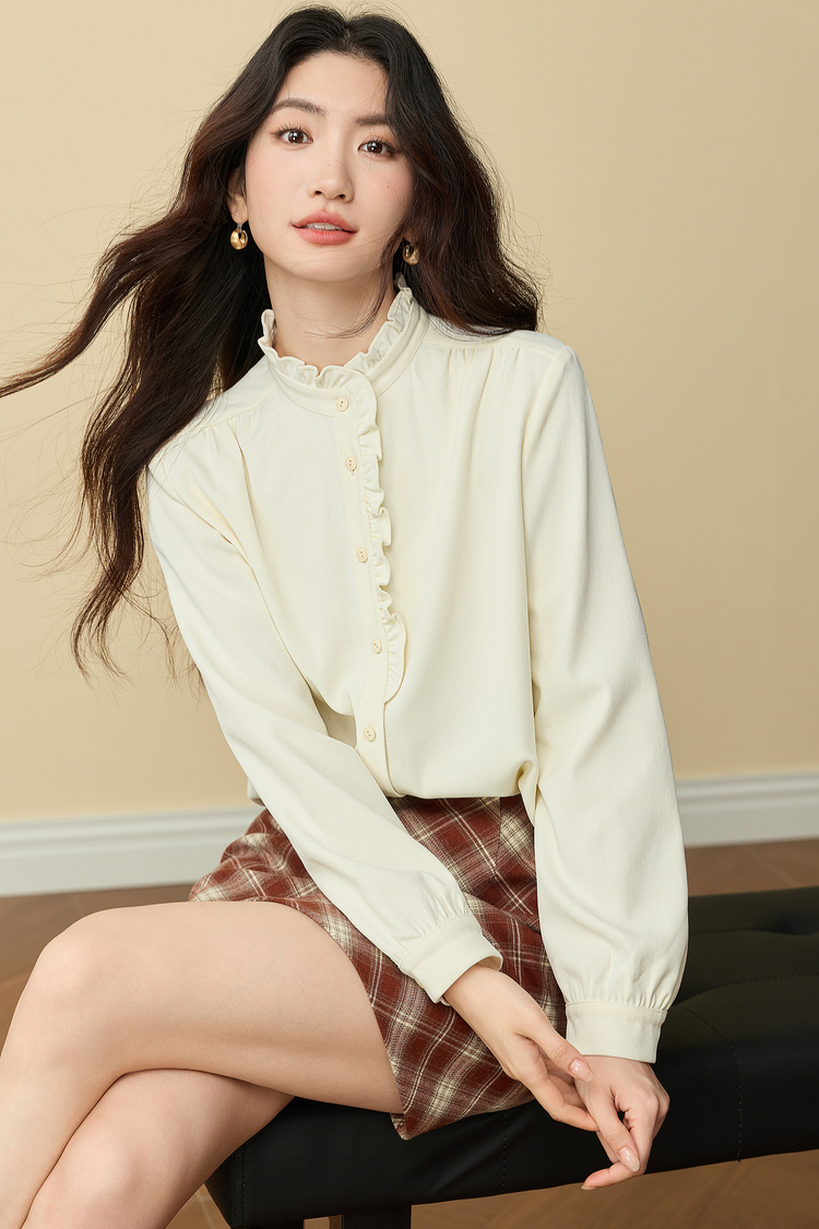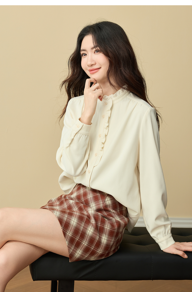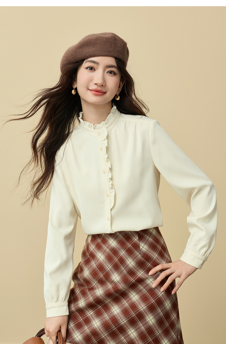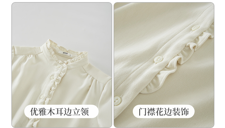 【11/19新品】熙世界法式浪漫木耳边立领衬衫女2025秋冬季优雅气质通勤磨毛衬衣