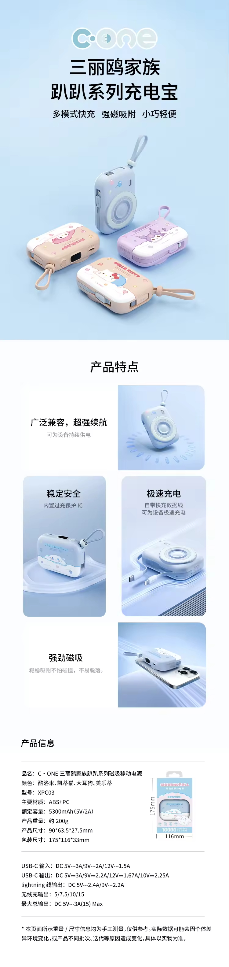 【国家3C认证】C·ONE 三丽鸥家族趴趴系列 9600mAh 磁吸移动电源