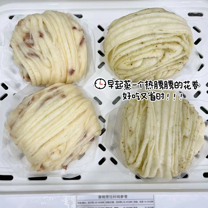 花卷每天早上拿出来蒸下,无需解冻 水开后中大火隔水蒸制6-8分钟即食 非常省事!配上鸡蛋豆浆or牛奶相当健康!