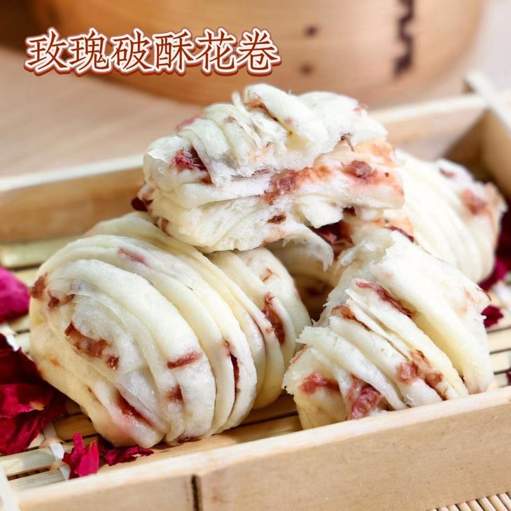 选用云南高原食用玫瑰,新鲜花瓣经过糖渍,加入发面之中,叠加成无数层次,刀切成丝条状,再次发酵之后,蒸制出来,就成了玫瑰破酥花卷!