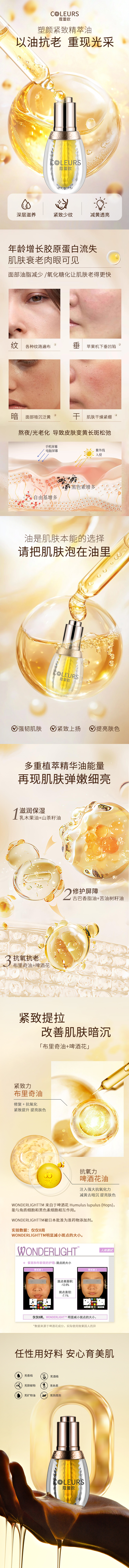 紧致焕亮精萃油 :亮肌小灯泡 以油养肤 多种珍贵油脂改善肌肤 使肌肤紧致焕亮无暇,暗沉色沉肌肤首选 与精萃乳最搭