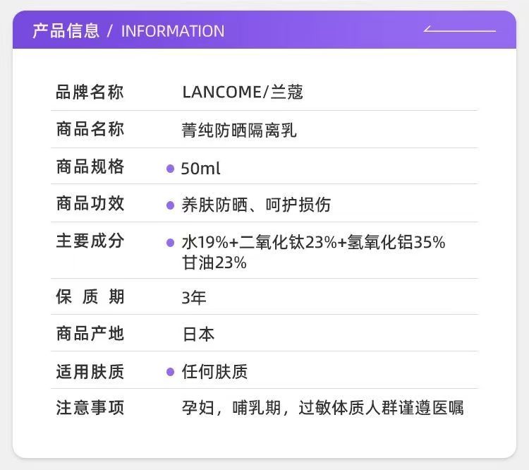 【品牌授权】【爆款】兰蔻菁纯防晒50ml养肤隔离防晒霜防水汗