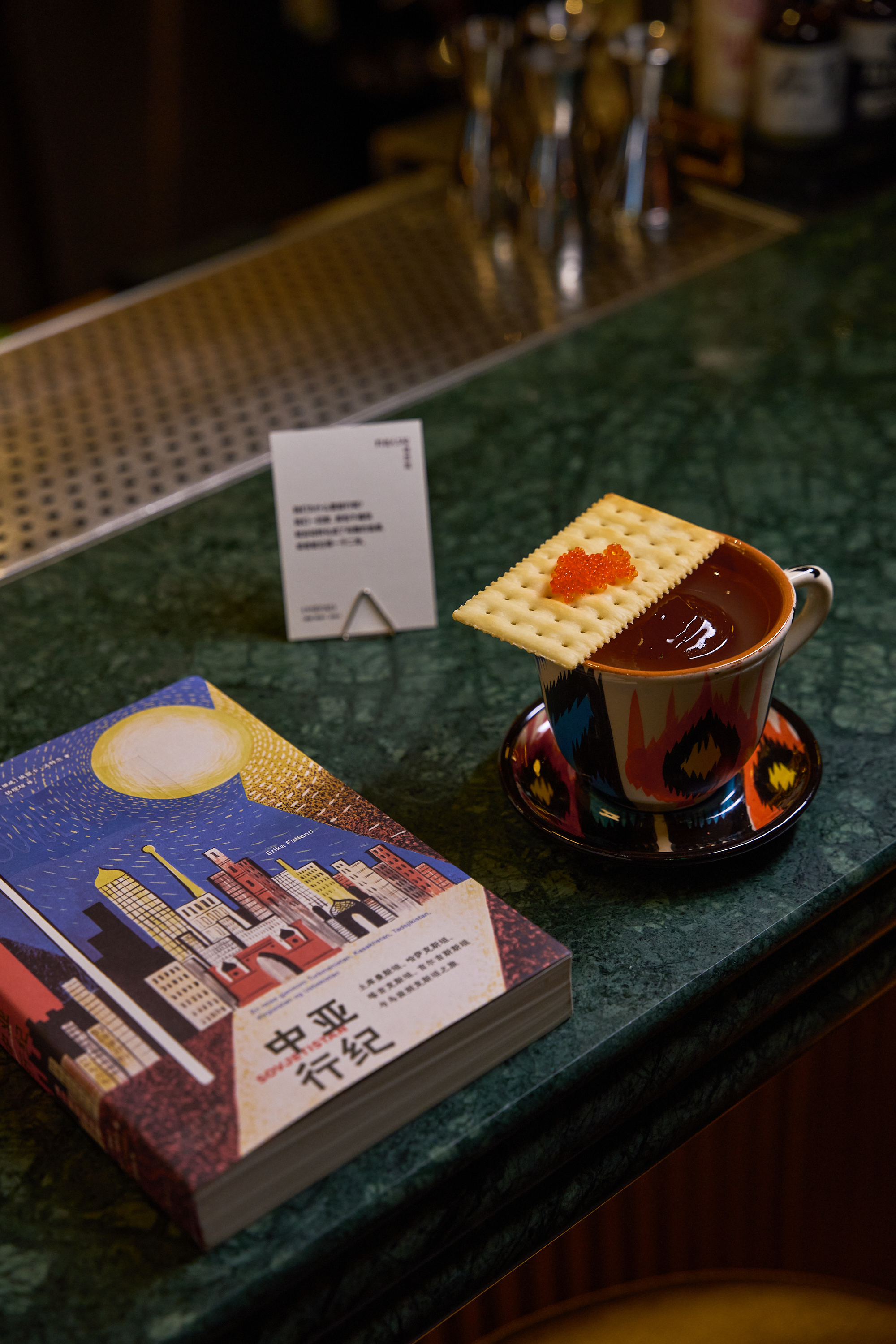 这杯酒便以此为灵感,基酒伏特加融入了虾和黄油煎出的油,加入小番茄等元素,喝起来咸鲜有趣,顶上配了鱼子酱配饼干,再装着塔吉克斯坦的手绘杯子里,满满中亚风情。