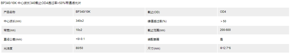 BP340/10K OD4@200-600 T>50% Φ12.7*6 带通滤光片 (带套圈)