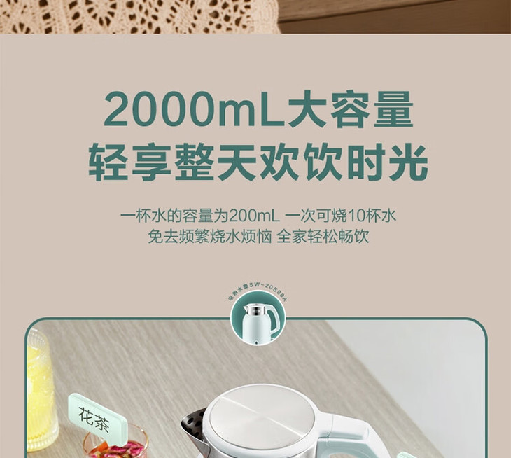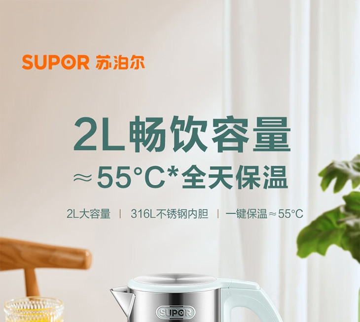 苏泊尔(510302)(SUPOR)电水壶ZMD安心系列2L大容量1800W大功率316L不锈钢机身一键保温SW-20S88A