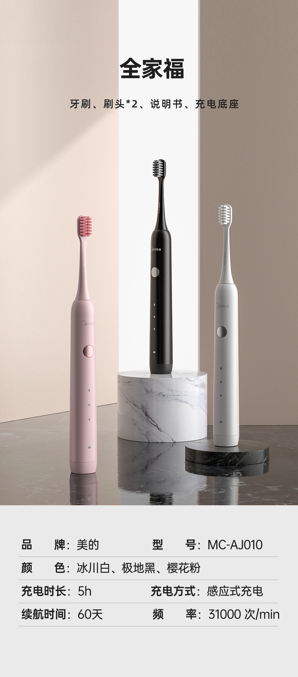 Midea美的活力MR1系列电动牙刷-MC-AJ0101(白色)【分仓直发,72小时发货,节假日不发货】