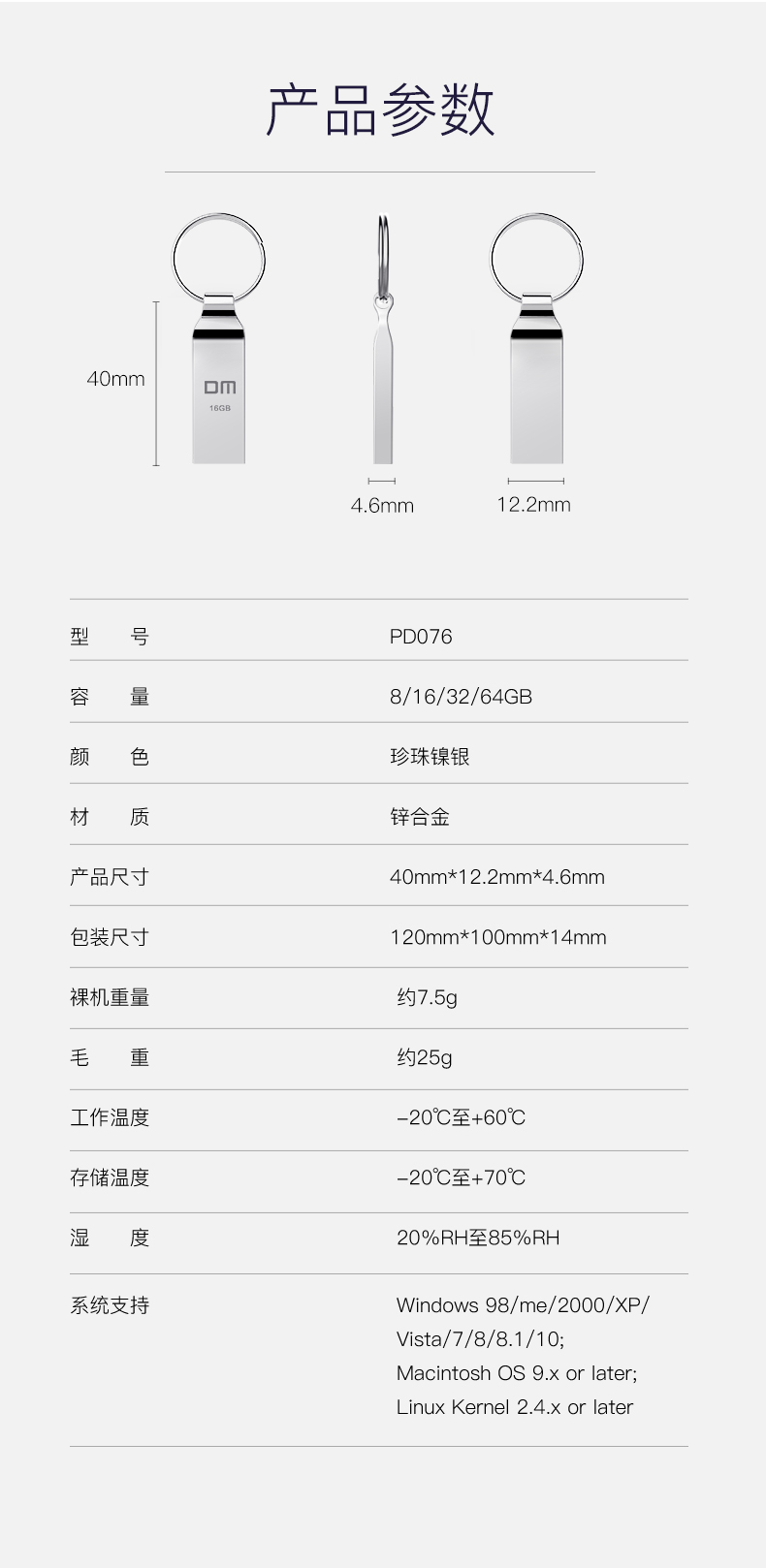 大迈(DM) 16GB USB2.0 U盘 小风铃PD076系列 招标投标小u盘 防水防震电脑车载优盘