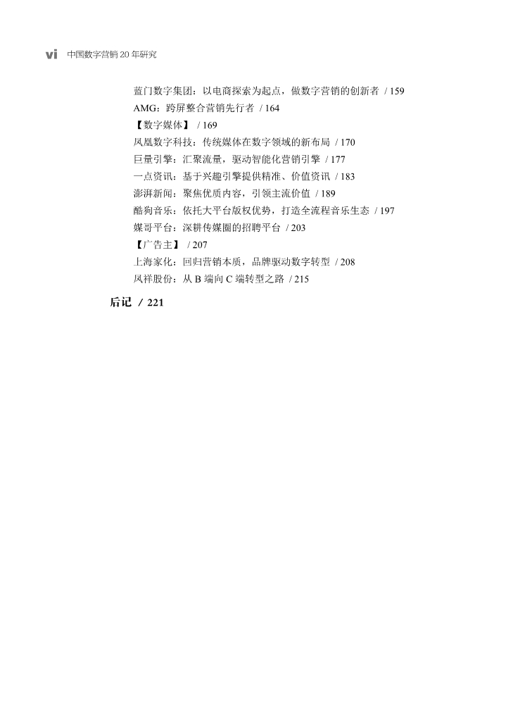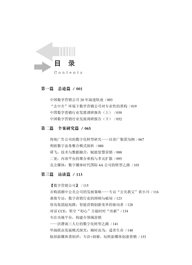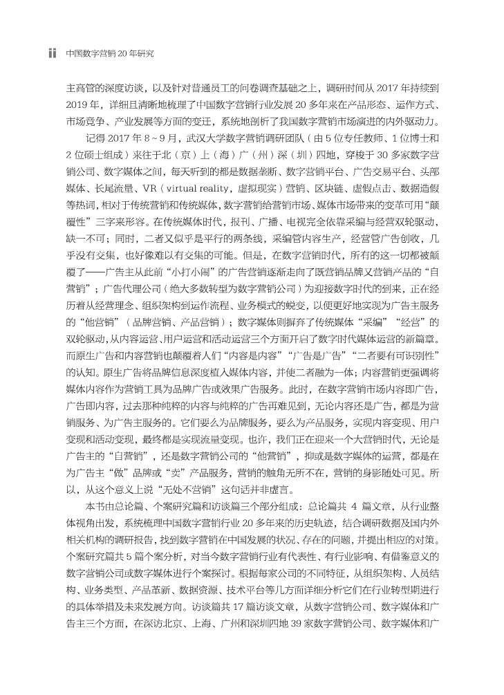《中国数字营销20年研究》是国内第一本运用第一手资料对中国数字营销20年进行专门研究的著作。《中国数字营销20年研究》分总论篇、个案研究篇和访谈篇三个部分:一是从行业整体视角出发,系统梳理中国数字营销行业20年来的历史轨迹,结合调研数据及国内外相关机构的调研报告描述现状、剖析问题、提出对策。二是对当今数字营销行业有代表性的数字营销公司或数字媒体进行个案探讨,分析它们在行业转型期的具体举措及未来发展方向。三是在深访北京、上海、广州和深圳四地39家数字营销公司、数字媒体和广告主的基础上精选17家,从行业三大运作主体的视角,重点展示不同业务类型、不同生长基因的公司在行业变革中的转型策略。