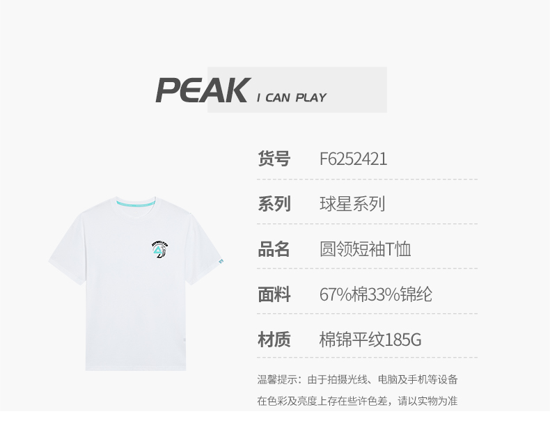 匹克2025年新款球星系列男款圆领短袖T恤F6252421
