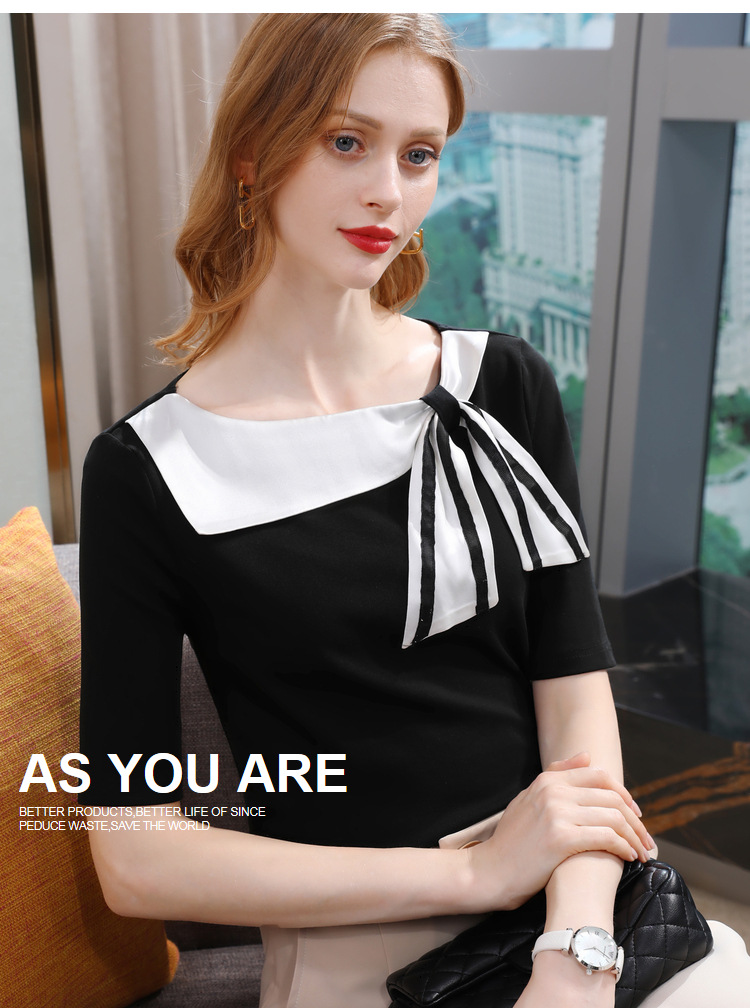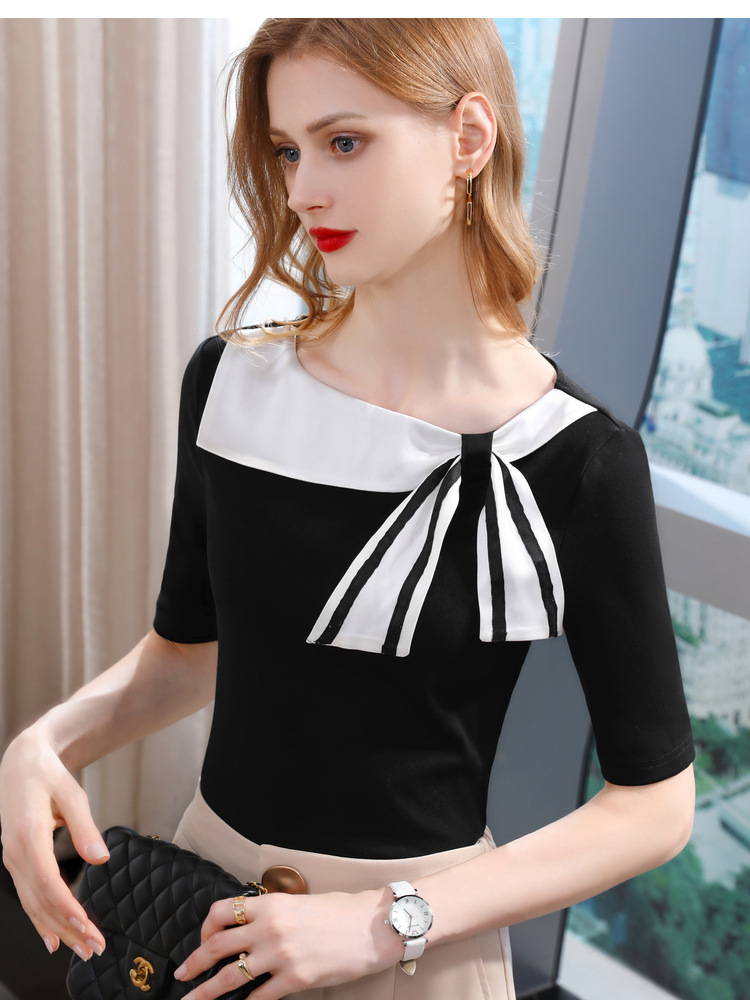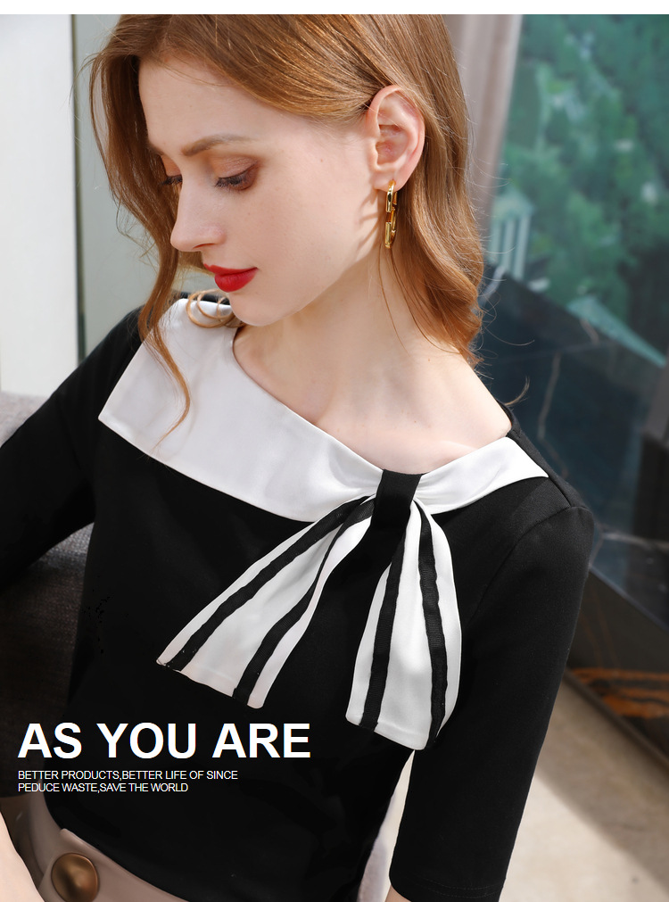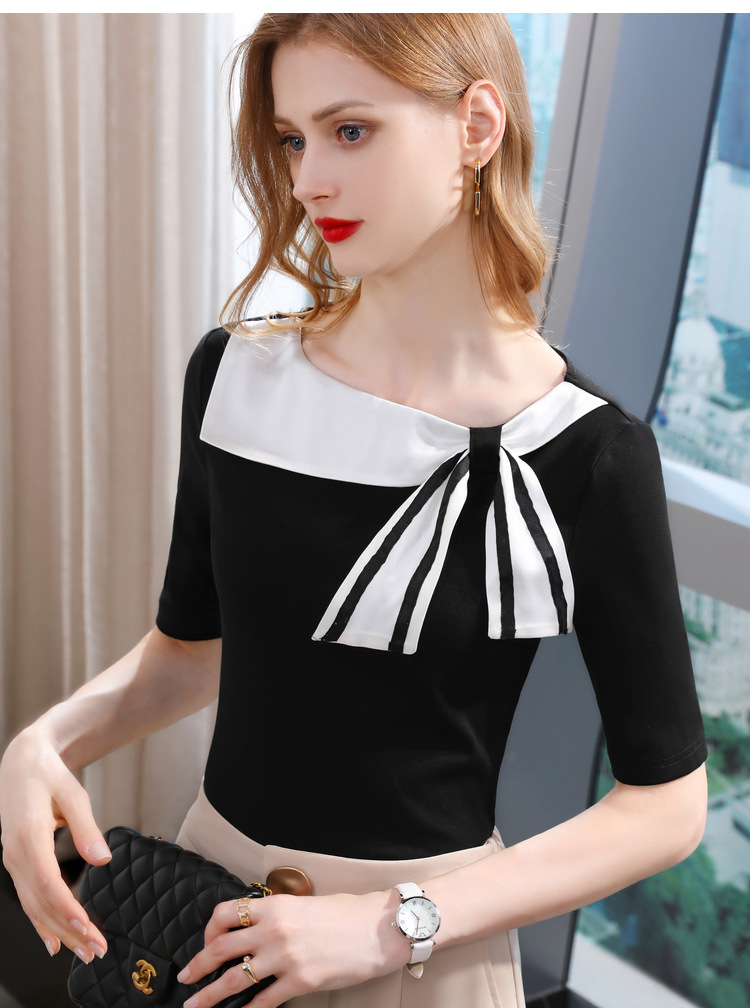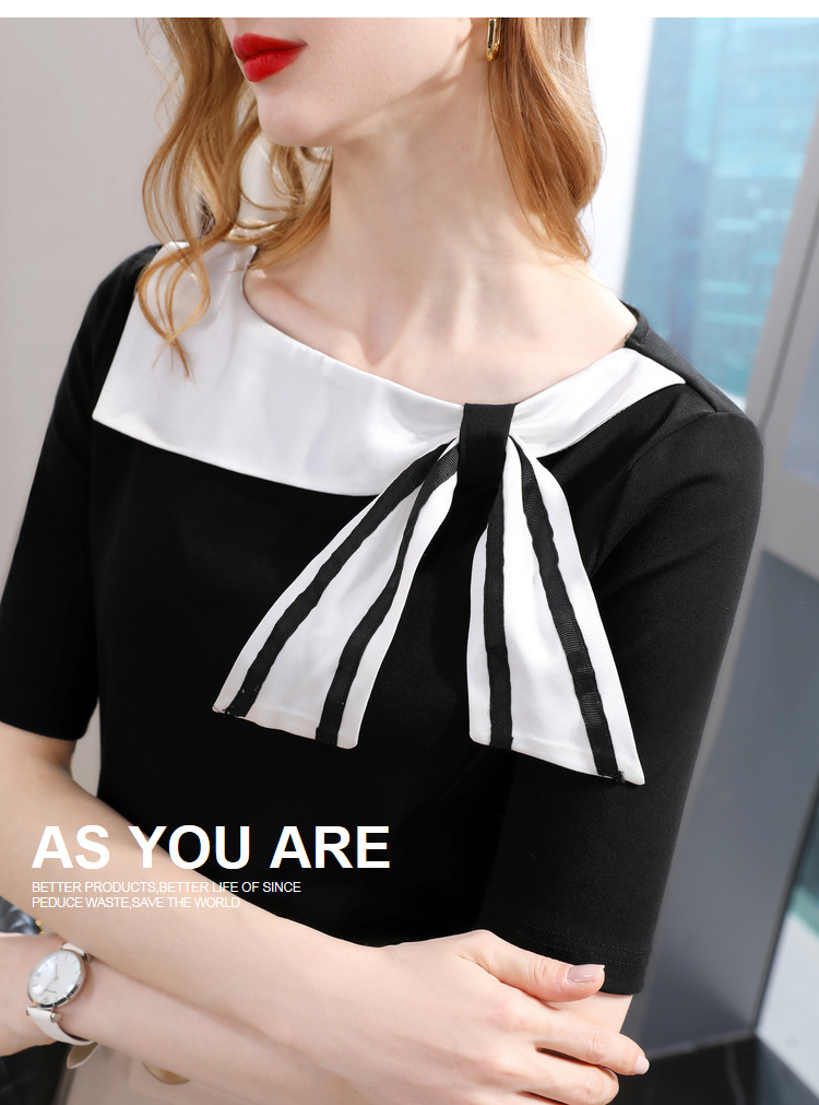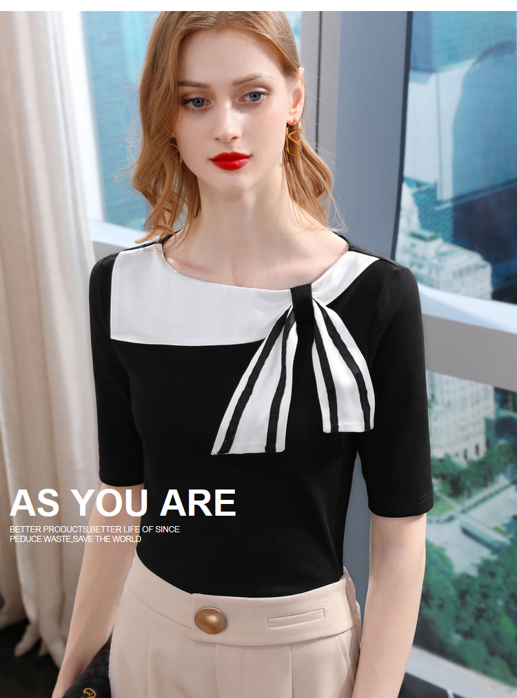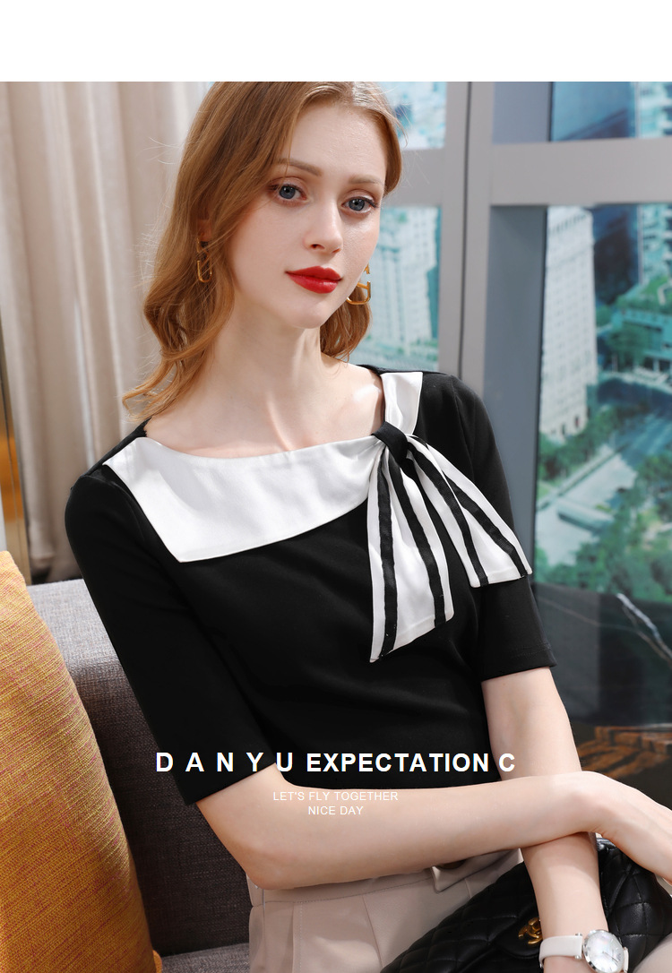 时尚百搭,中袖海军领半袖撞色蝴蝶结绑带五分袖上衣SG-T2C0107