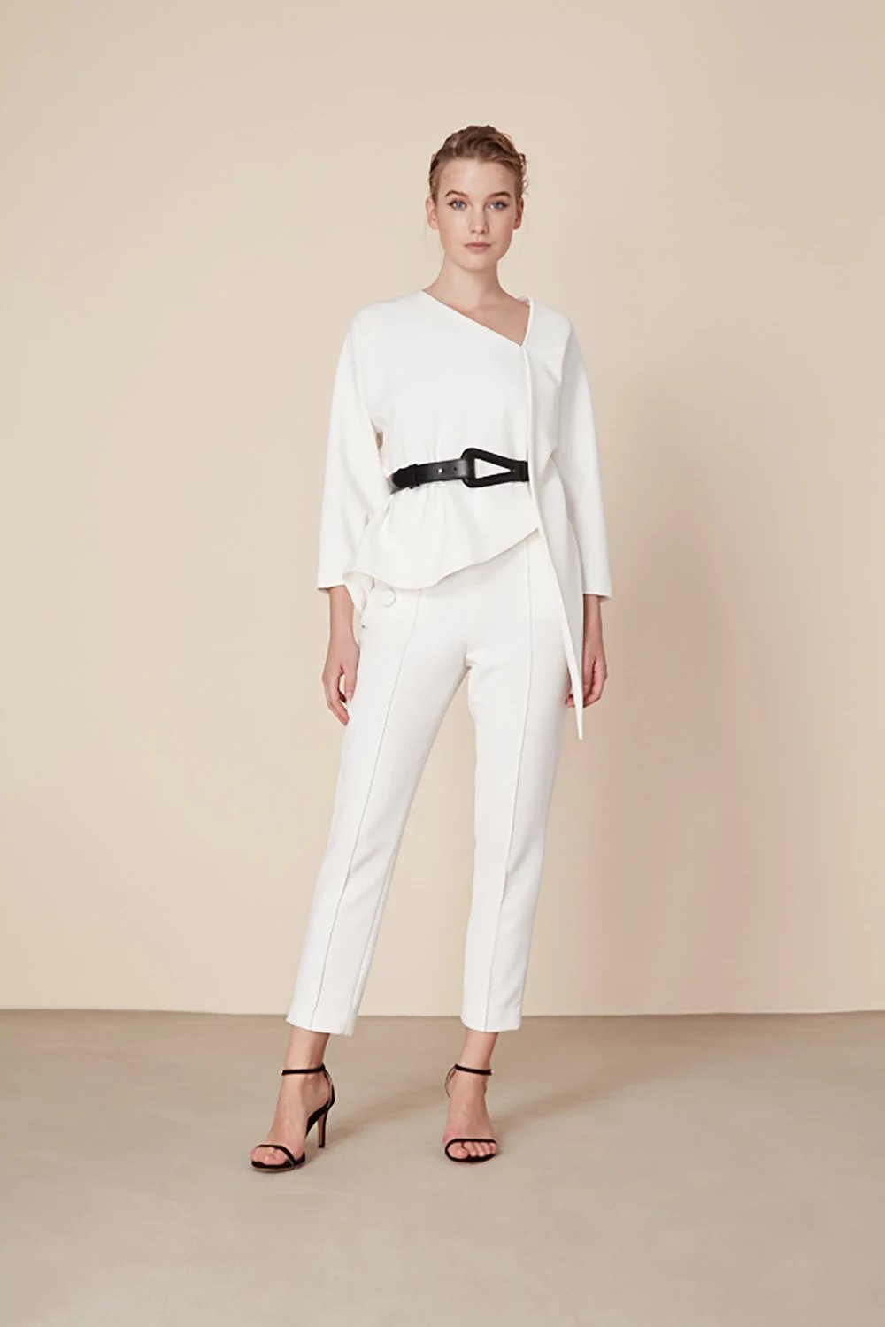 白色修身九分裤大气百搭,搭配上衣或外套都能轻松打造摩登都市造型。利落的裤线制造出立体感和视觉张力,令双腿更显笔直修长。九分长度与窄口裤脚搭配高跟鞋最是合适,营造出时髦利落的职业装束和休闲造型。