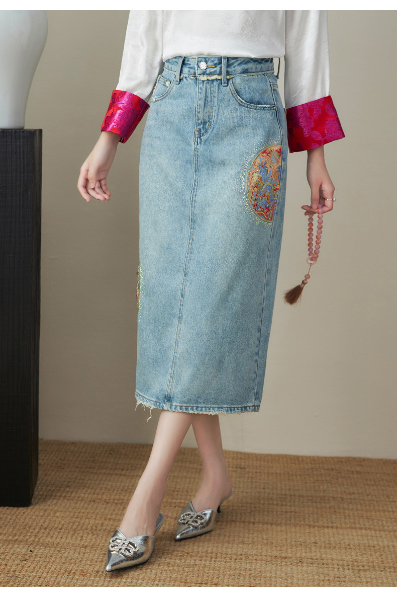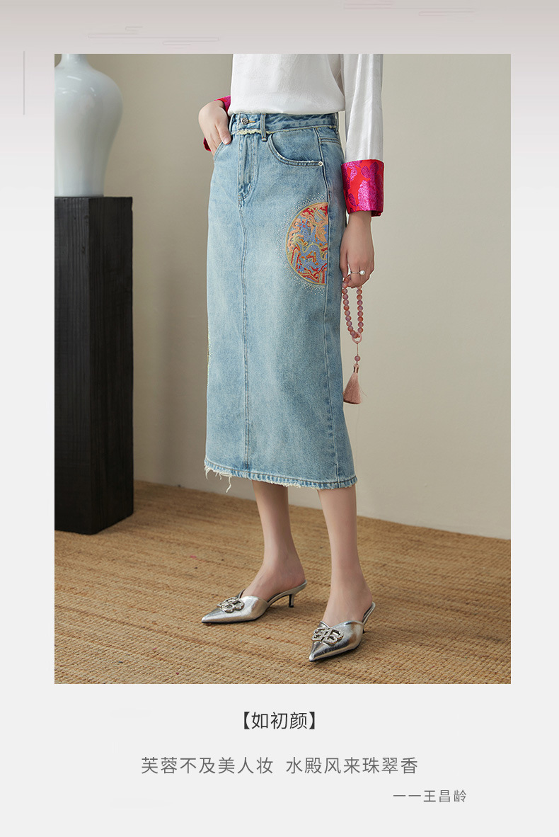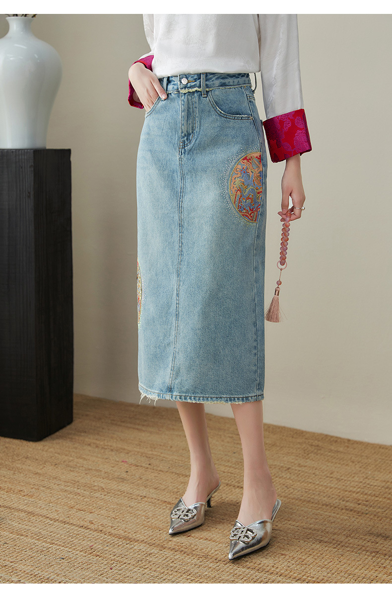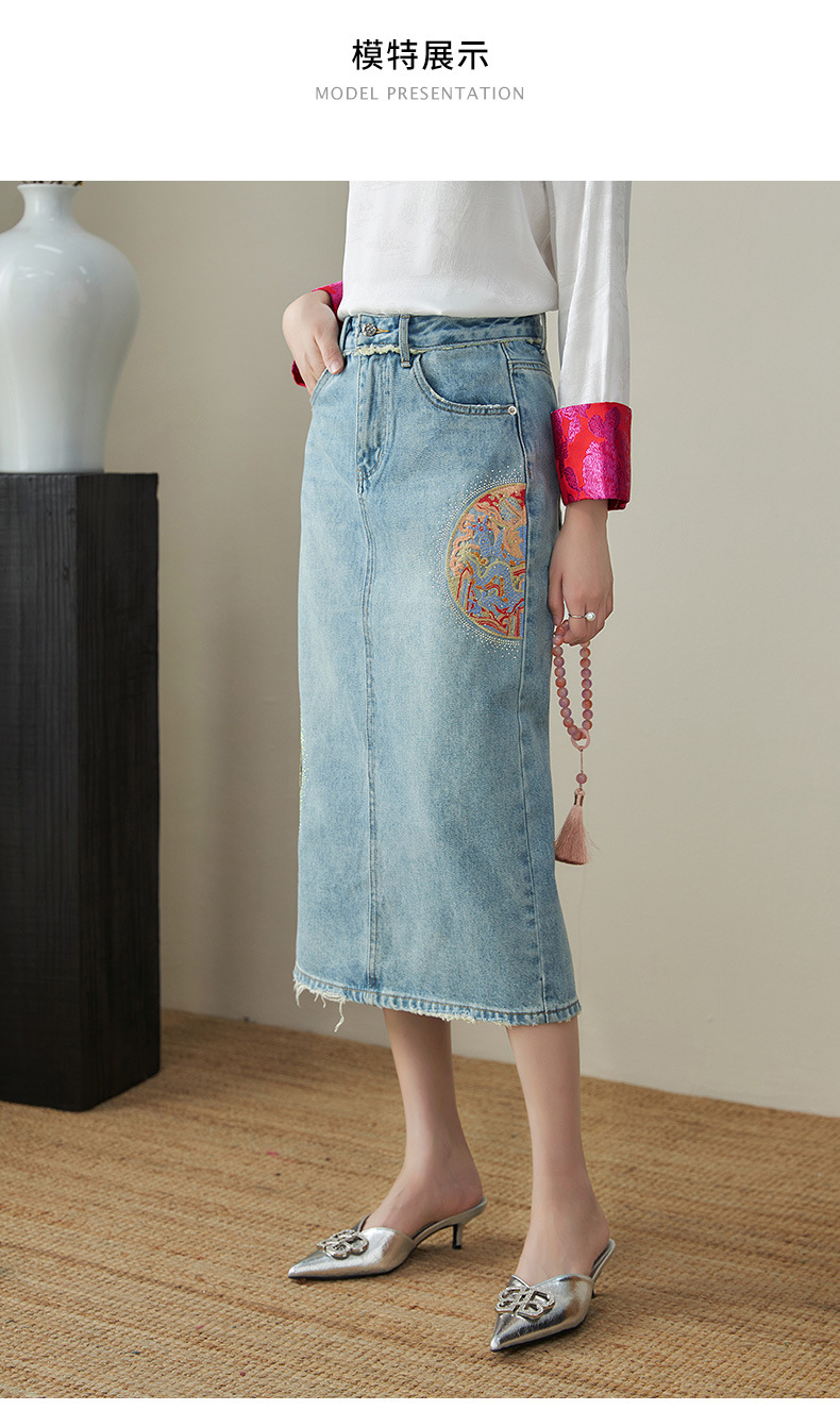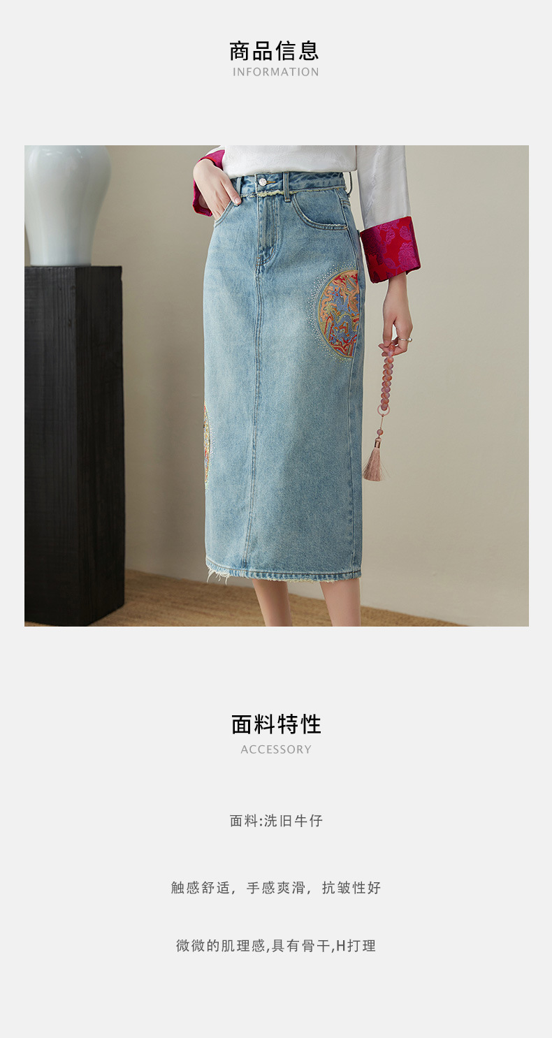 复古绣花烫钻轻奢,高腰牛仔半身裙WLZD-2411507