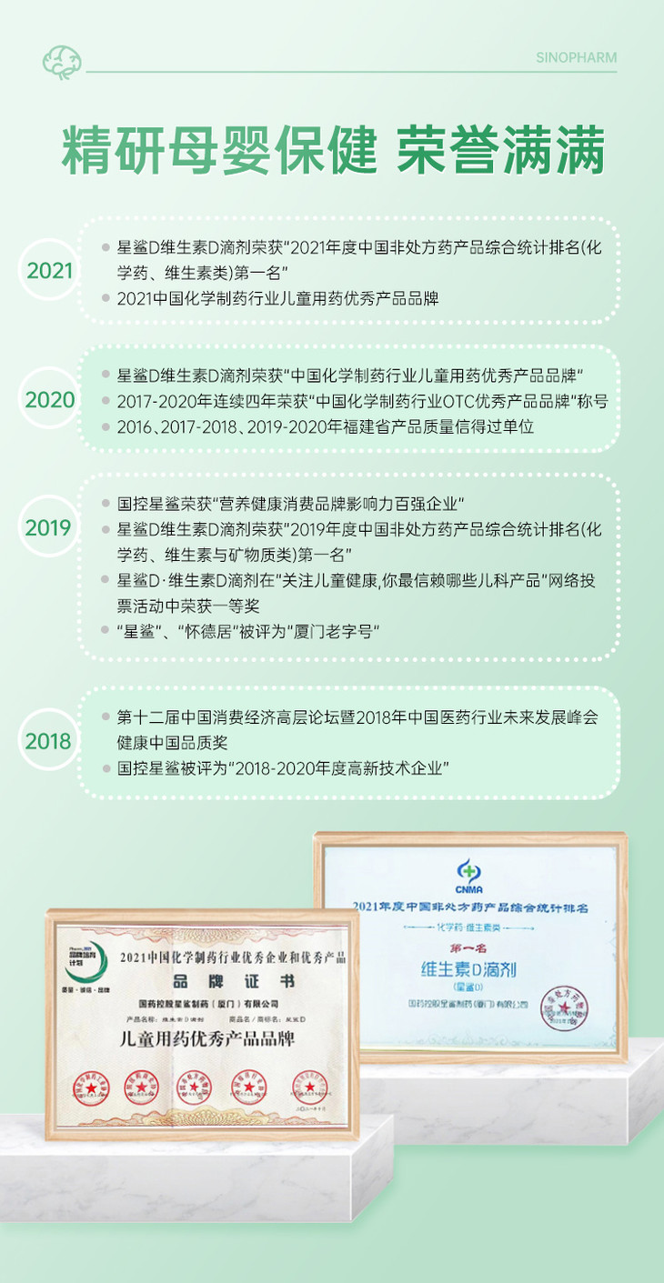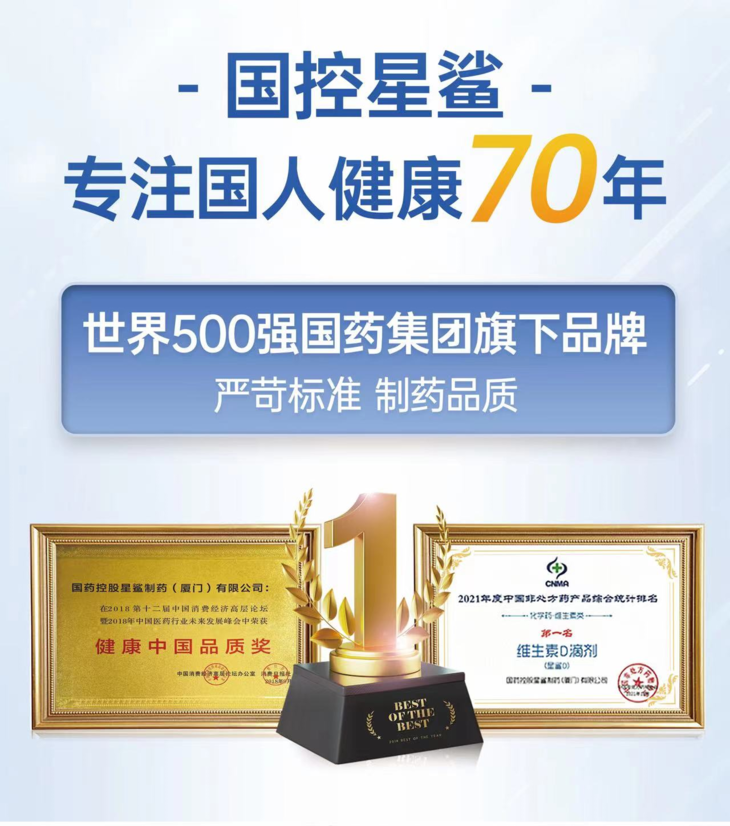 在养娃路上,选对品牌太重要啦! 国药星鲨,绝对是值得信赖的母婴保健王牌 它隶属世界 500 强、规模位居世界制药企业榜首的中国医药集团 作为拥有 70 年历史的中华老字号 国药星鲨承载着岁月沉淀的品质与信赖 多年来不断打磨产品,荣誉满满: 星鲨 D 维生素 D 滴剂多次登顶 “中国非处方药产品综合统计排名” 维生素类榜首 还连续四年荣获 “中国化学制药行业 OTC 优秀产品品牌” ,妥妥的行业明星产品✨ 国控星鲨也是 “营养健康消费品牌影响力百强企业” 还在众多行业论坛、评选中斩获大奖,像 “健康中国品质奖” 等