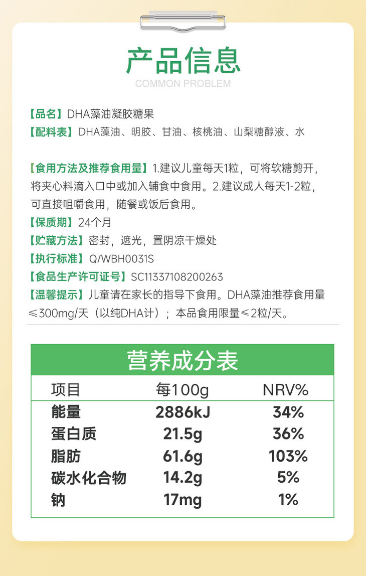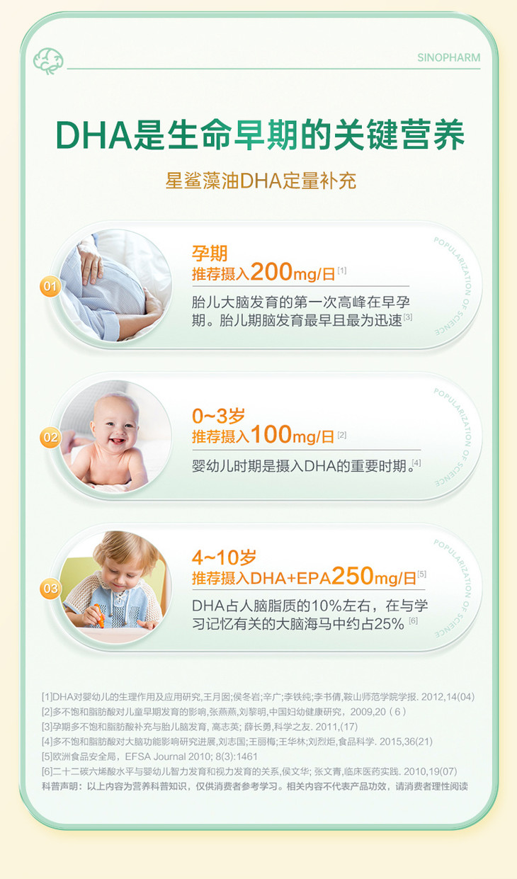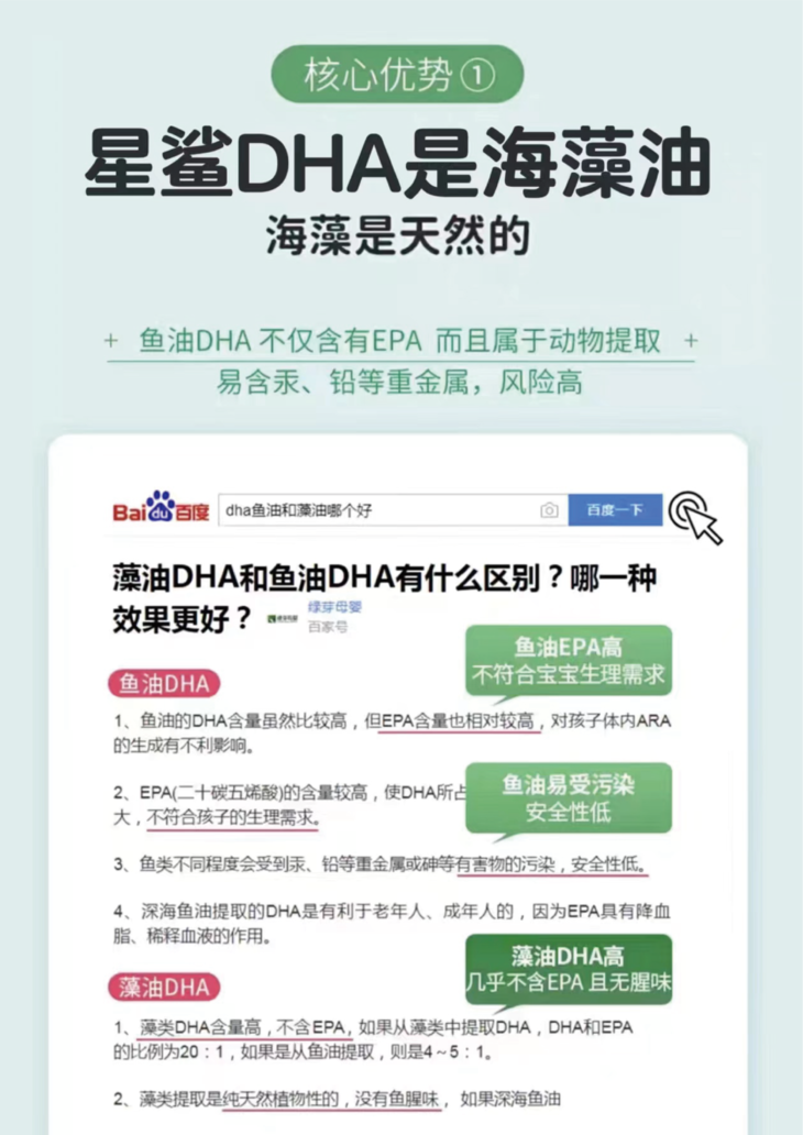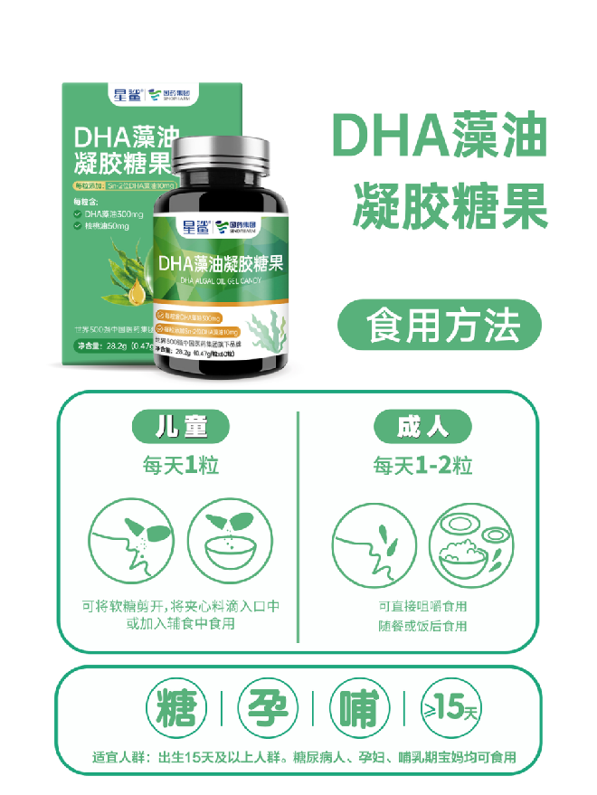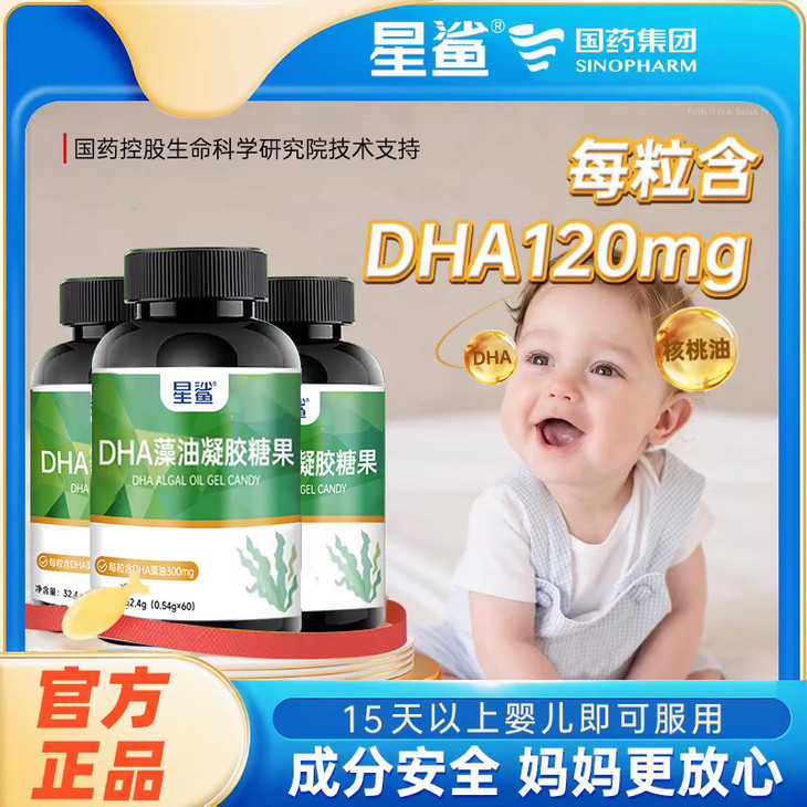 【星鲨 DHA藻油凝胶糖果】 ✅星鲨 DHA藻油精选裂壶藻种子 无污染、纯度高,不含EPA、才合适宝宝和孕妇 ✅每粒含 DHA 藻油 300mg ,高于同行普遍250mg 含量领先,性价比高 ✅0防腐剂 0香精 0人工色素,食用更放心~ ✅还特别添加sn-2位DHA藻油 由中国工程院院士朱蓓薇和江南大学王兴国教授 博士生导师团队研发富含Sn一2位DHA 更接近与母乳中DHA的主要存在形式 更加适合婴幼儿食用,营养直达大脑,充分吸收