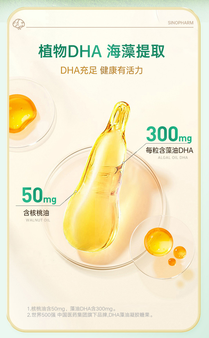 ✅每粒特别添加 50mg 核桃油 它属高级压榨植物油,自带核桃清香,质地清透纯净🌰 富含多种维生素、矿物元素与生理活性物质 在细胞修复等方面超给力💪 人体必需脂肪酸含量超 70%,α- 亚麻酸含量远超常见植物油 品质碾压同行常用的葵花籽油👏 α- 亚麻酸不仅守护心血管健康❤️,更是 DHA、EPA 合成的 “前体小助手” 与 DHA 强强联手,全力助攻大脑、神经及视网膜发育成长🚀!
