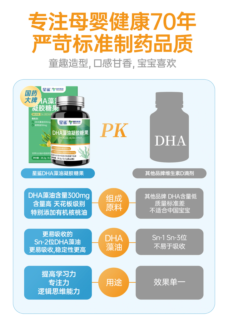 今天给大家挖到的这款 —— 【星鲨 DHA藻油凝胶糖果】是世界500强,中国医药集团旗下品牌 ✅每粒含DHA藻油300mg,同行普遍只有250mg 星鲨DHA天花板级别含量,性价比更高! 这含量在一众产品里相当能打,给孩子补 DHA 一步到位 ✅它还特别添加了 sn - 2 位 DHA 藻油 吸收效率大大提升,营养都能被宝宝身体牢牢抓住~ ✅另外还搭配了核桃油,双份营养,给娃的成长猛猛助力💪 国药集团出品,大品牌值得信赖 从原料到生产,层层把关 咱当家长的,给孩子吃着也放心🤗