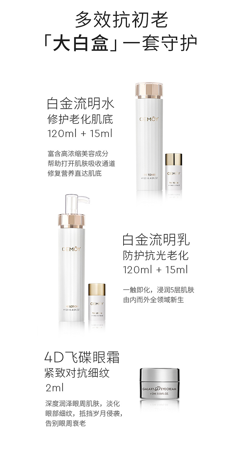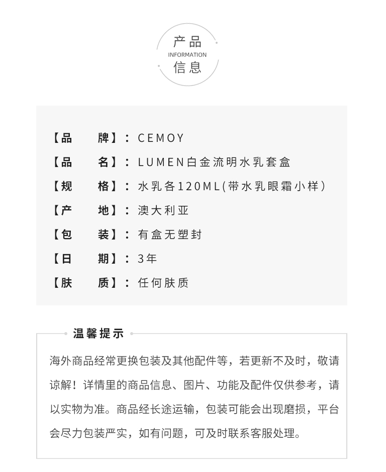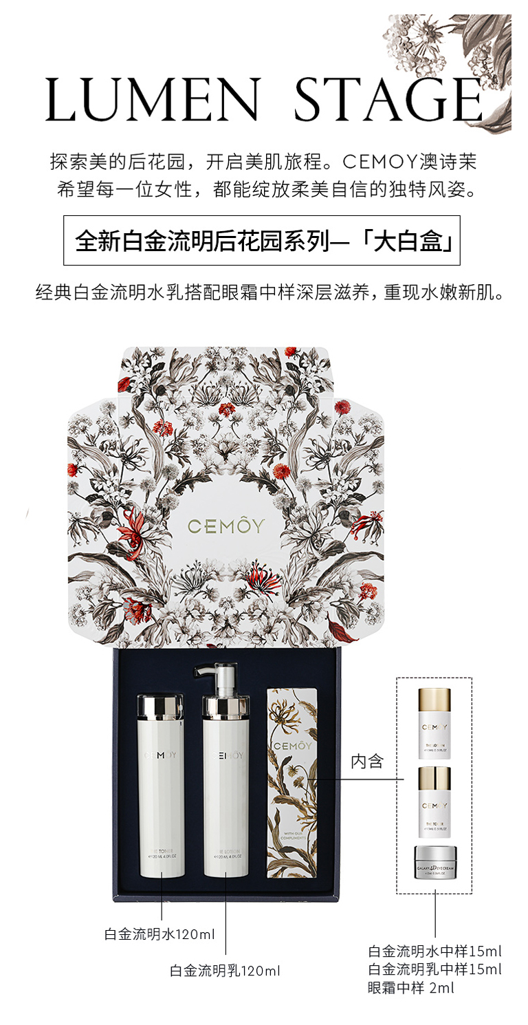 CEMOY/cemoy 澳洲水乳 LUMEN白金流明水乳套盒套装 爽肤水精华乳液5D通透保湿修护