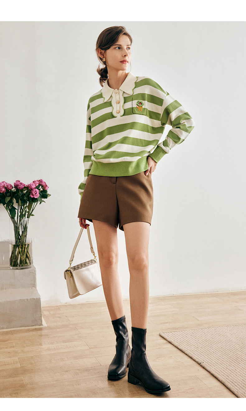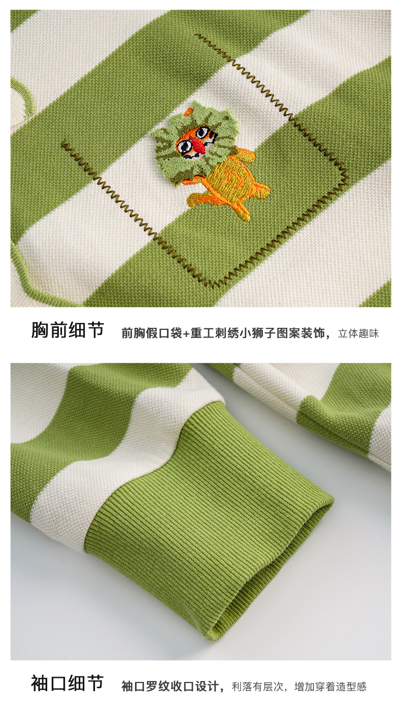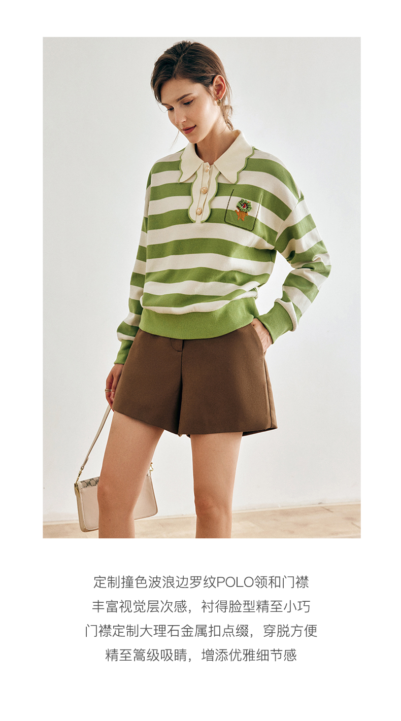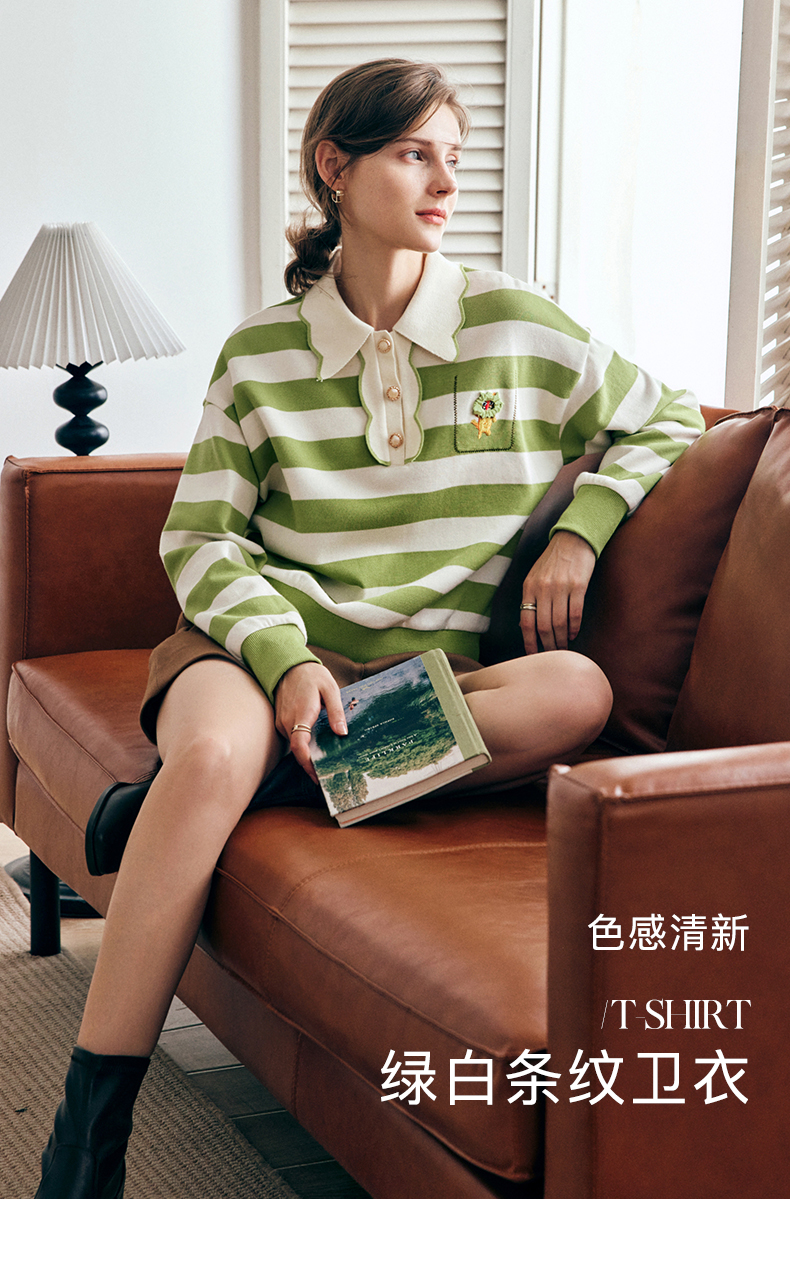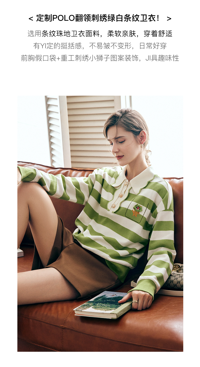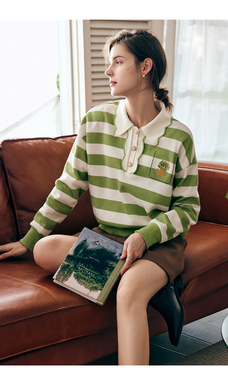 OLrain法式绿色条纹卫衣女早秋2022年新款高级感Polo领翻领上衣