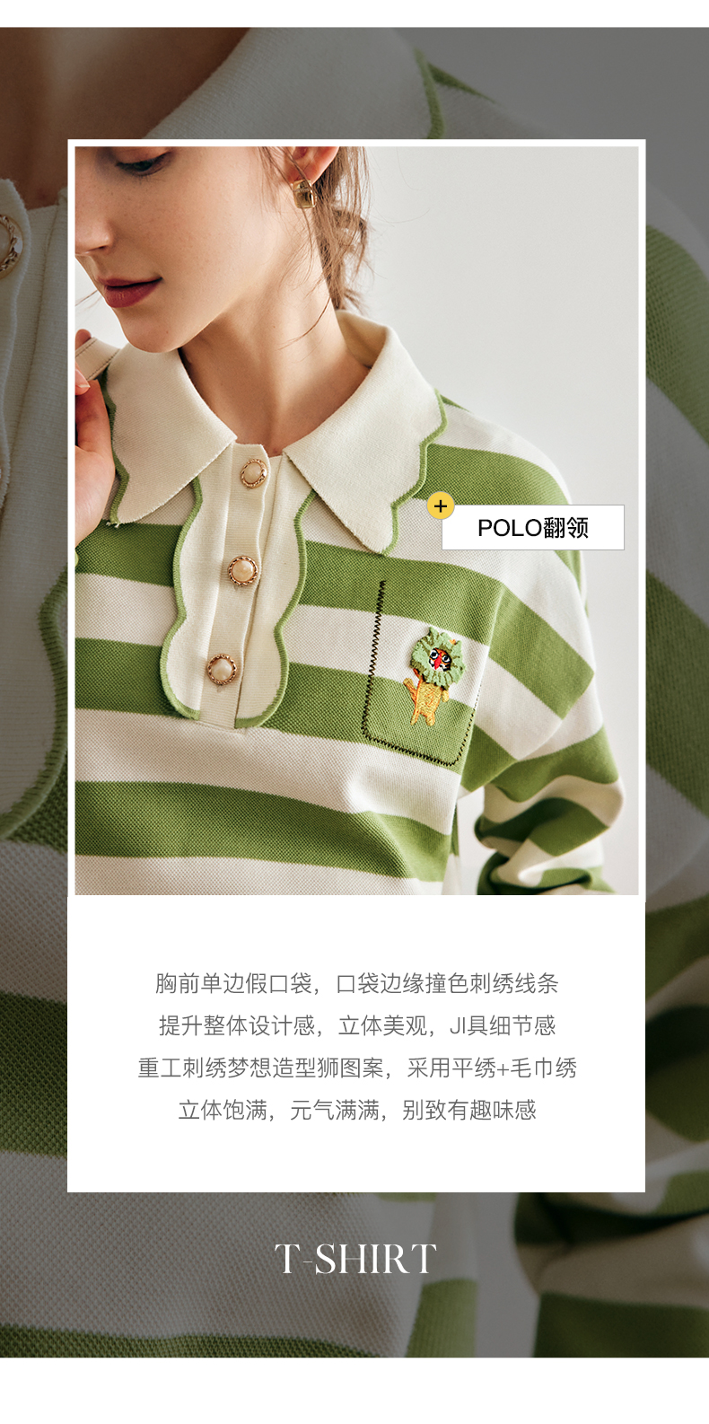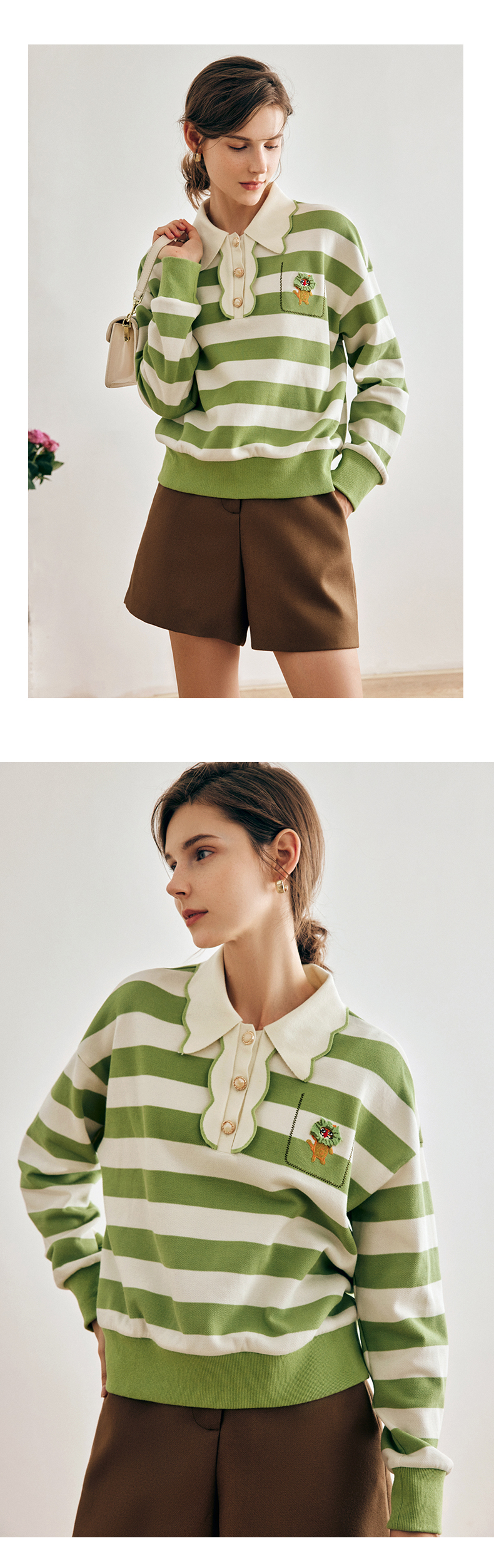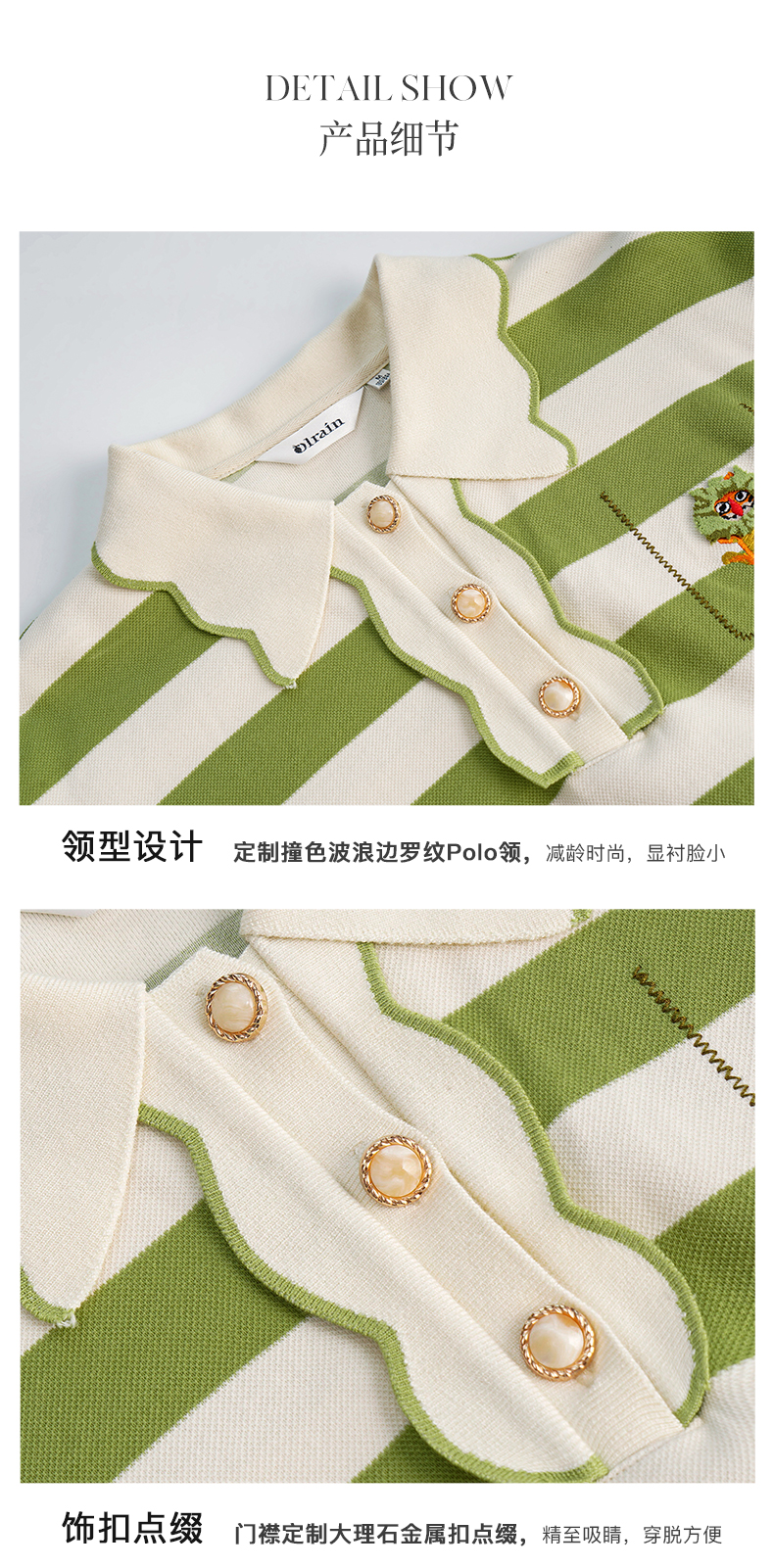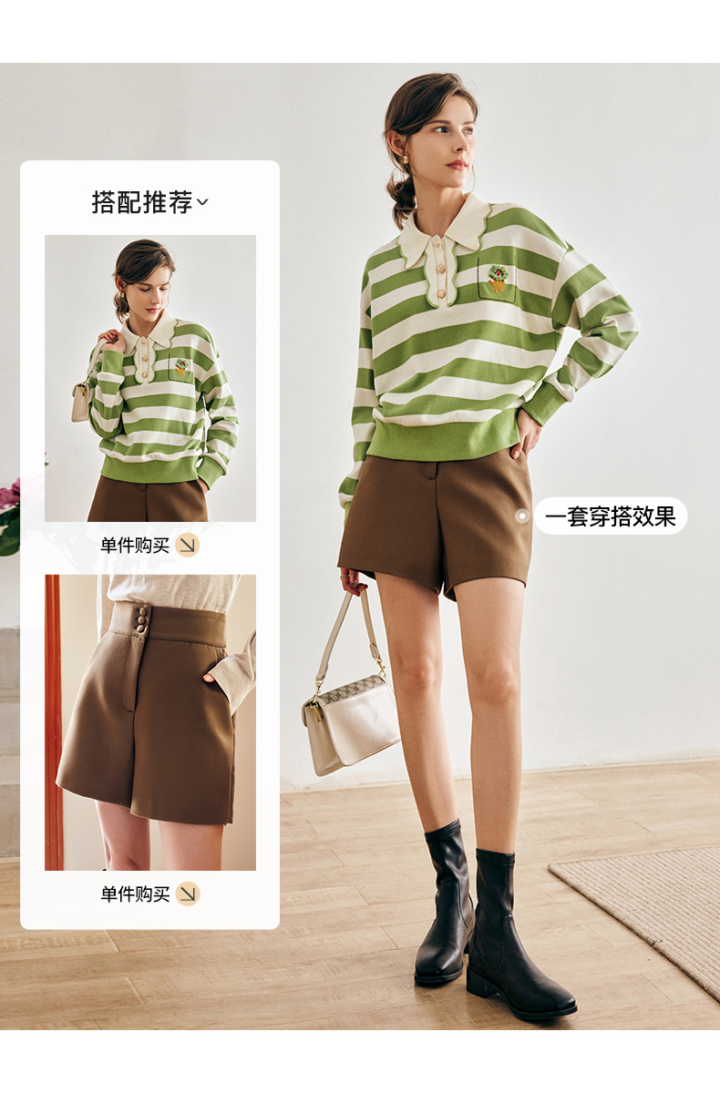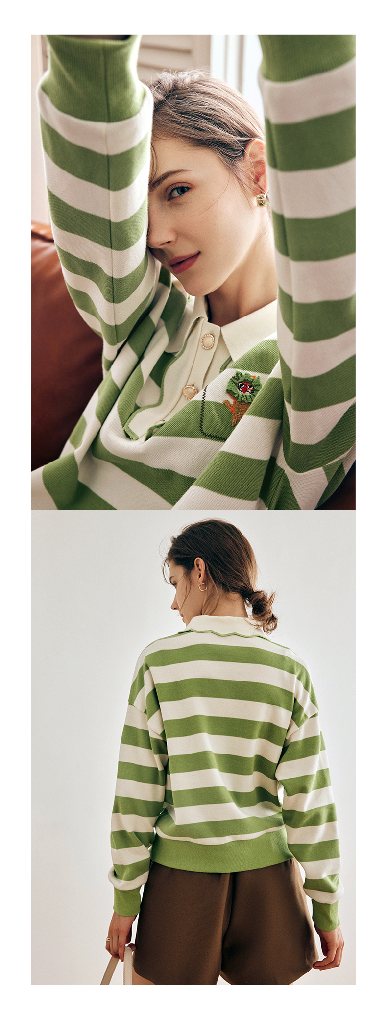 OLrain法式绿色条纹卫衣女早秋2022年新款高级感Polo领翻领上衣