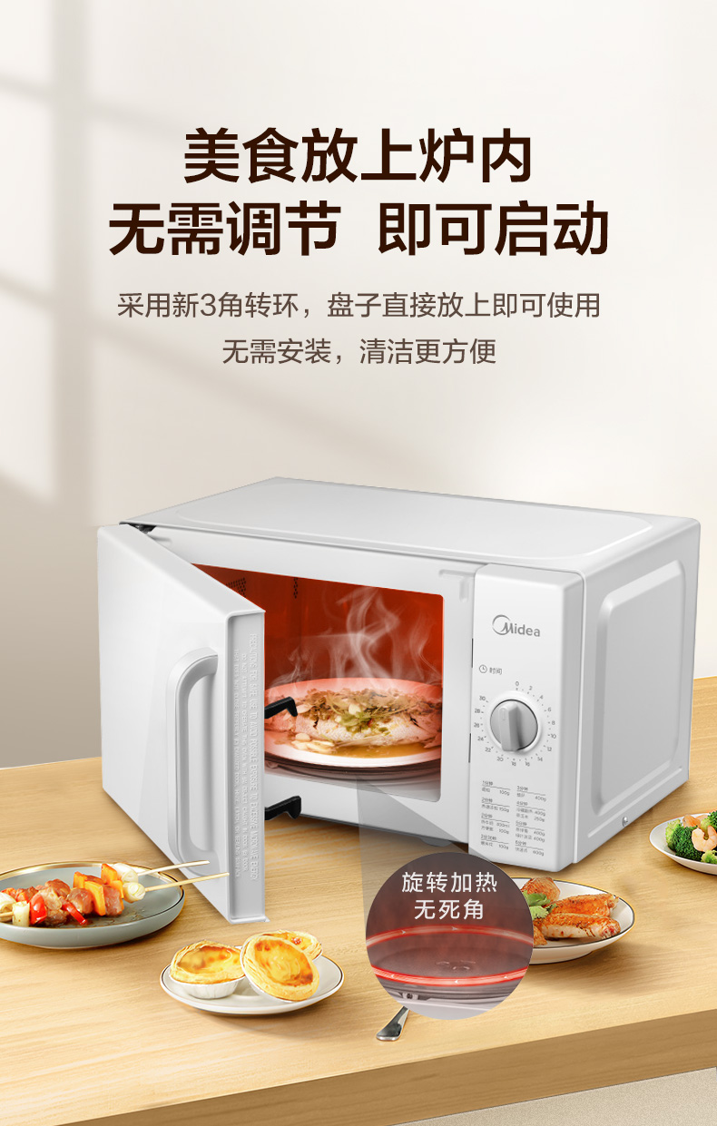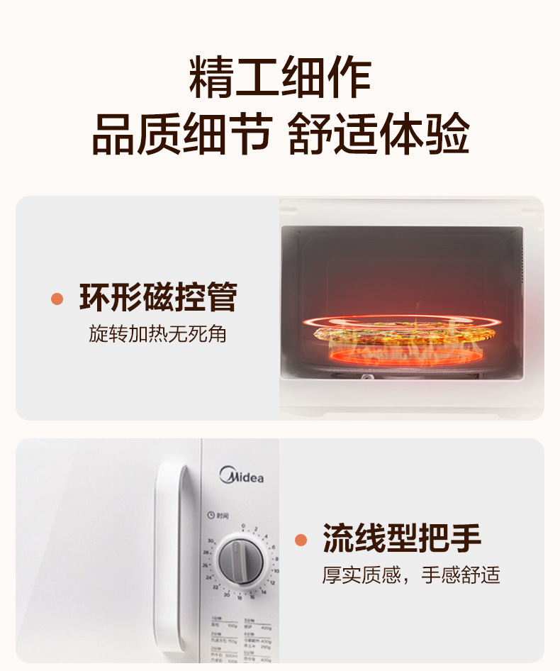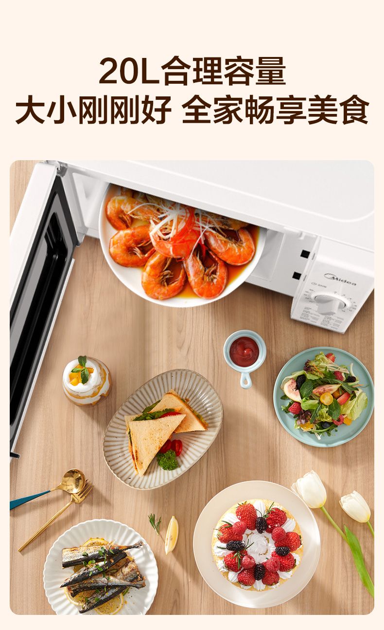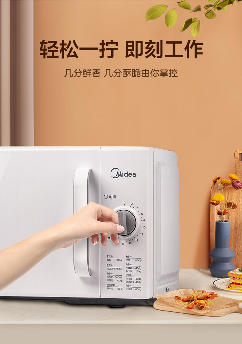 美的(Midea)快捷家用微波炉 家用小型迷你 360°转盘加热 旋钮操控 易洁内胆 时间调节20升PM2000