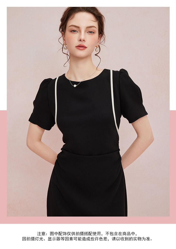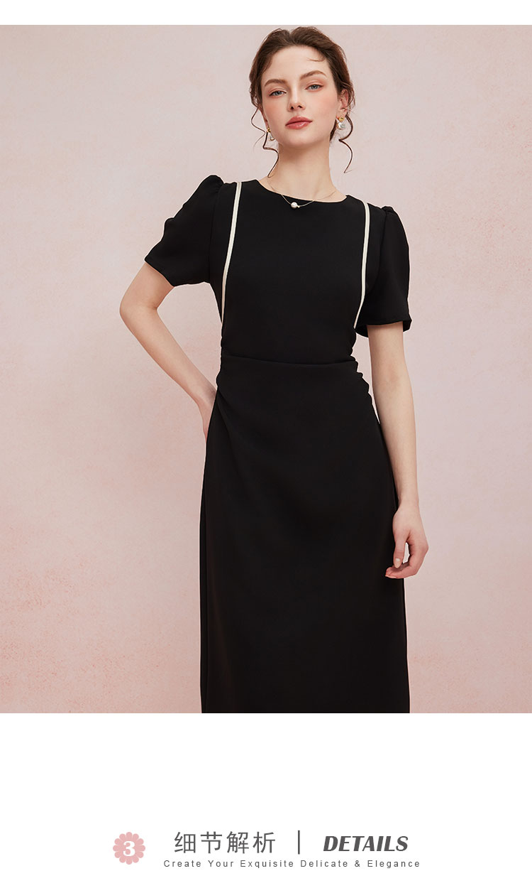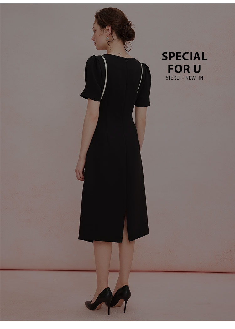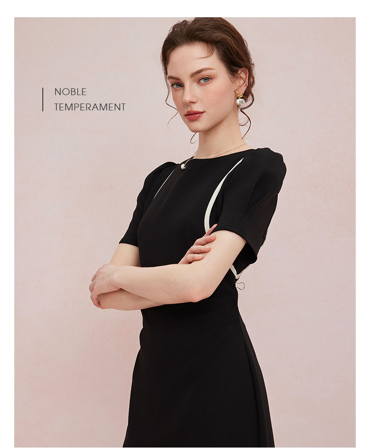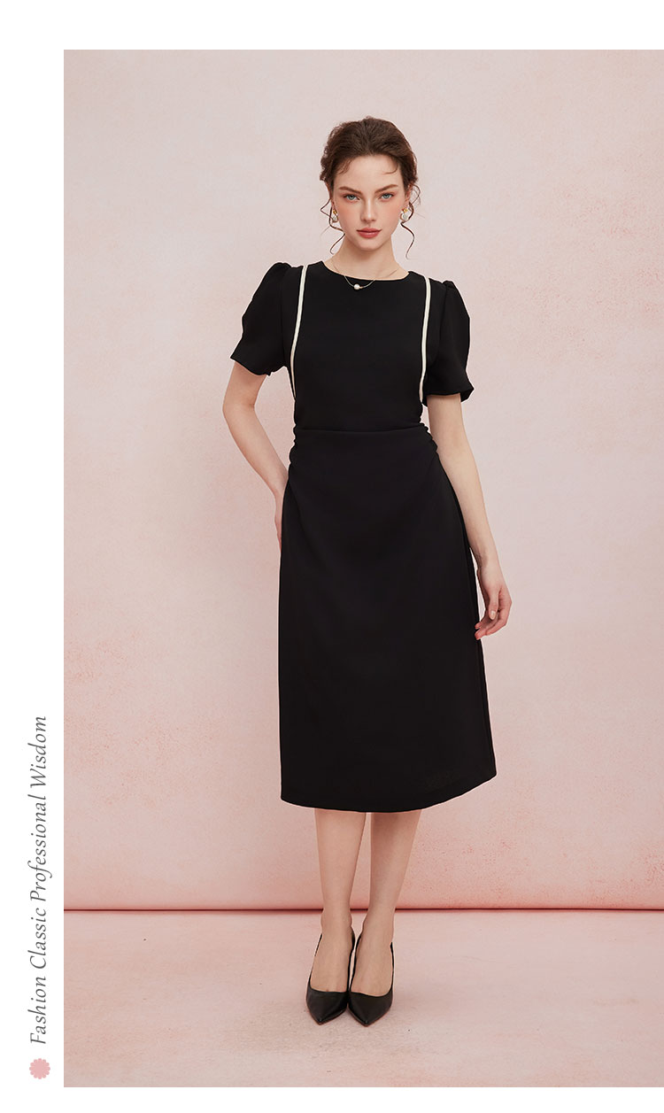 QF846斯尔丽25新款法式浪漫圆领撞色滚边显肩窄高级白领气质款连衣裙