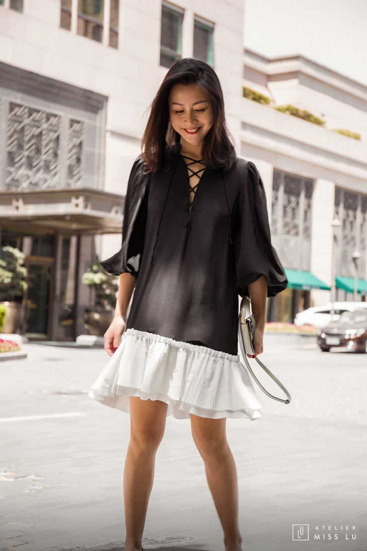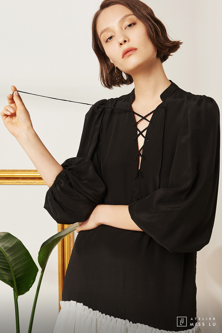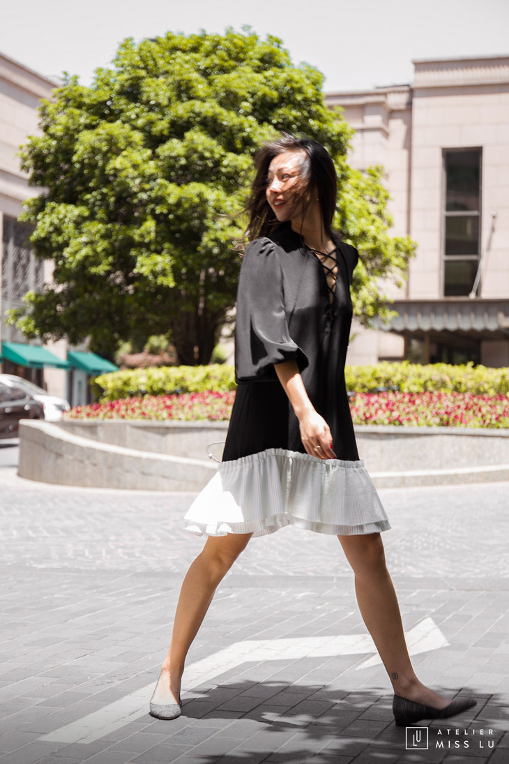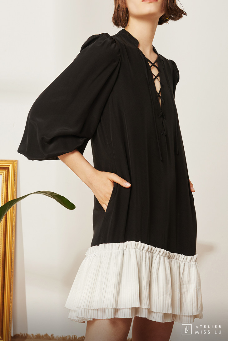 AtelierMissLu / Jeanne-黑色真丝系带百褶拼接连身裙
