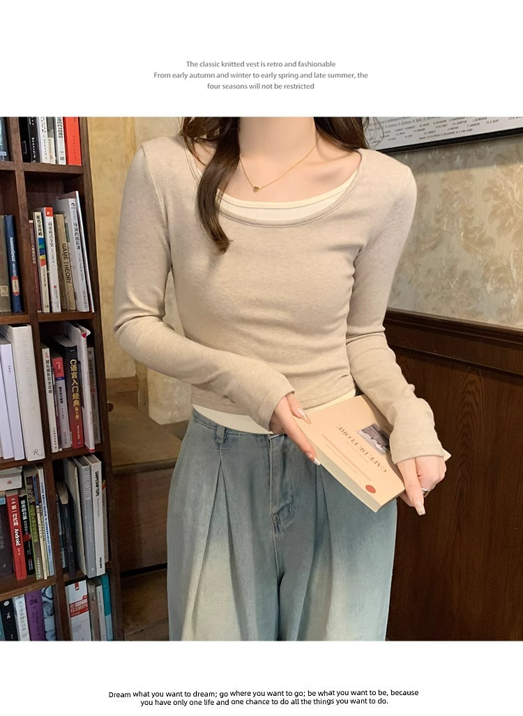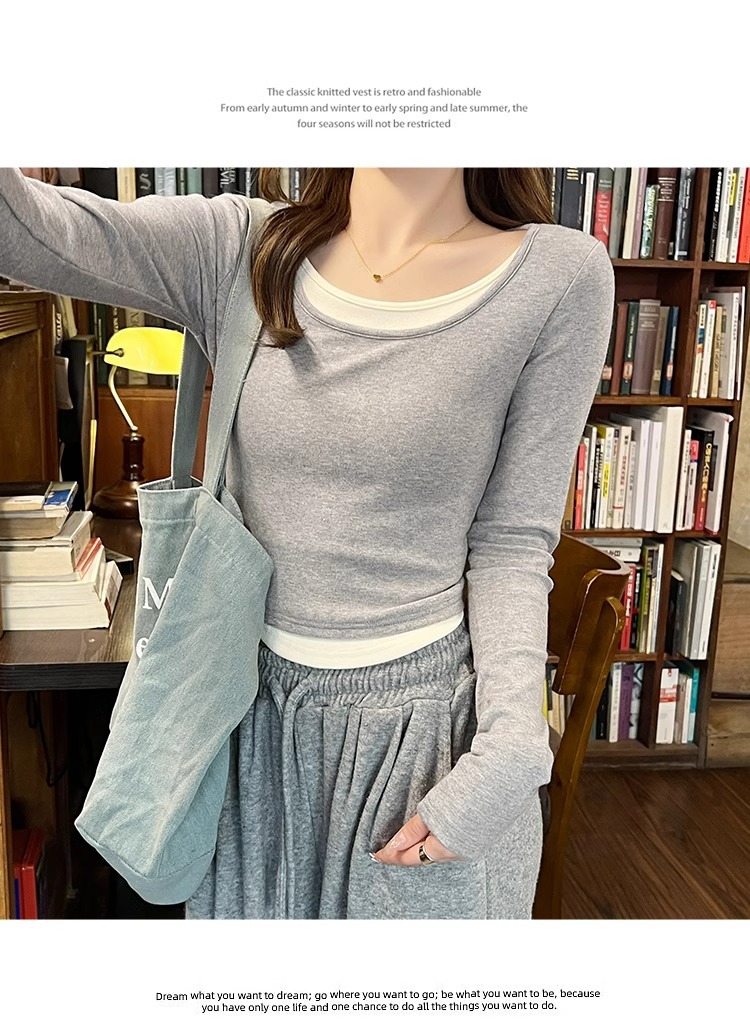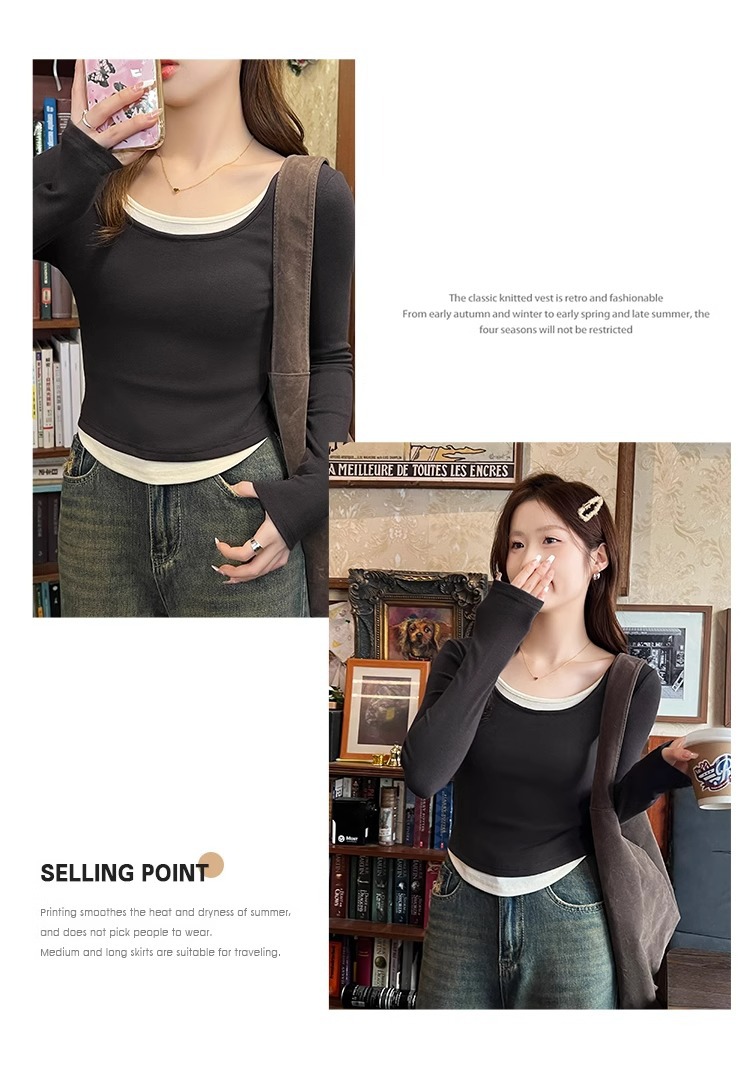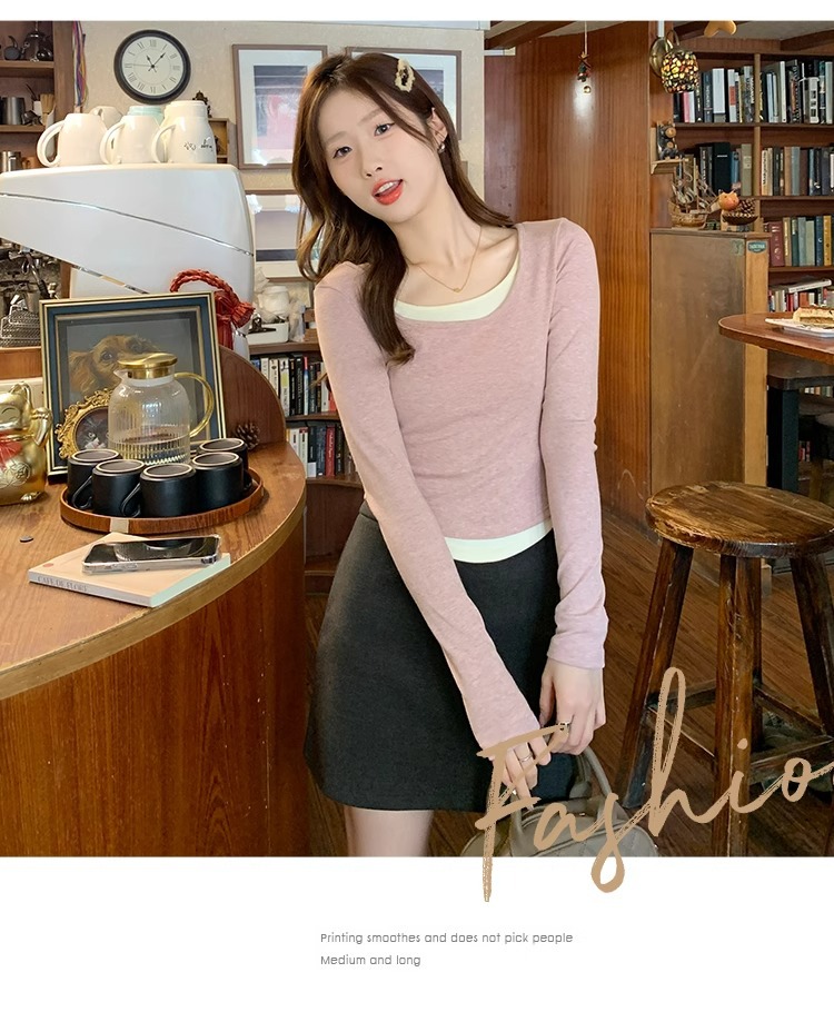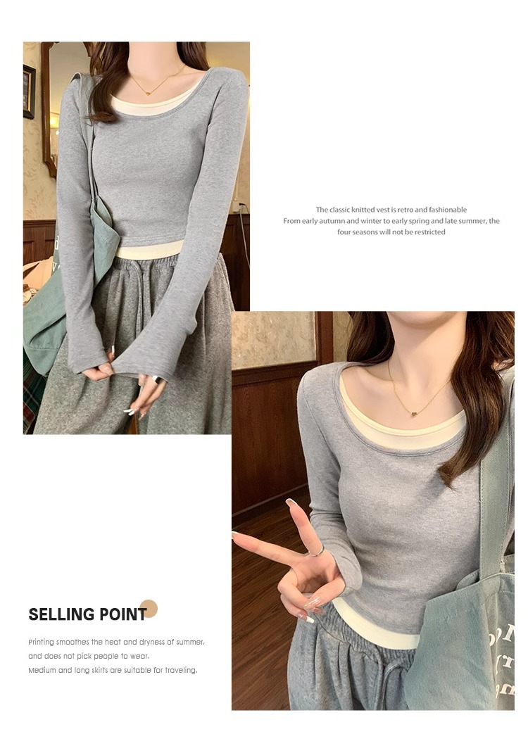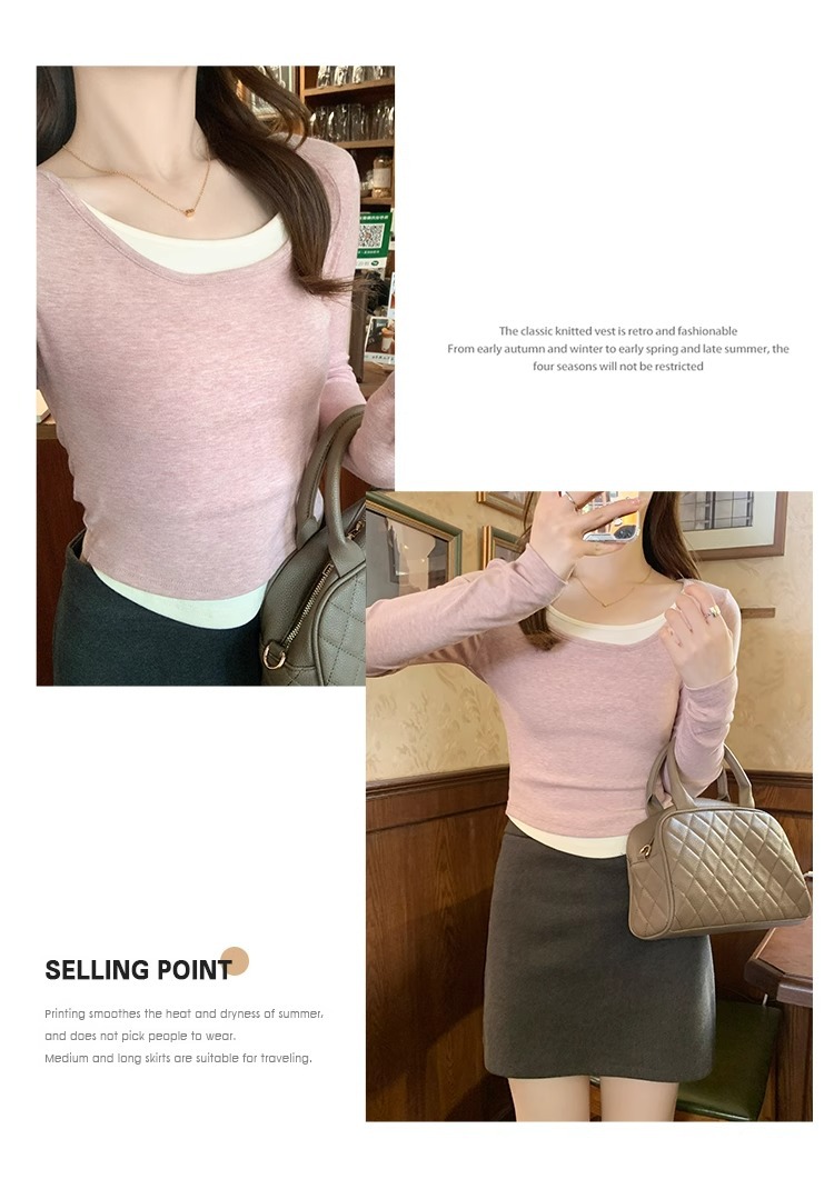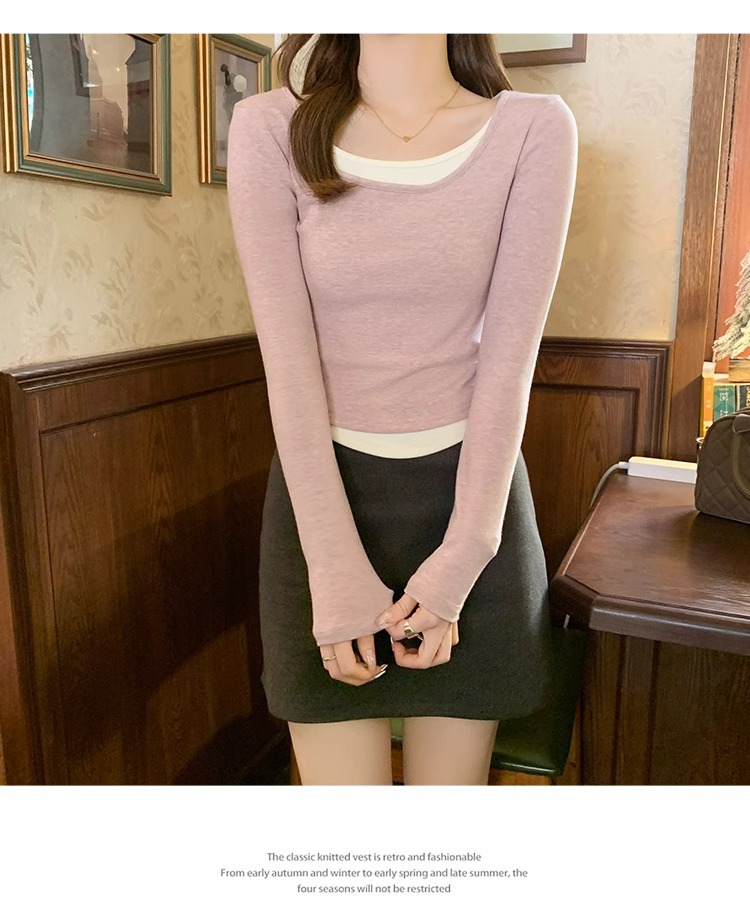 早春新款【粉色拼接假两件 长袖T恤女】纯欲风 撞色打底衫内搭 紧身上衣