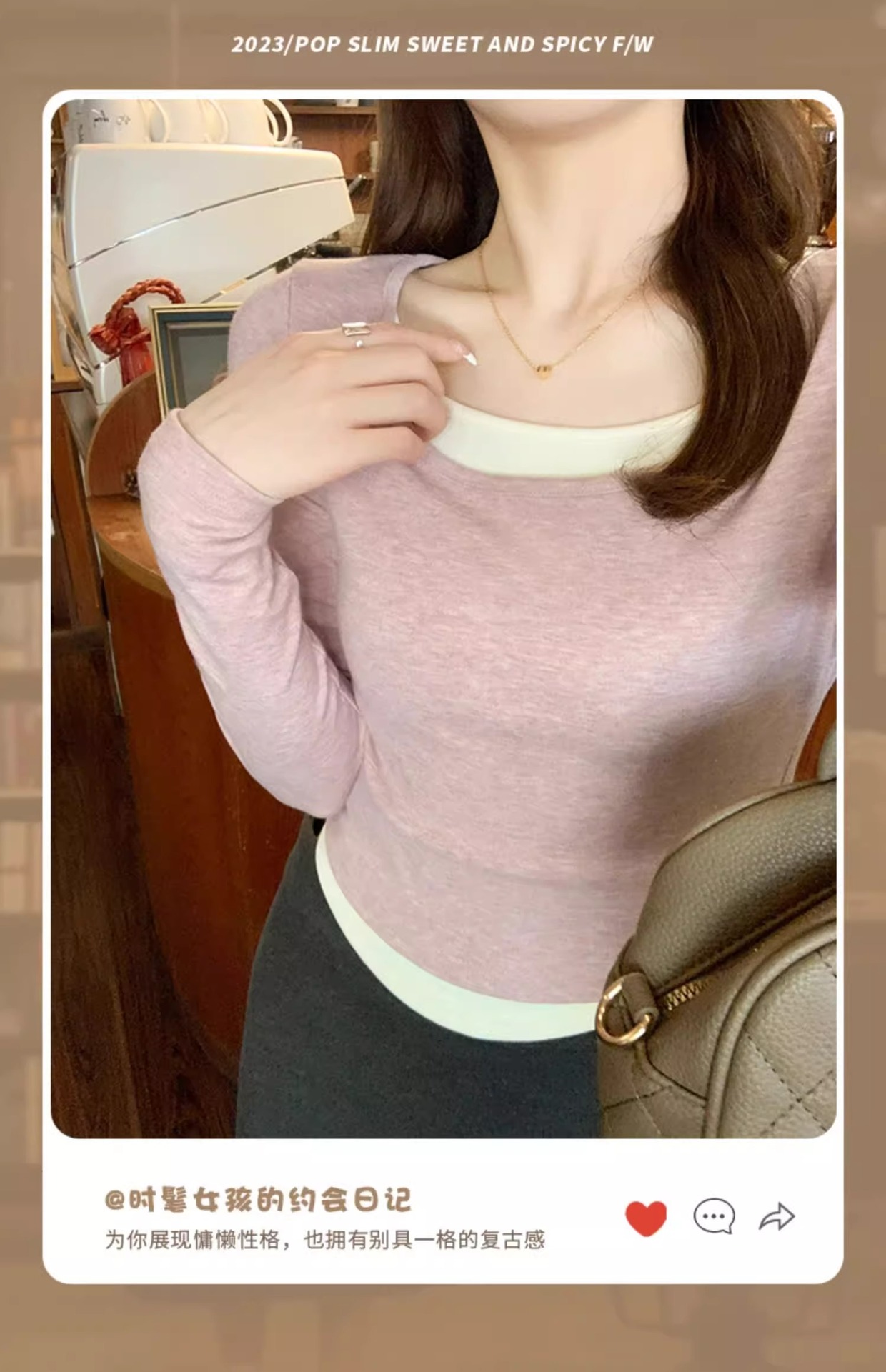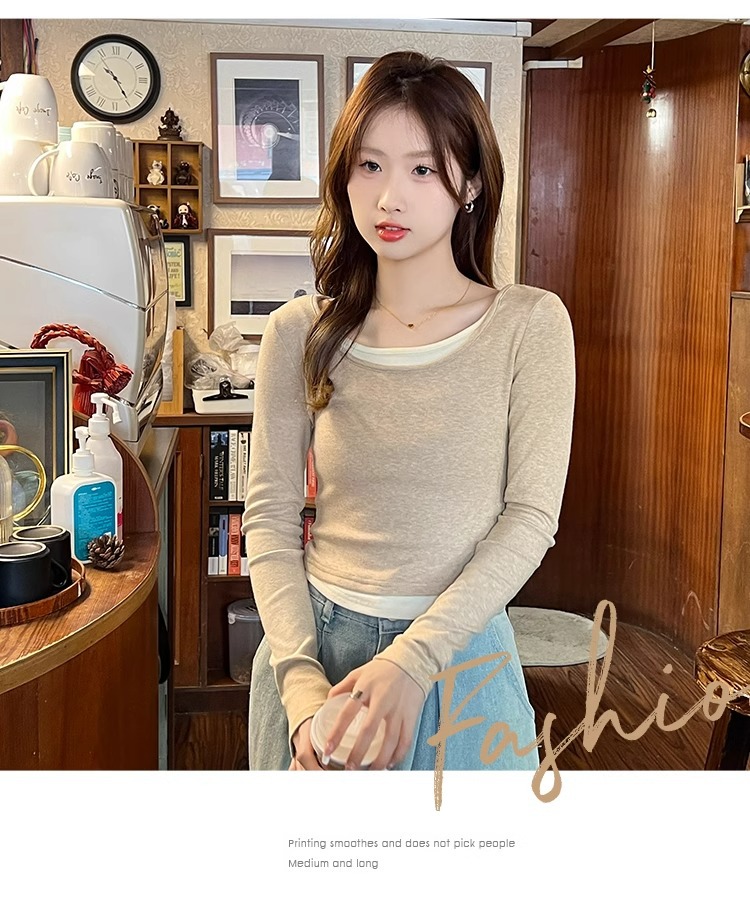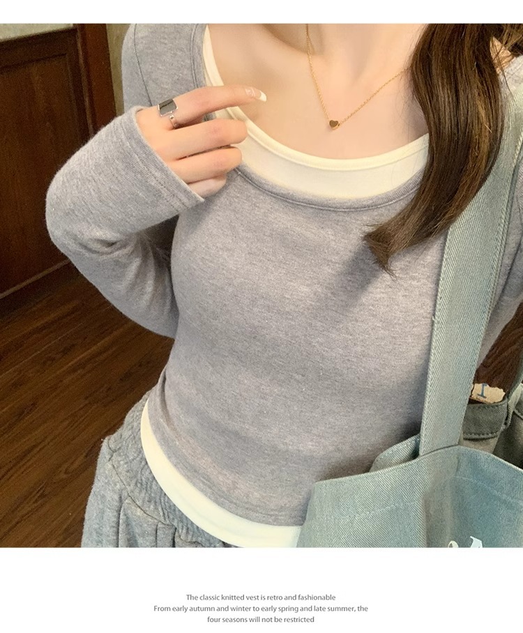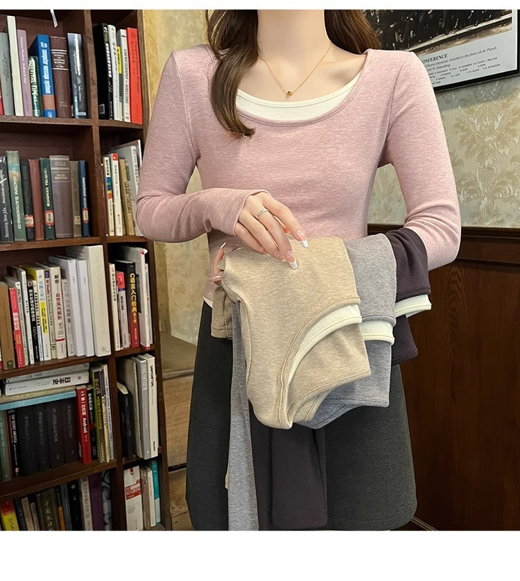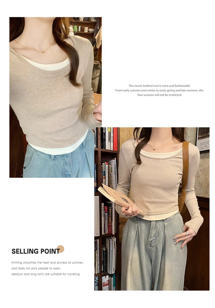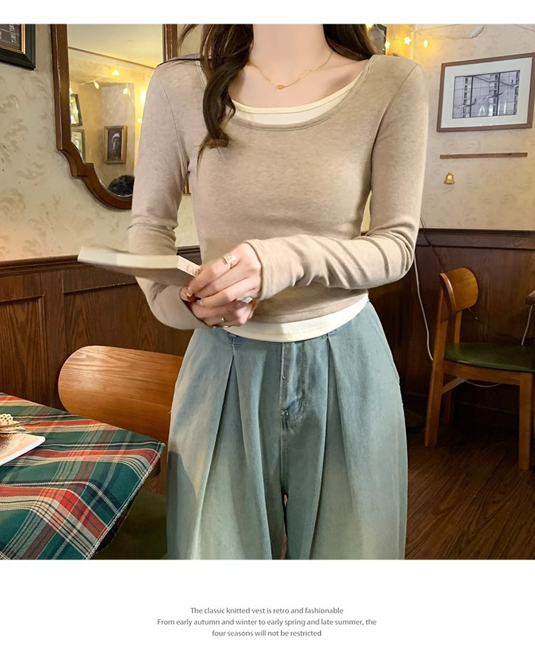 早春新款【粉色拼接假两件 长袖T恤女】纯欲风 撞色打底衫内搭 紧身上衣