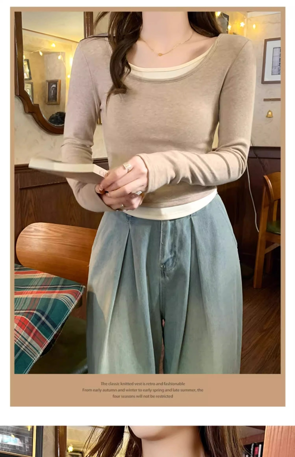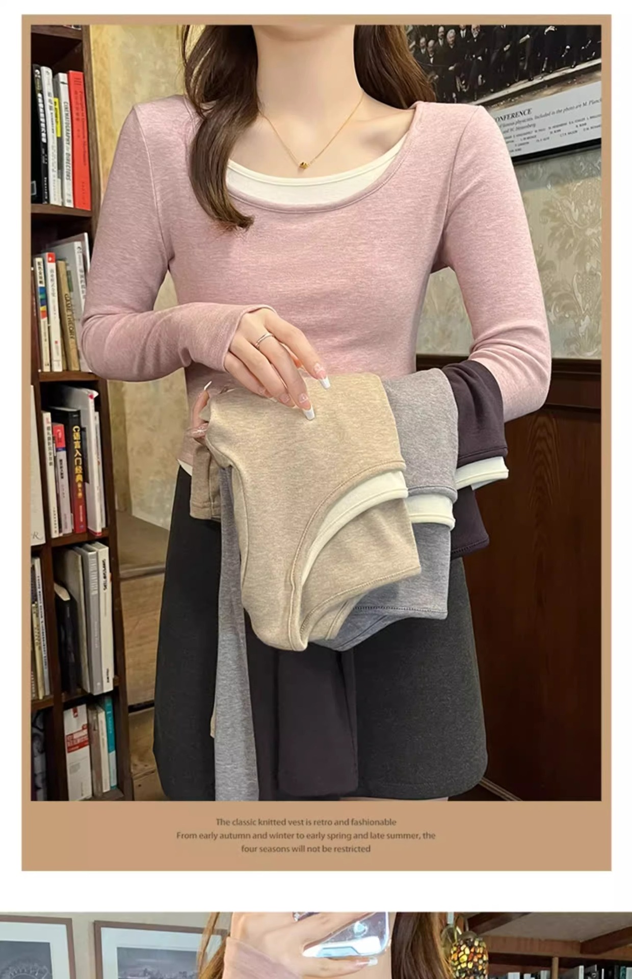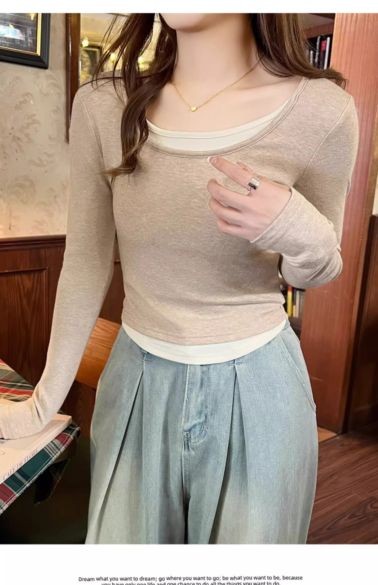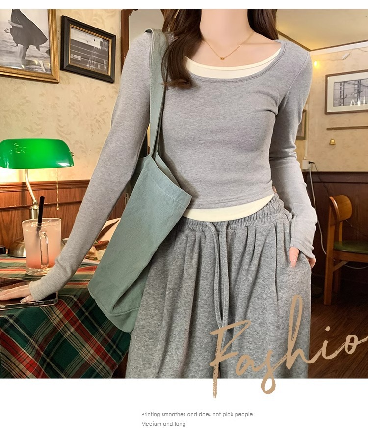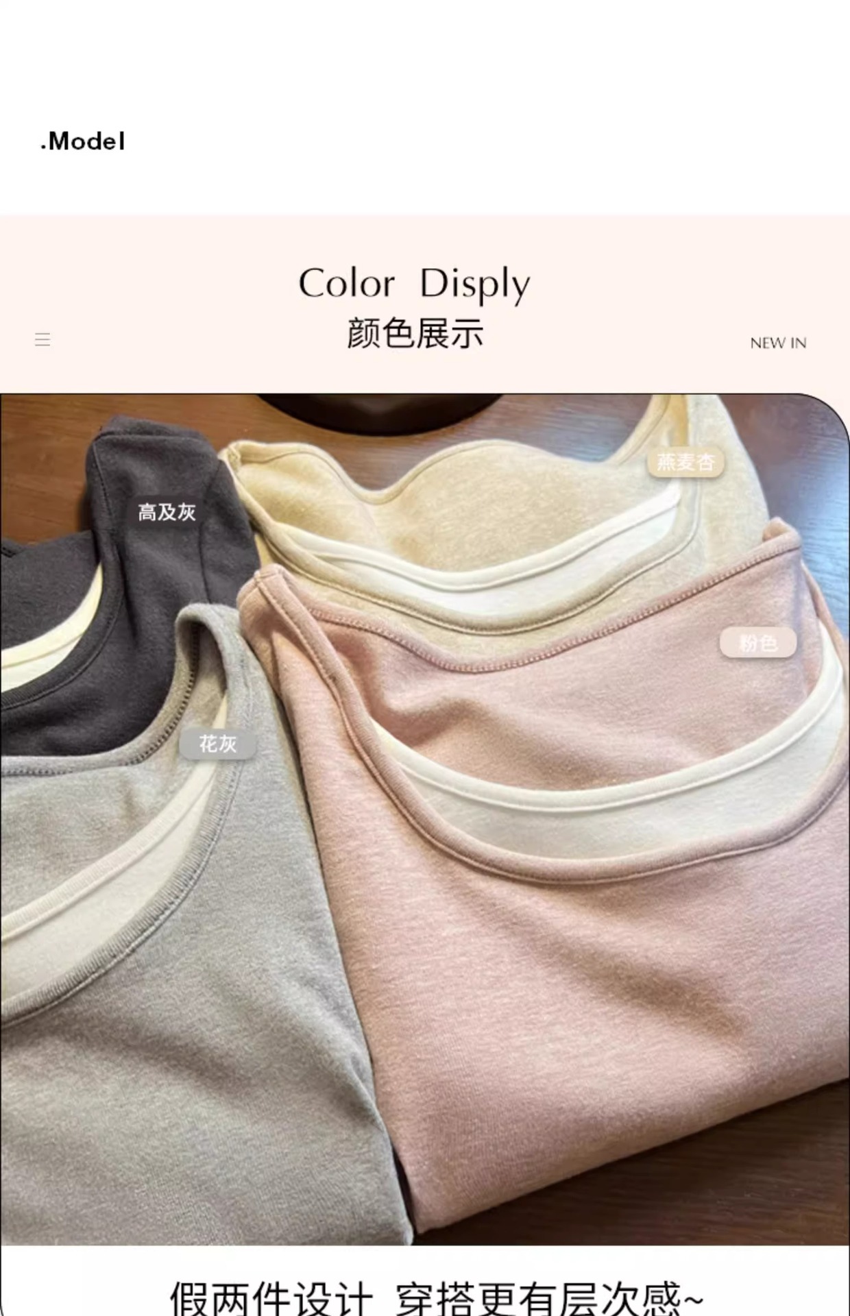 早春新款【粉色拼接假两件 长袖T恤女】纯欲风 撞色打底衫内搭 紧身上衣