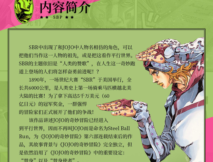 该作品讲述JOJO的奇妙冒险已经进入到平行世界,因而不再叫JOJO而是命名为Steel Ball Run。