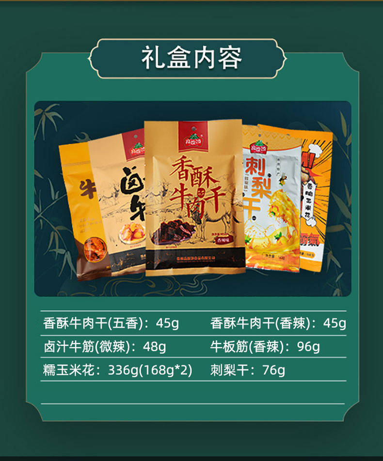 L特产大礼包 (内含:卤汁牛筋48g牛板筋96g香酥牛肉干(五香味)45g香酥牛肉干(香辣味)45g糯玉米花(奶油味)168g×2刺梨干76g)