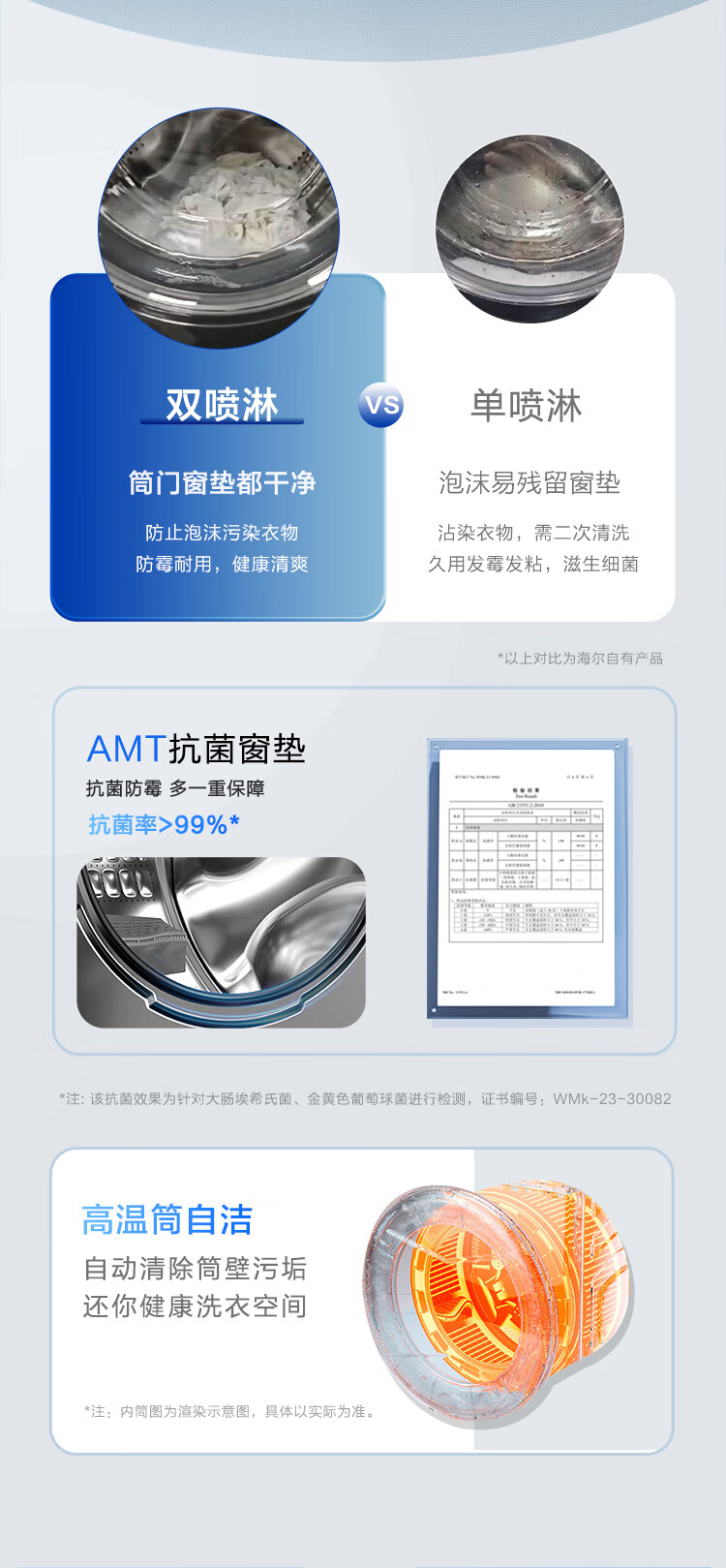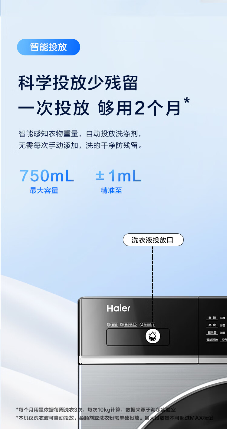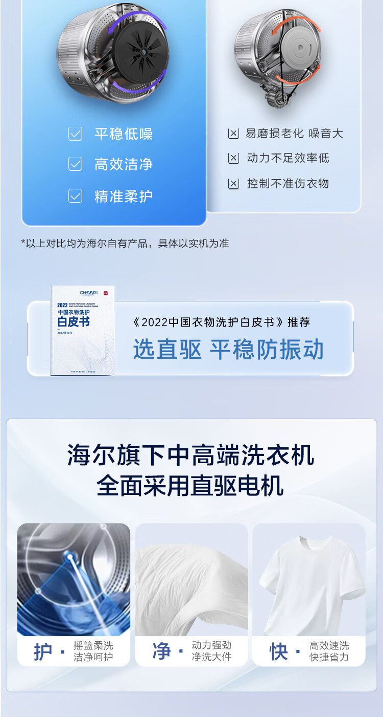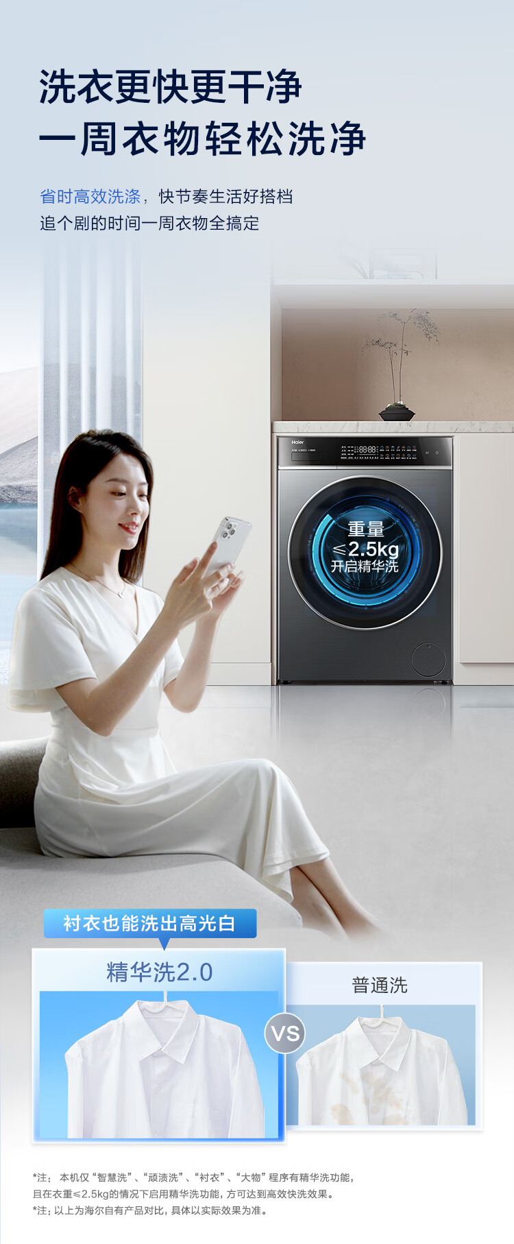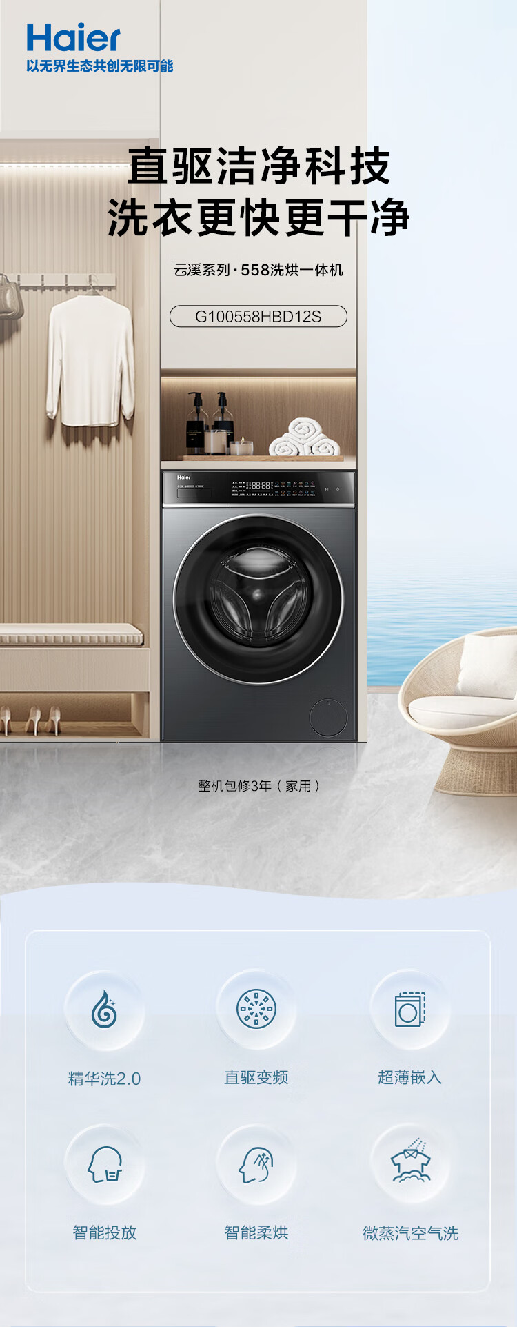 海尔(Haier)【云溪直驱精华洗2.0】滚筒洗衣机全自动 10公斤洗烘一体除菌螨G100558HBD12S 超薄家用 直驱精华洗+除菌螨+智投+1.1洗净比