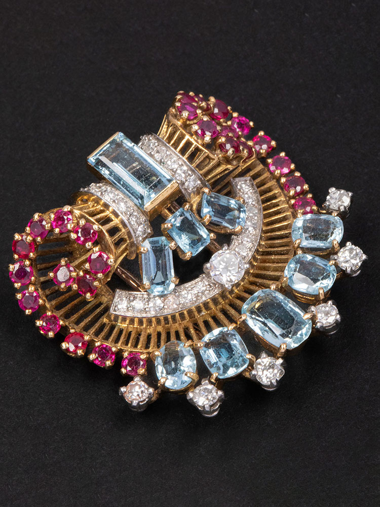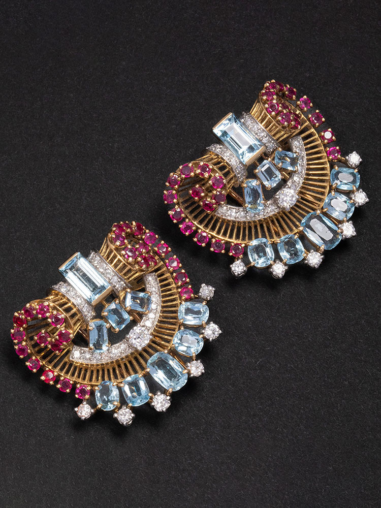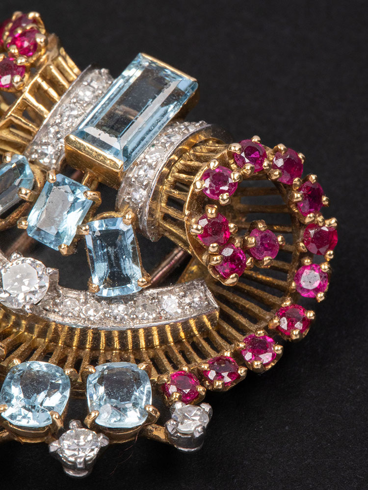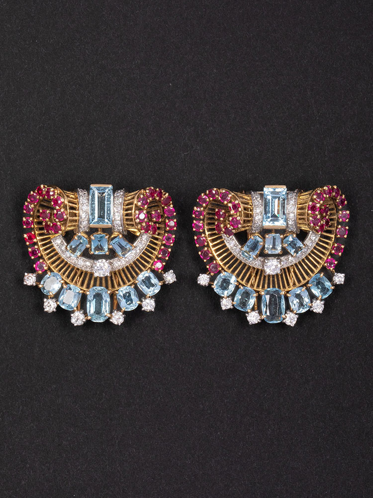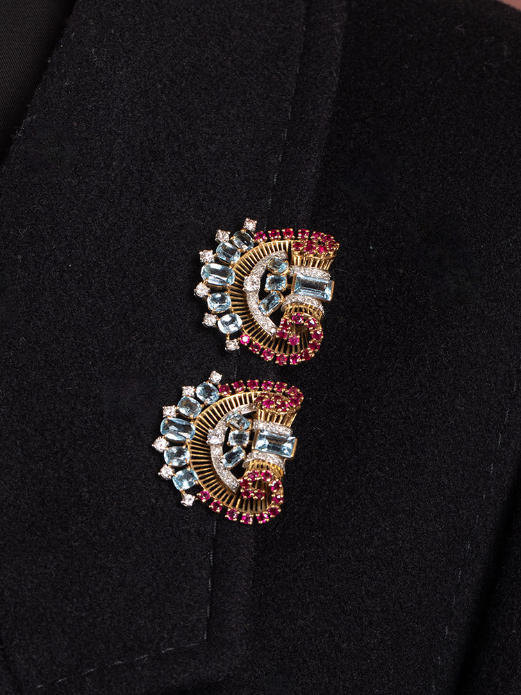 1940年代法国出品装饰艺术风格金银镶嵌钻石海蓝宝红宝石胸针一对