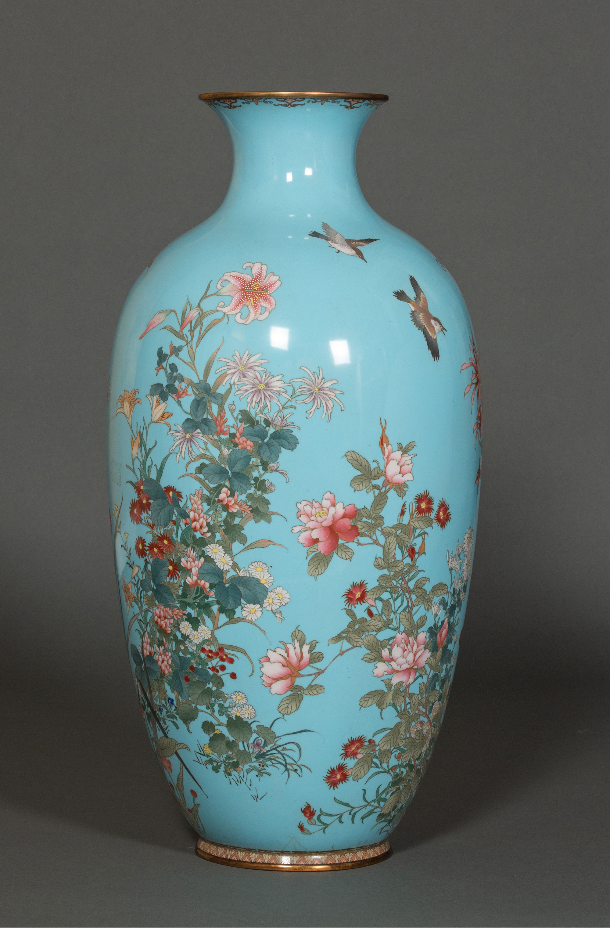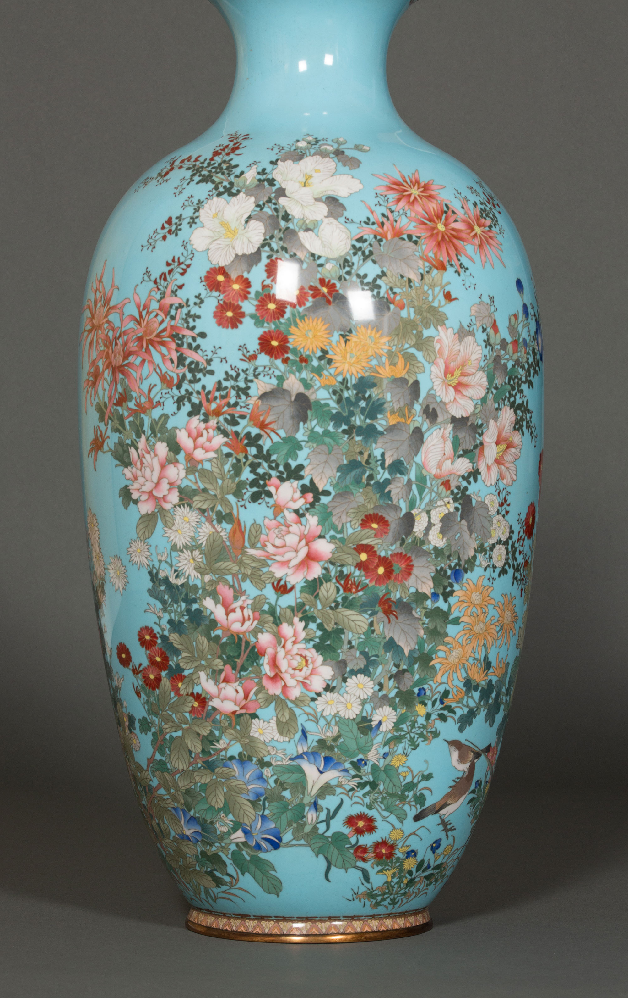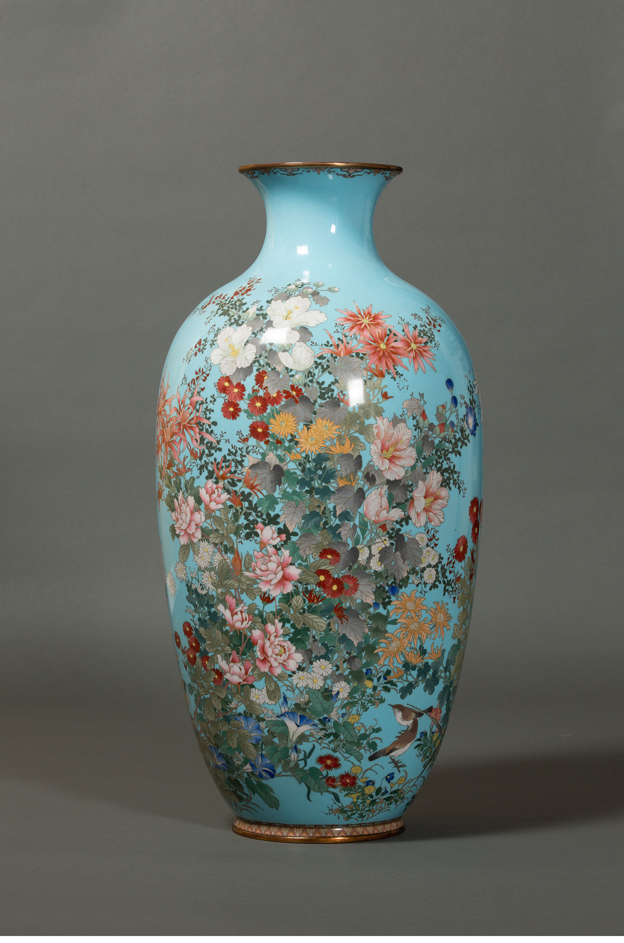19世纪日本明治时期出品百卉珍禽主题蓝地七宝烧花瓶