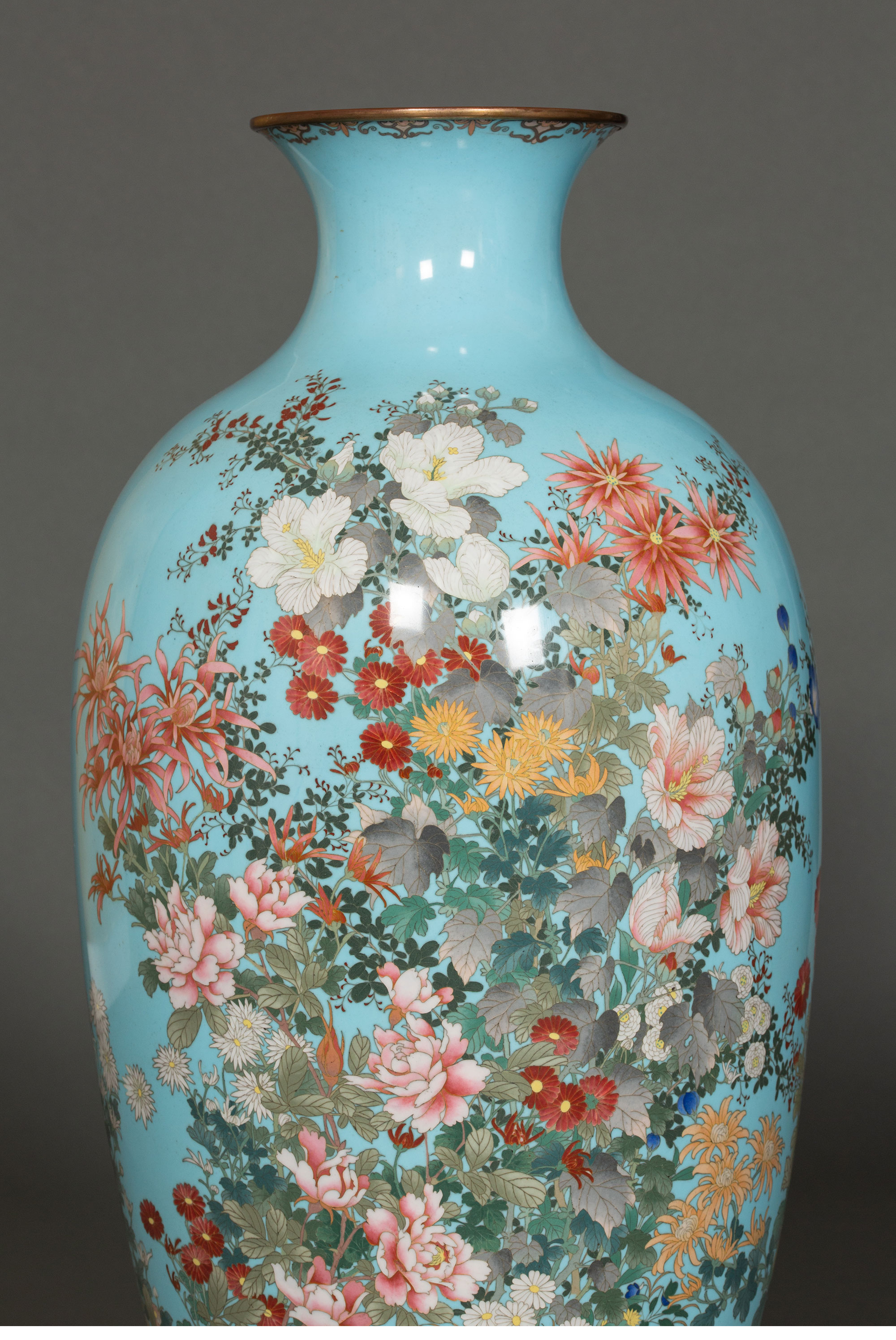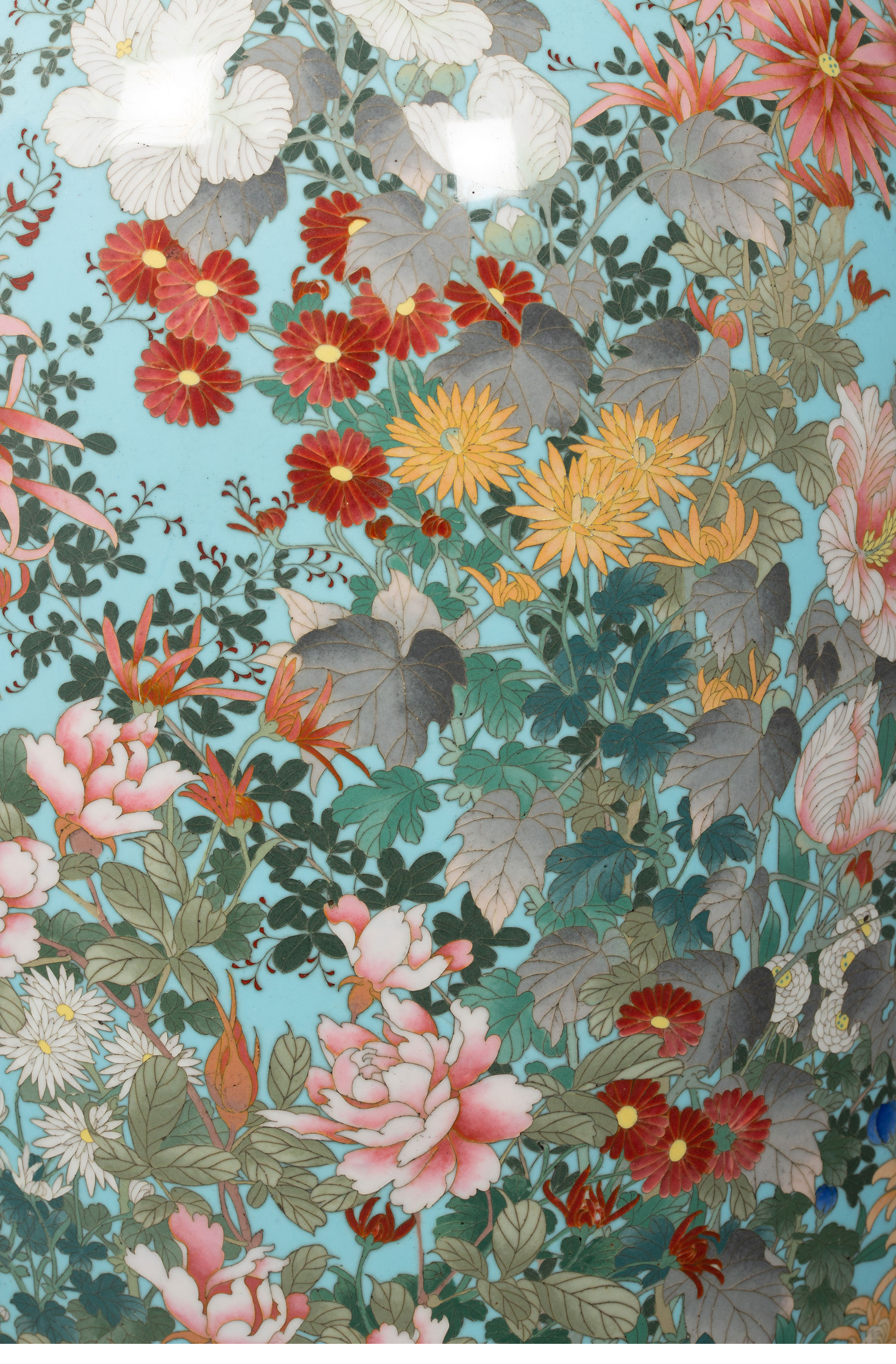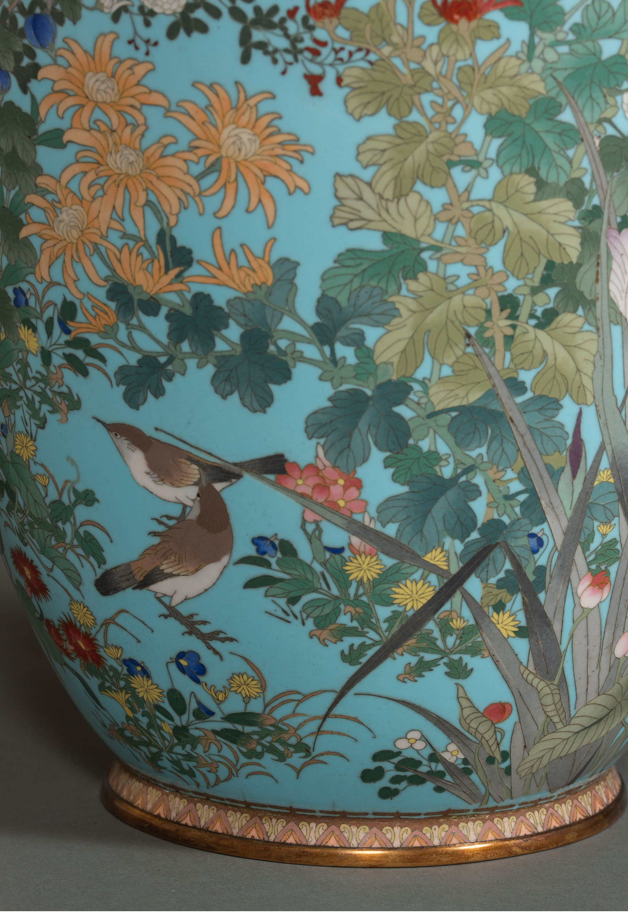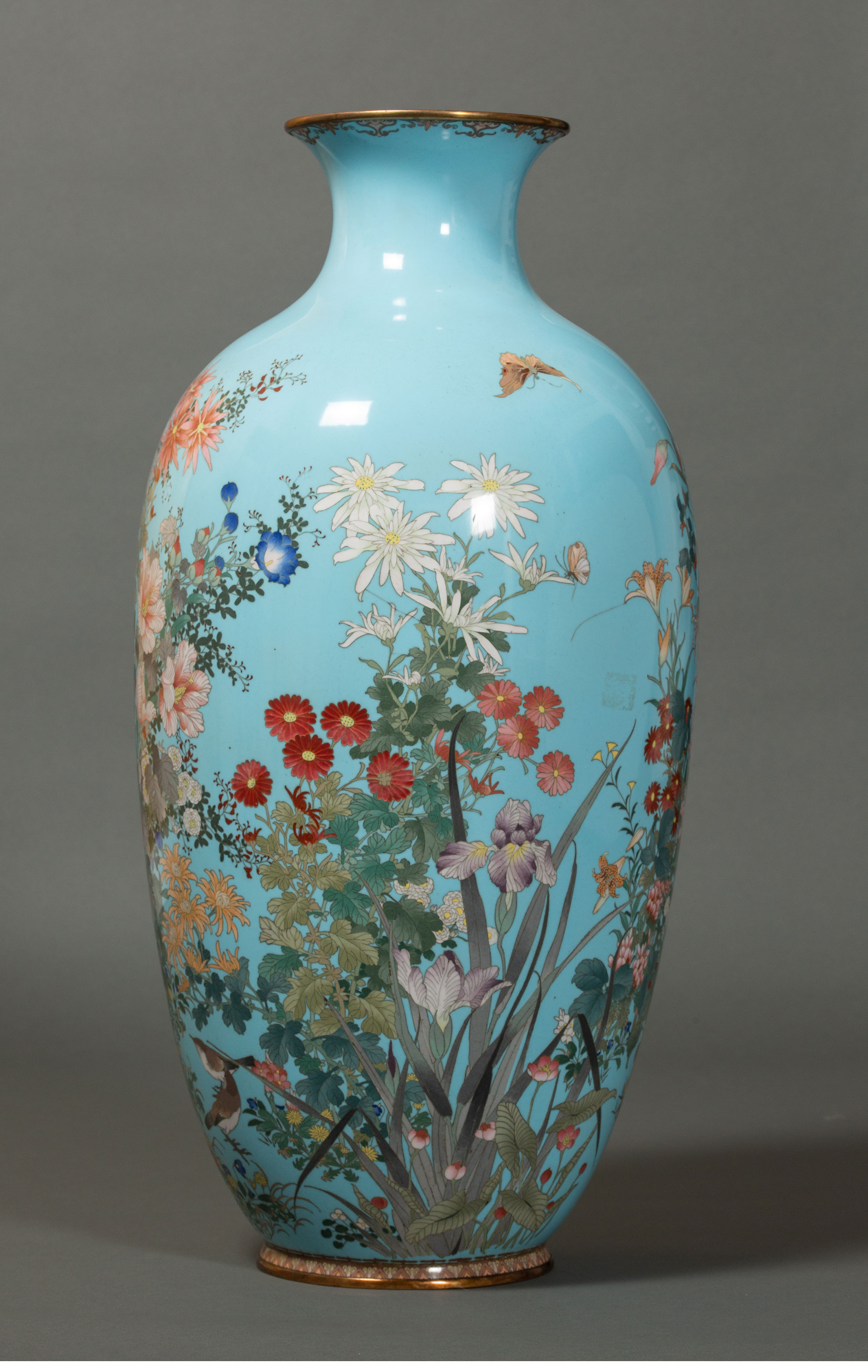 19世纪日本明治时期出品百卉珍禽主题蓝地七宝烧花瓶